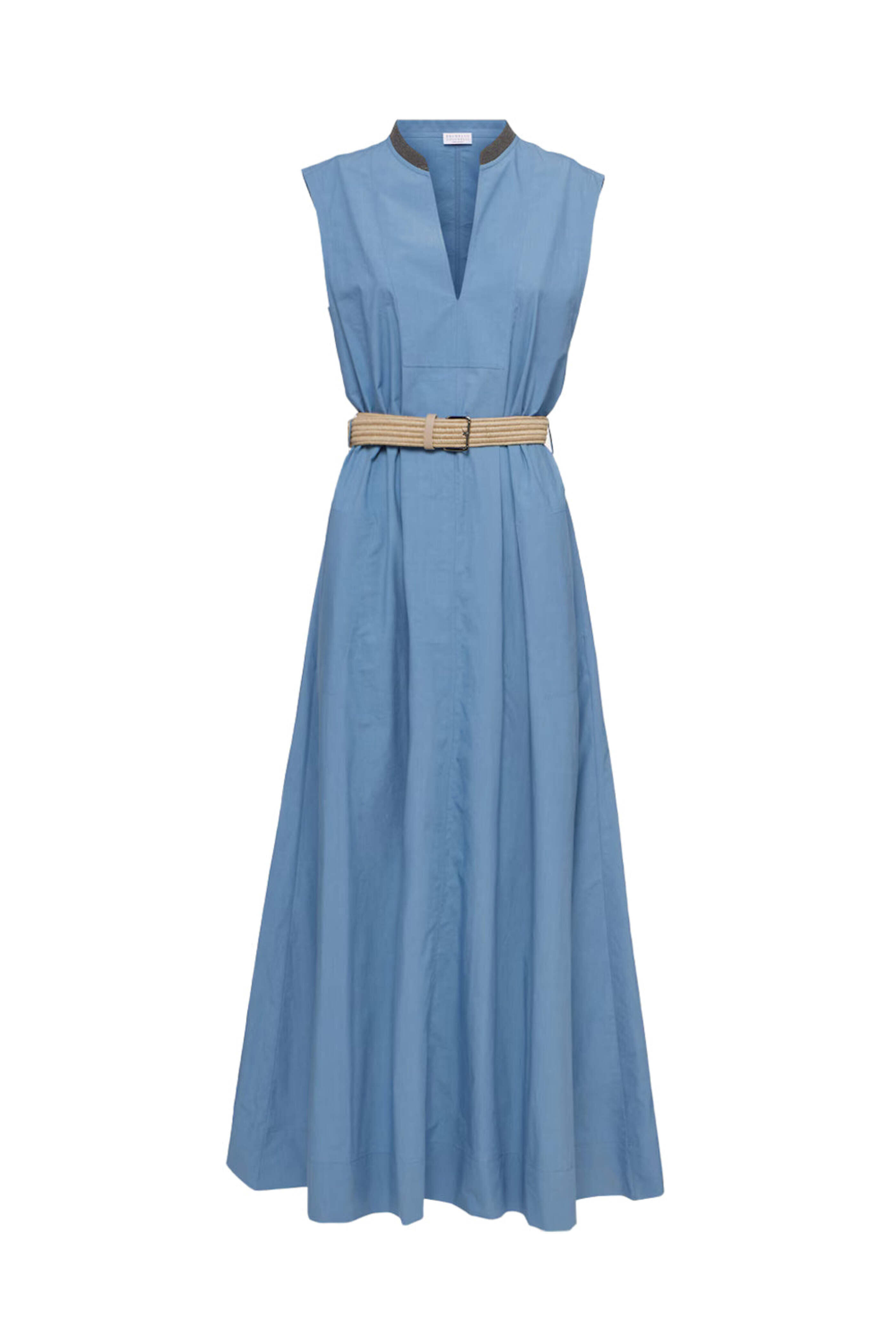 Brunello Cucinelli Artic Blue Monili Collar Belted Midi Dress. Split v neck; monili detail. Sleeveless. Removable buckle belt; woven fabrication. Relaxed fit. Aline skirt. Midi to maxi length. Made in Italy. 100% cotton.