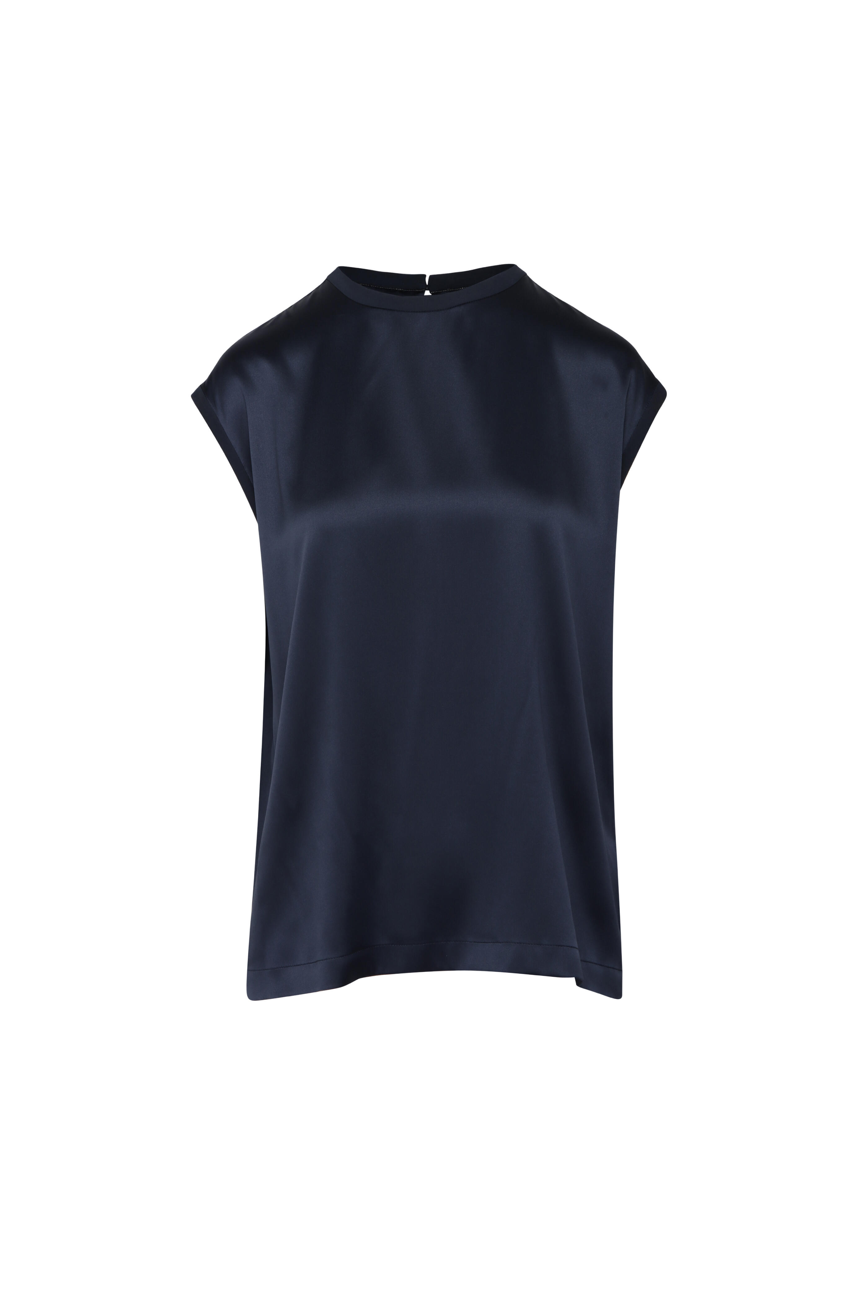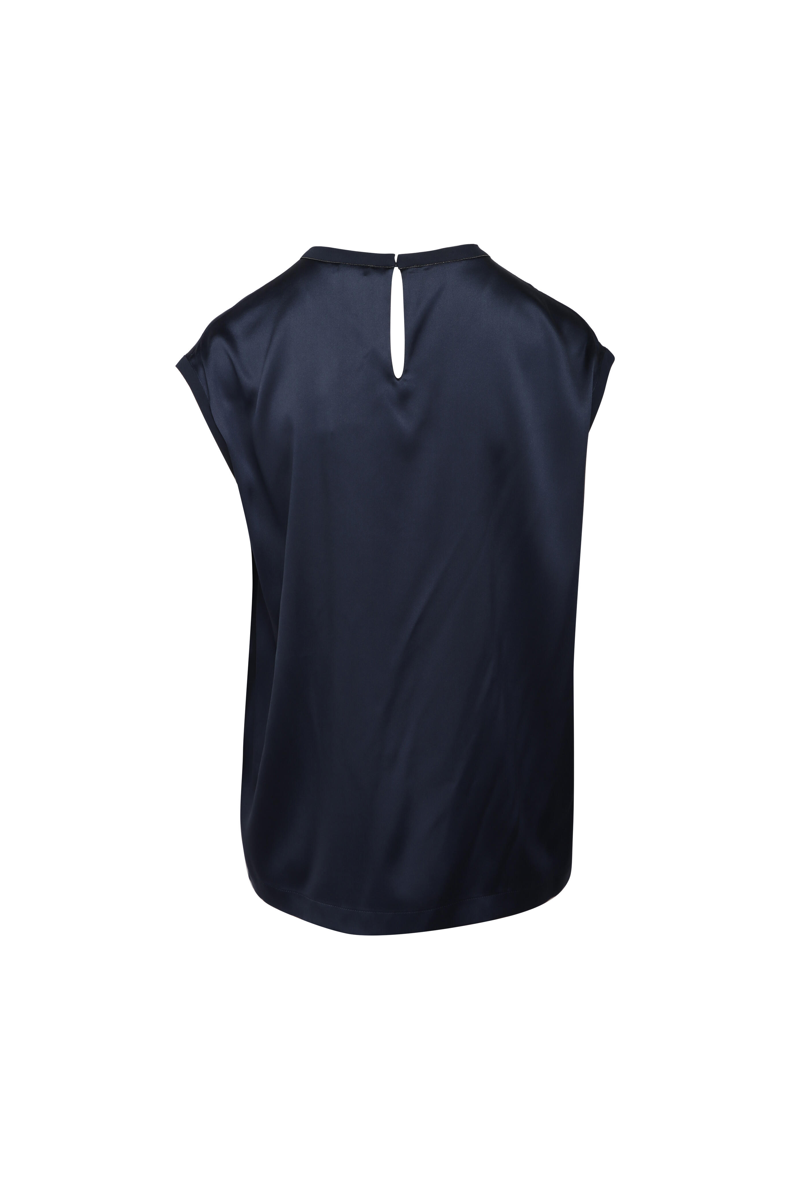 Crewneck. Back button closure; keyhole detail. Short cap sleeves. Relaxed fit. Straight hem. Made in Italy. 96% silk, 4% elastane. Dry clean.