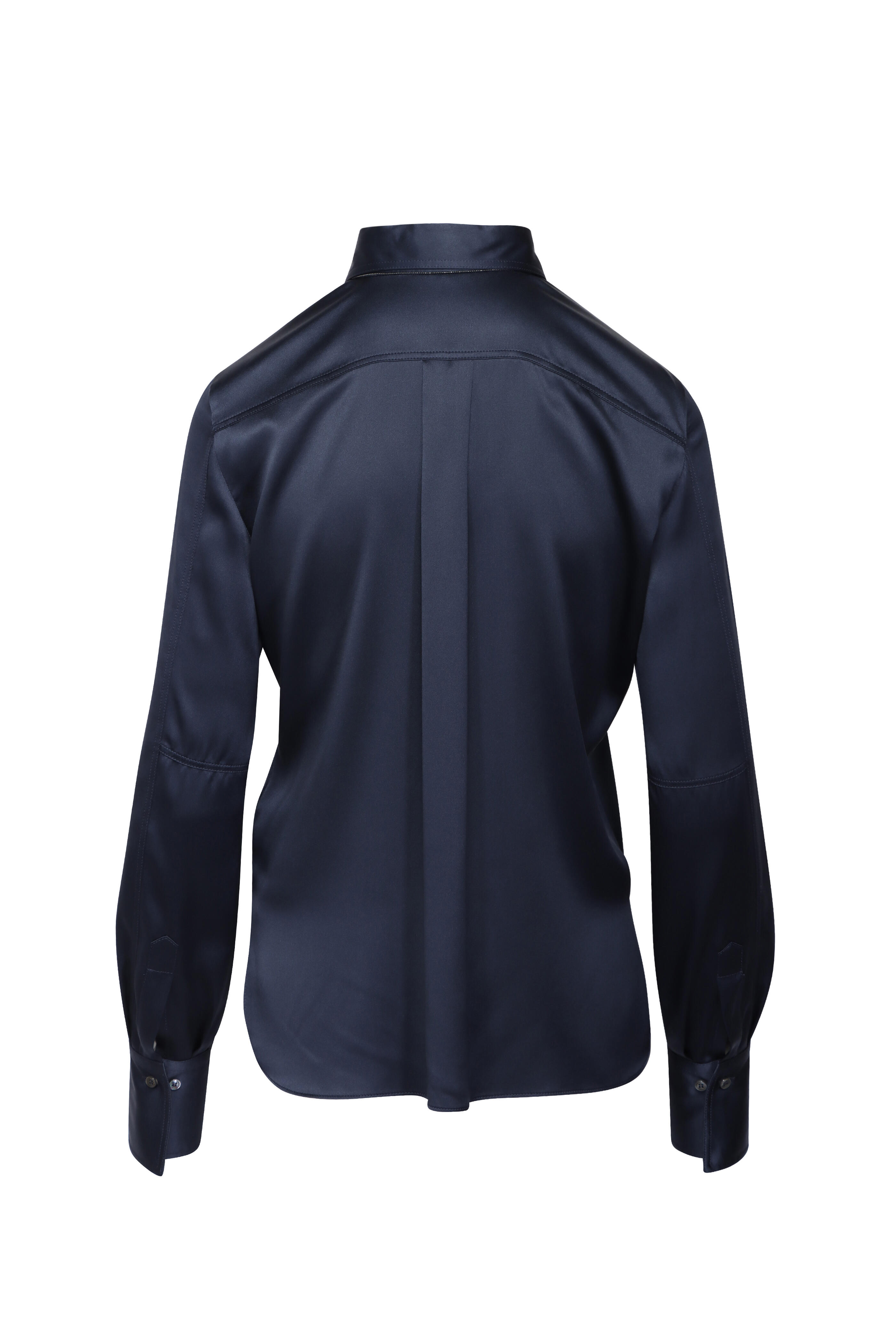 Collar. Long sleeves; button cuffs. Concealed front button closure. Bib yoke. Relaxed fit. Rounded hem. Made in Italy. 96% silk, 4% elastane. Dry clean.