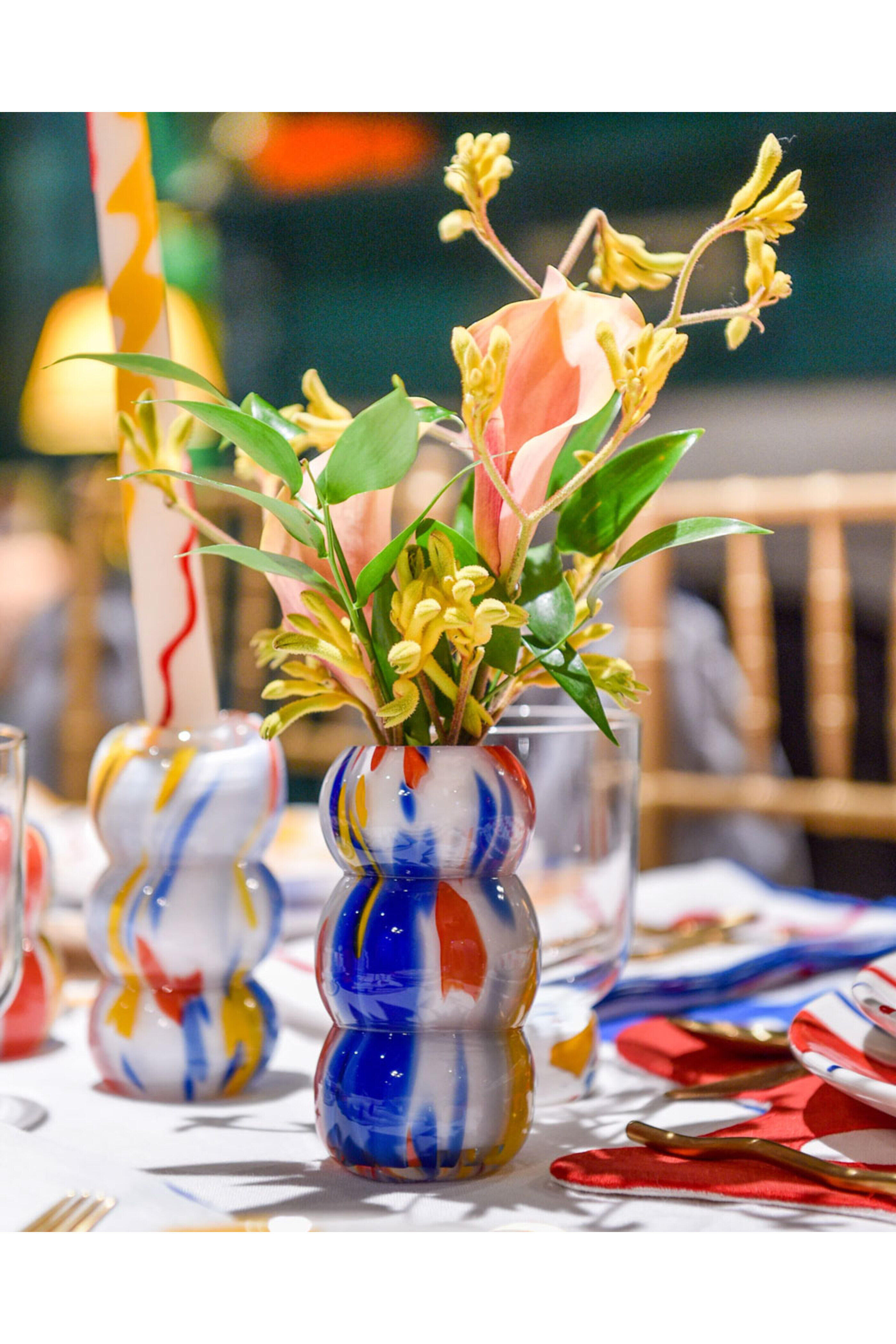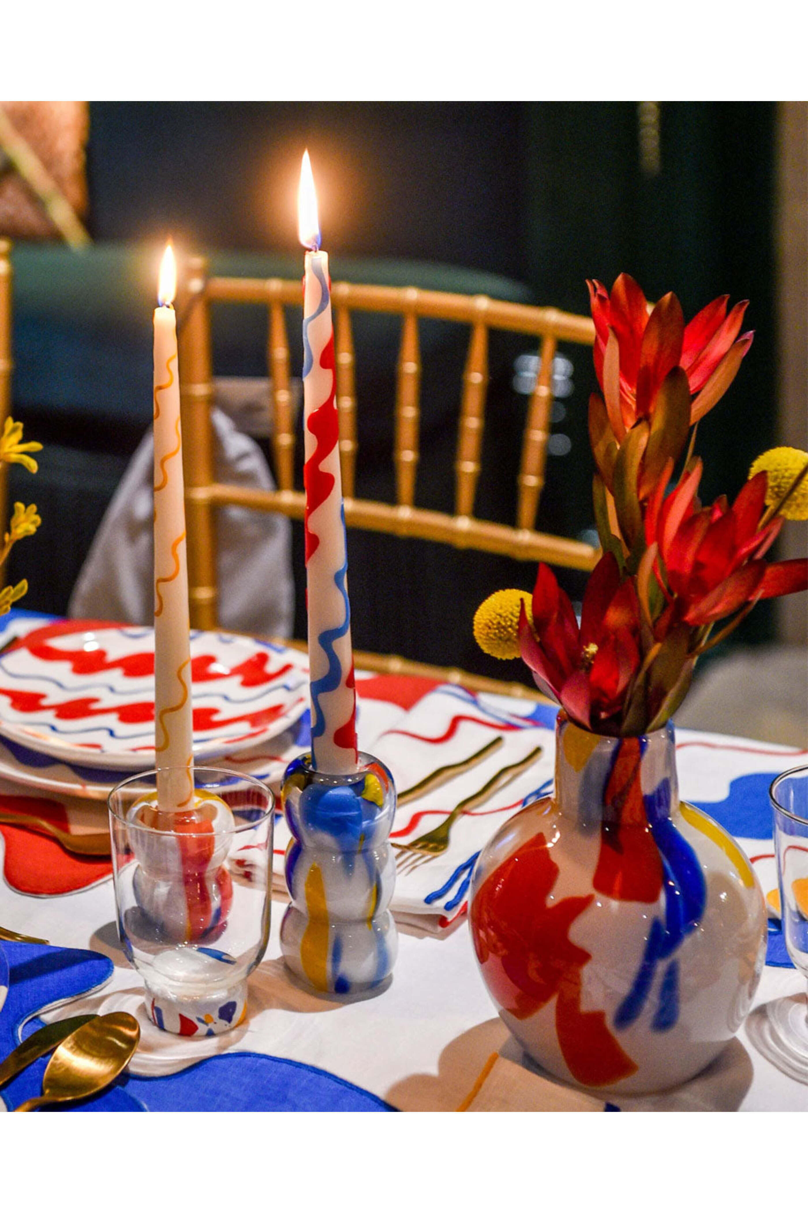 Misette Medium Primary Confetti Glass Candleholder. Handblown glass. Each piece is unique. Primary multicolor confetti design. 2.5"D x 3.5"H. Sold individually. Candlesticks not included. . Made in Brooklyn, New York.