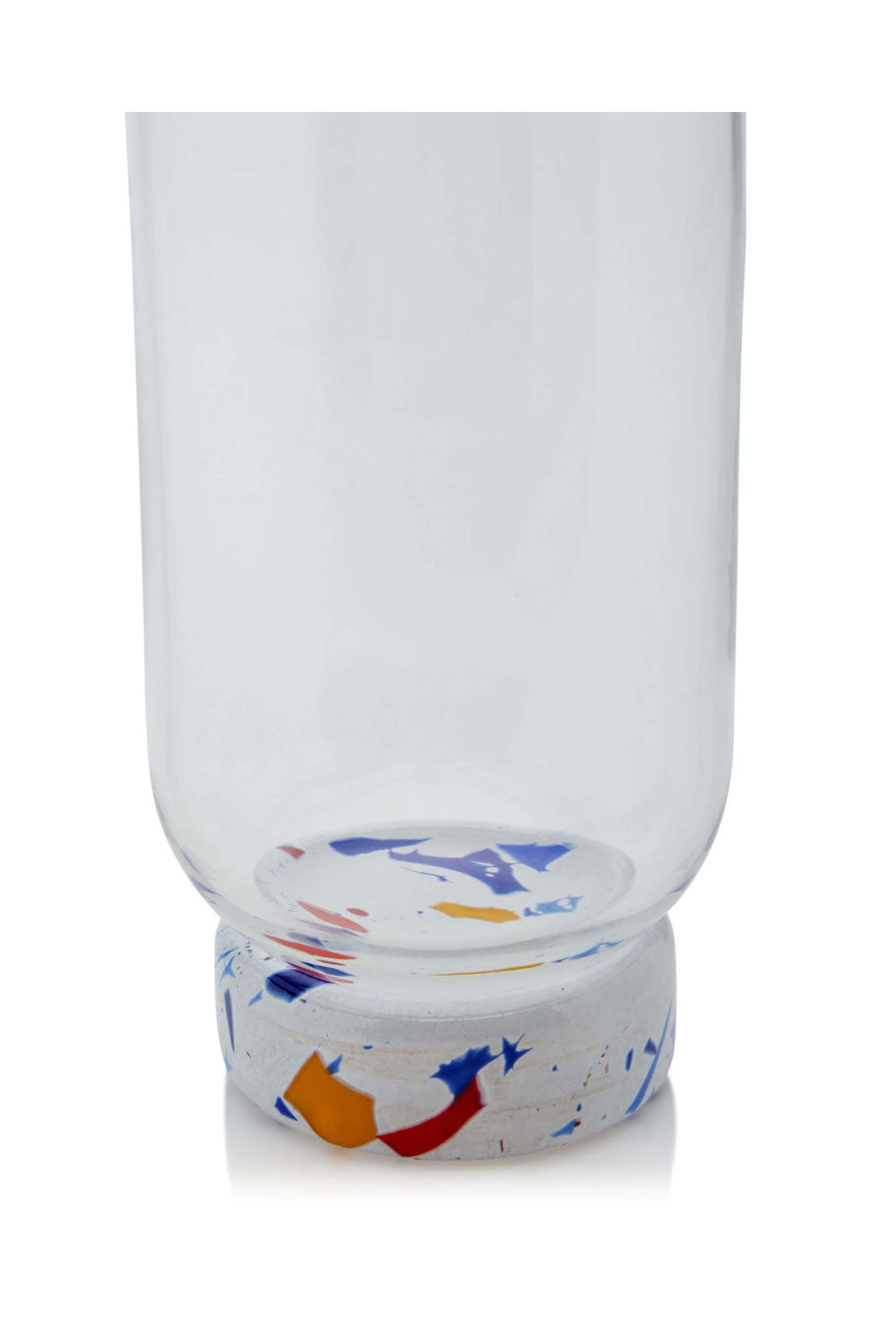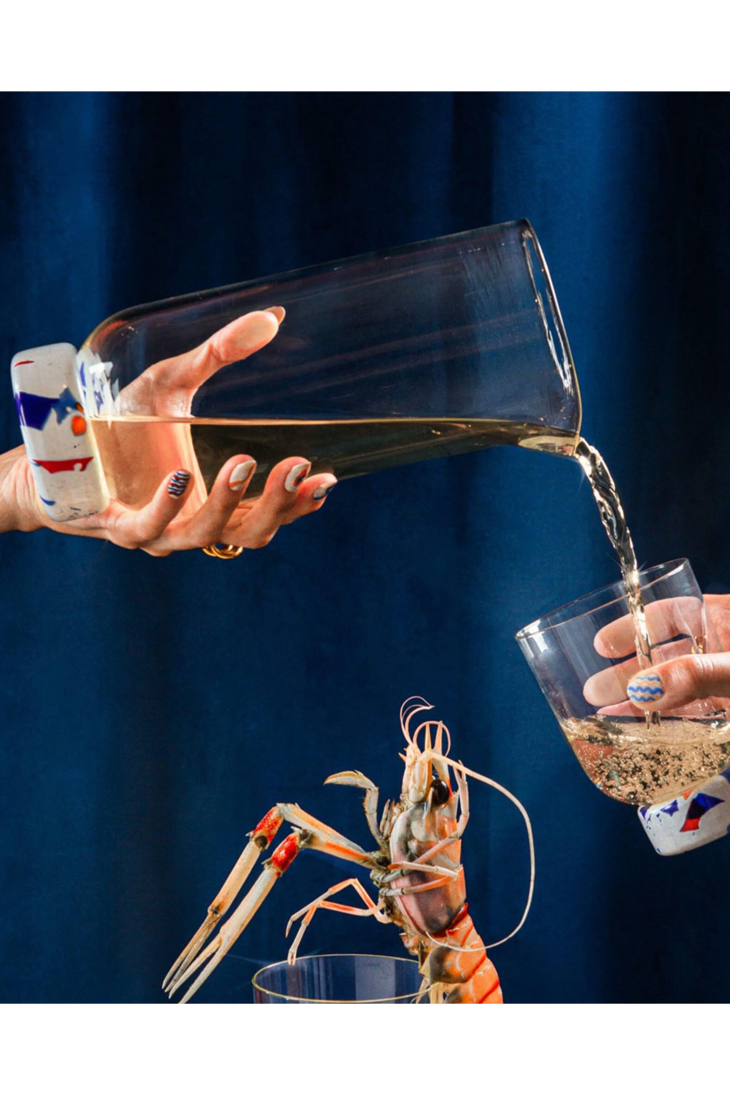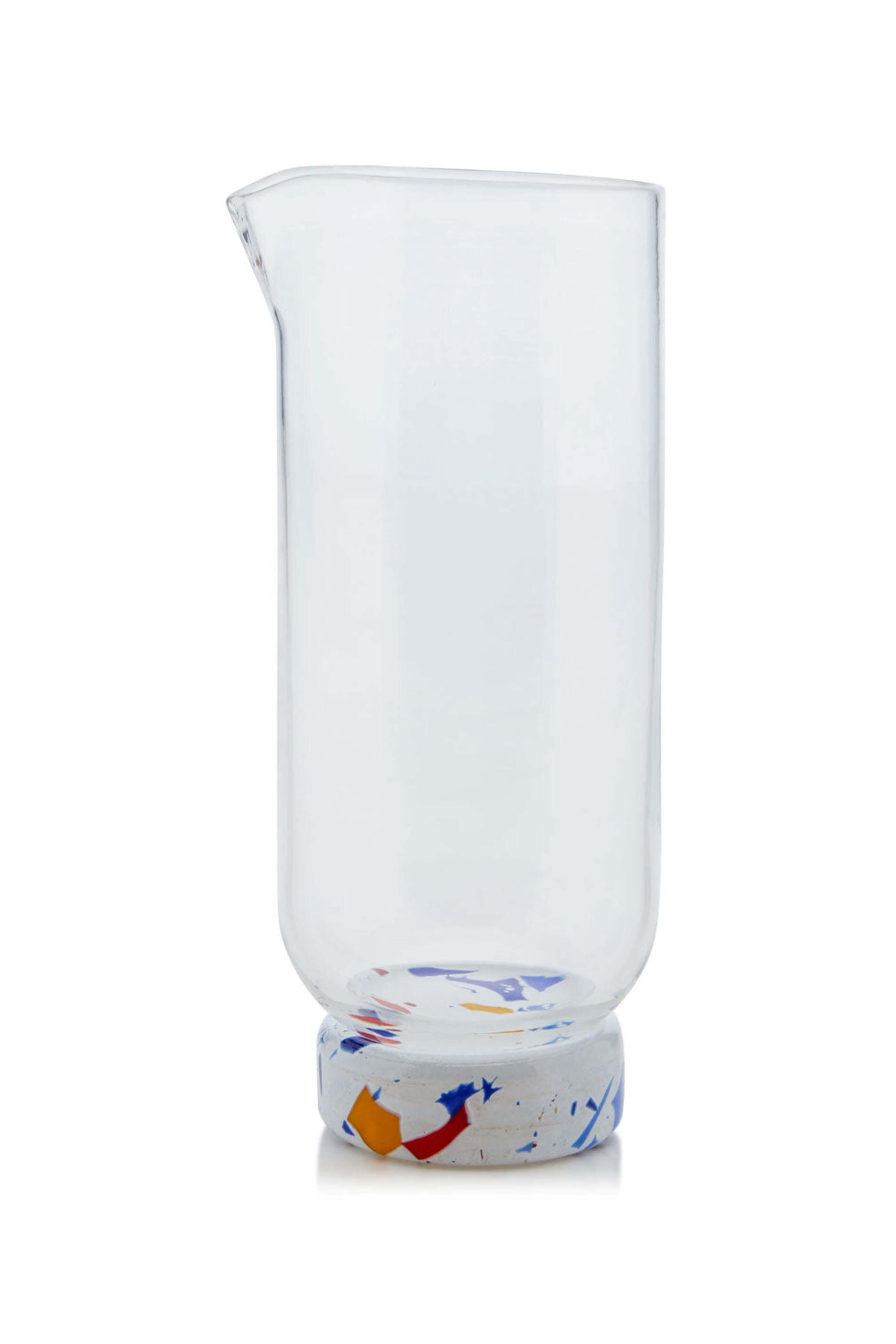 Misette Primary Confetti Glass Pitcher. Handblown glass. Each piece is unique. Primary multicolor confetti design. 75" D x 9.5" H. Made in Brooklyn, New York.
