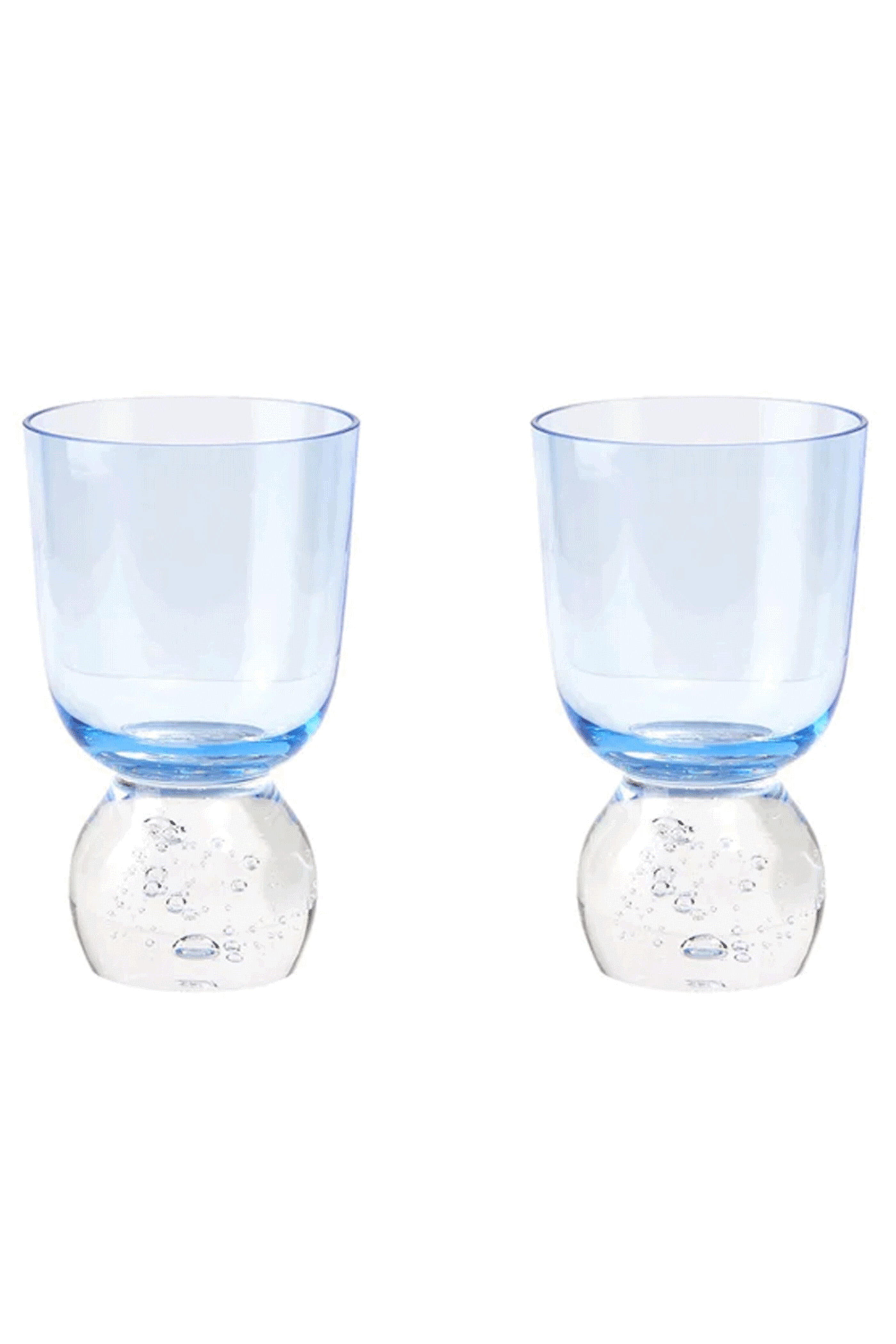 Misette Candy Blue Bubble Glass Tumbler. Set of two. Handblown glass; each piece is unique. Color: Candy blue. Size: 3.25" D x 5.5" H. Made in Poland.