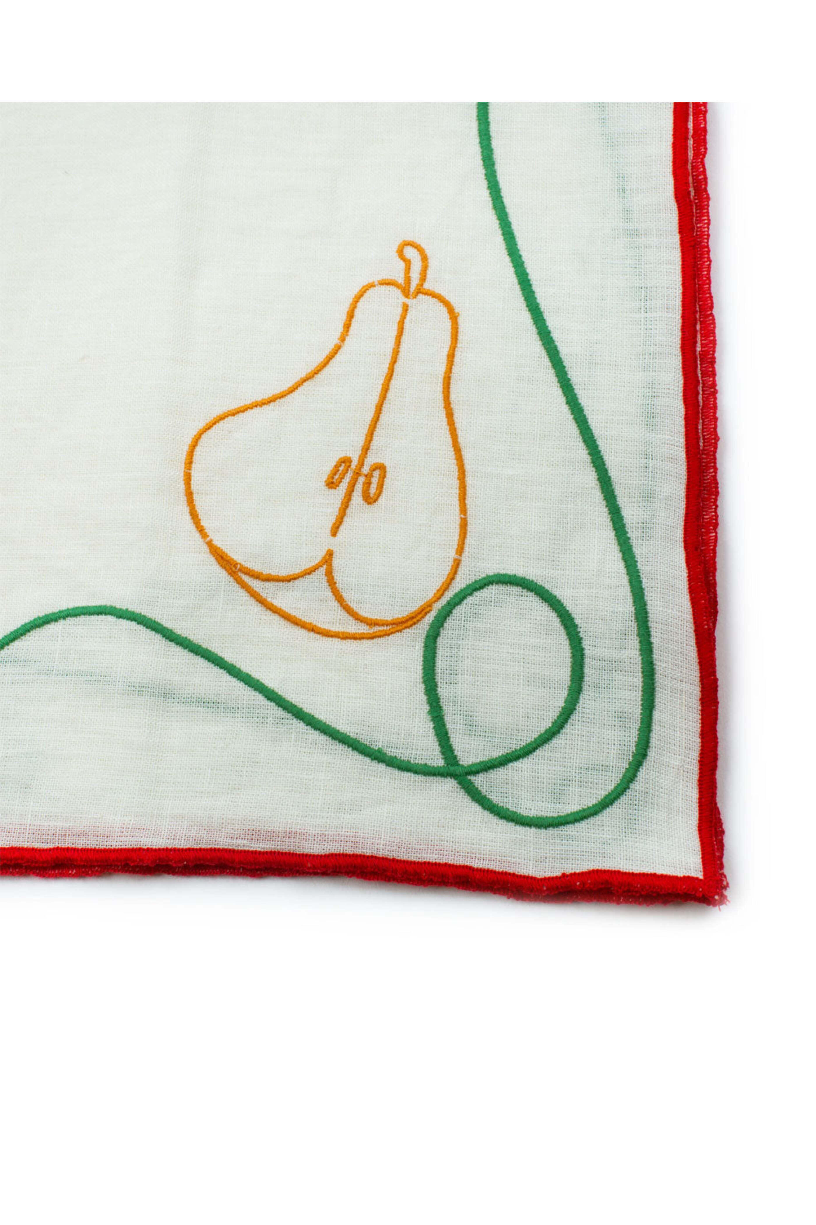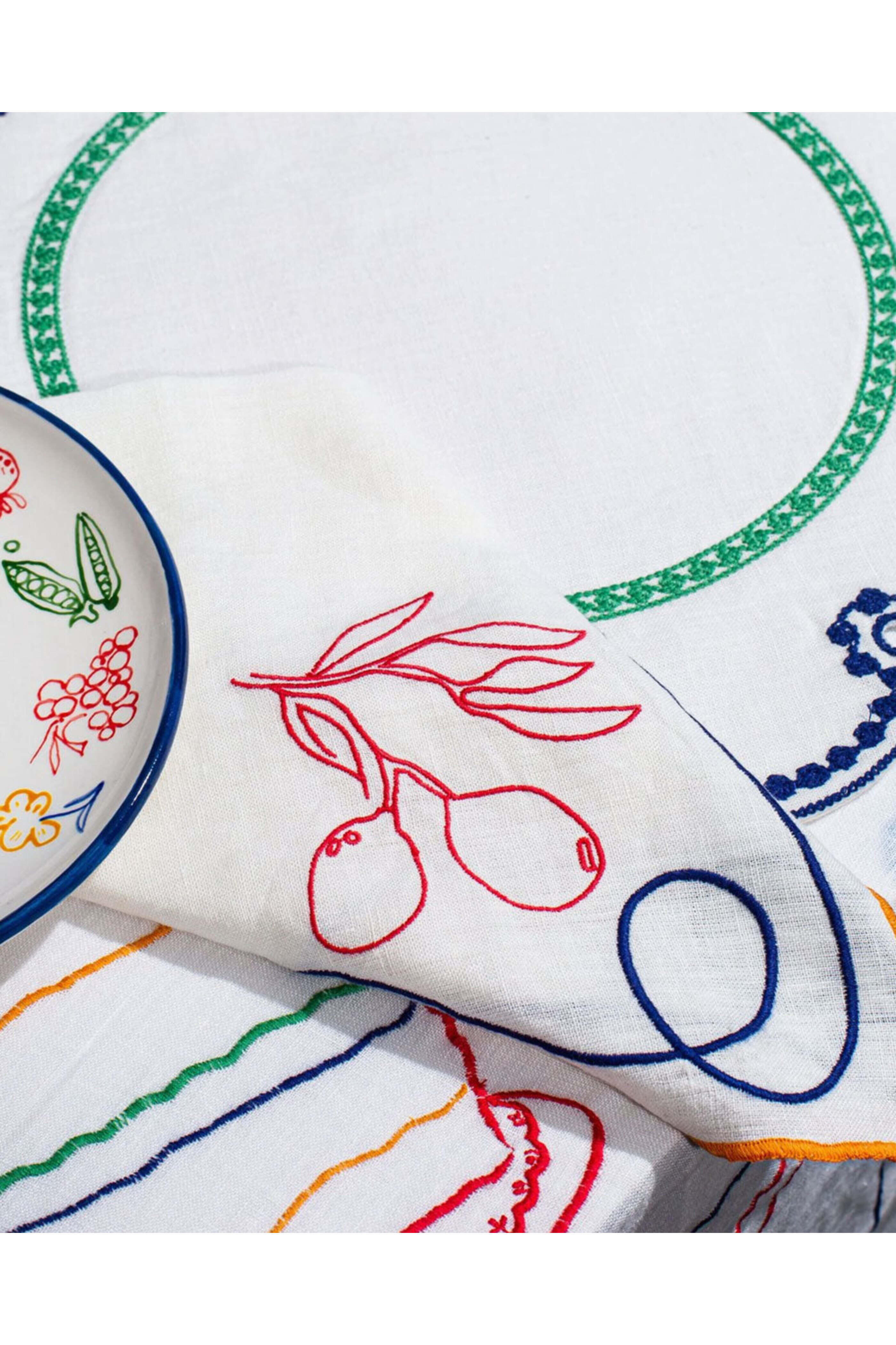 Misette Fete Embroidered Linen Napkins. Set of four. Multicolor embroidery. Fruits & Veggies embroidered. Features grapes, pear, peas and olives. 20" x 20". Made in India . 100% linen with embroidery.