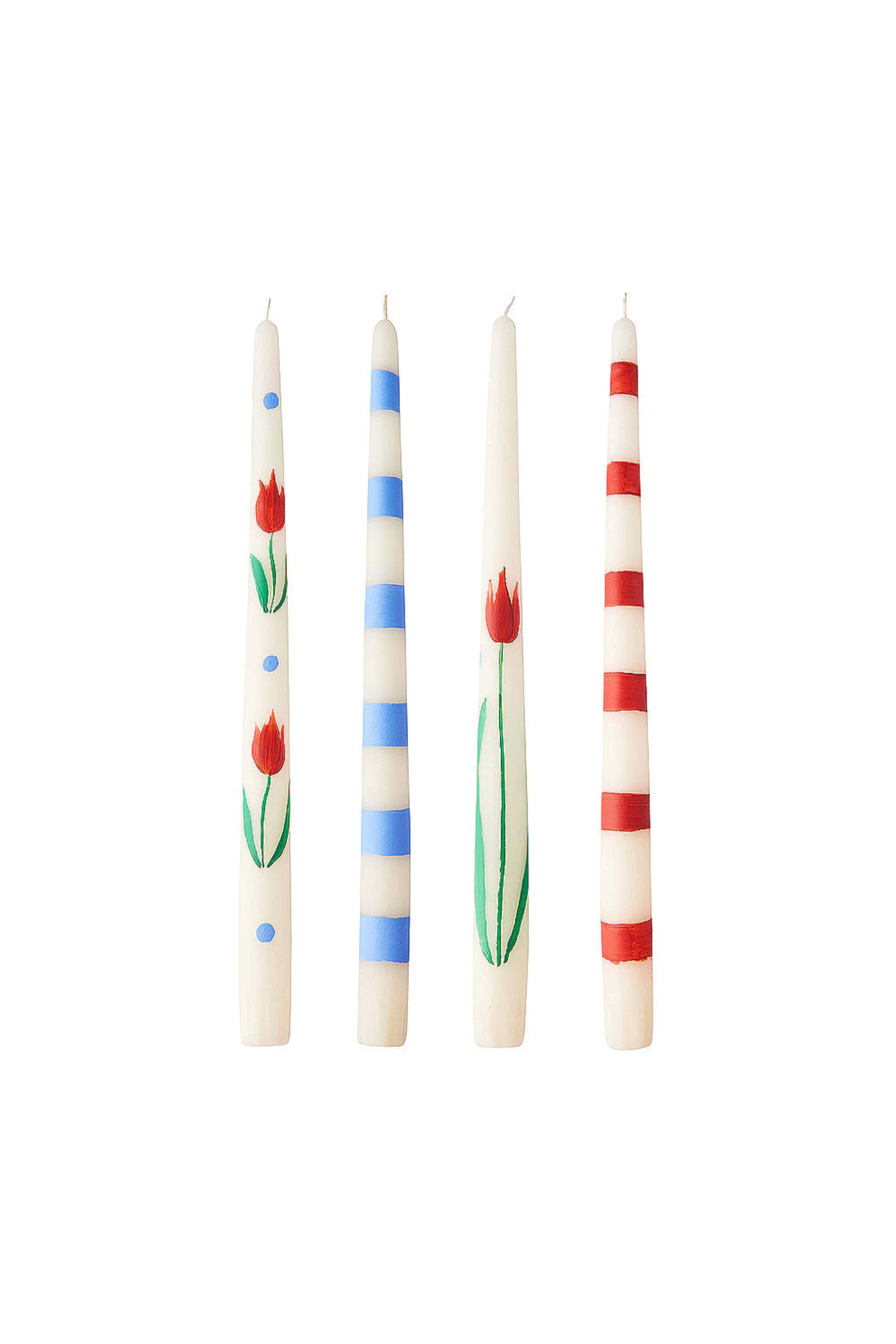 Misette Hand-Painted Taper Candles. Set of 4. Food-grade paraffin wax candles with lead-free cotton wick. Hand-painted. Approximately 11 hour burn time. 12H. Made in Canada.