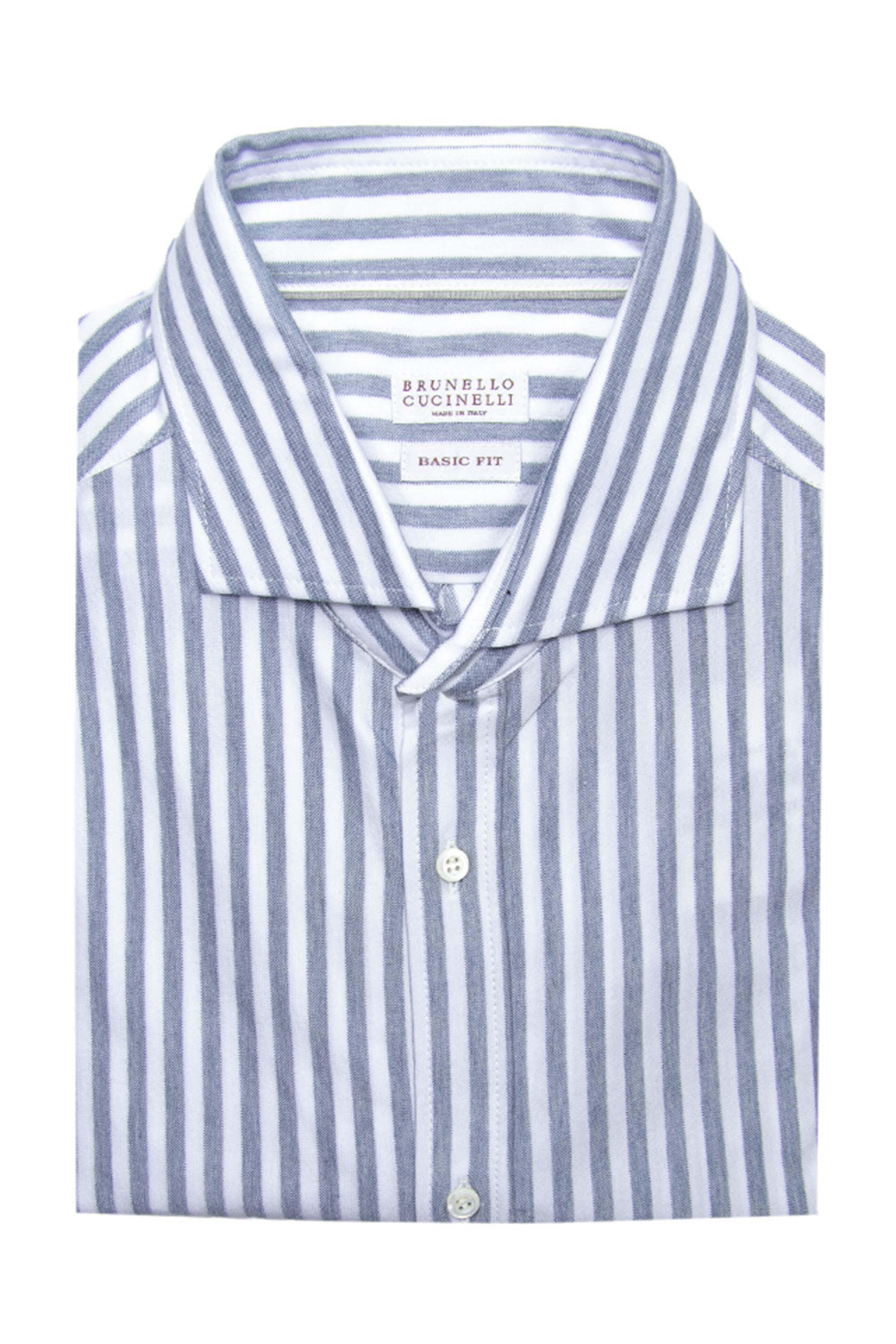 Brunello Cucinelli Blue and White Stripe Jersey Knit Sport Shirt. Spread collar. Button down front. Long sleeves. Two button straight cuffs. Basic fit. Made in Italy. 100% cotton.