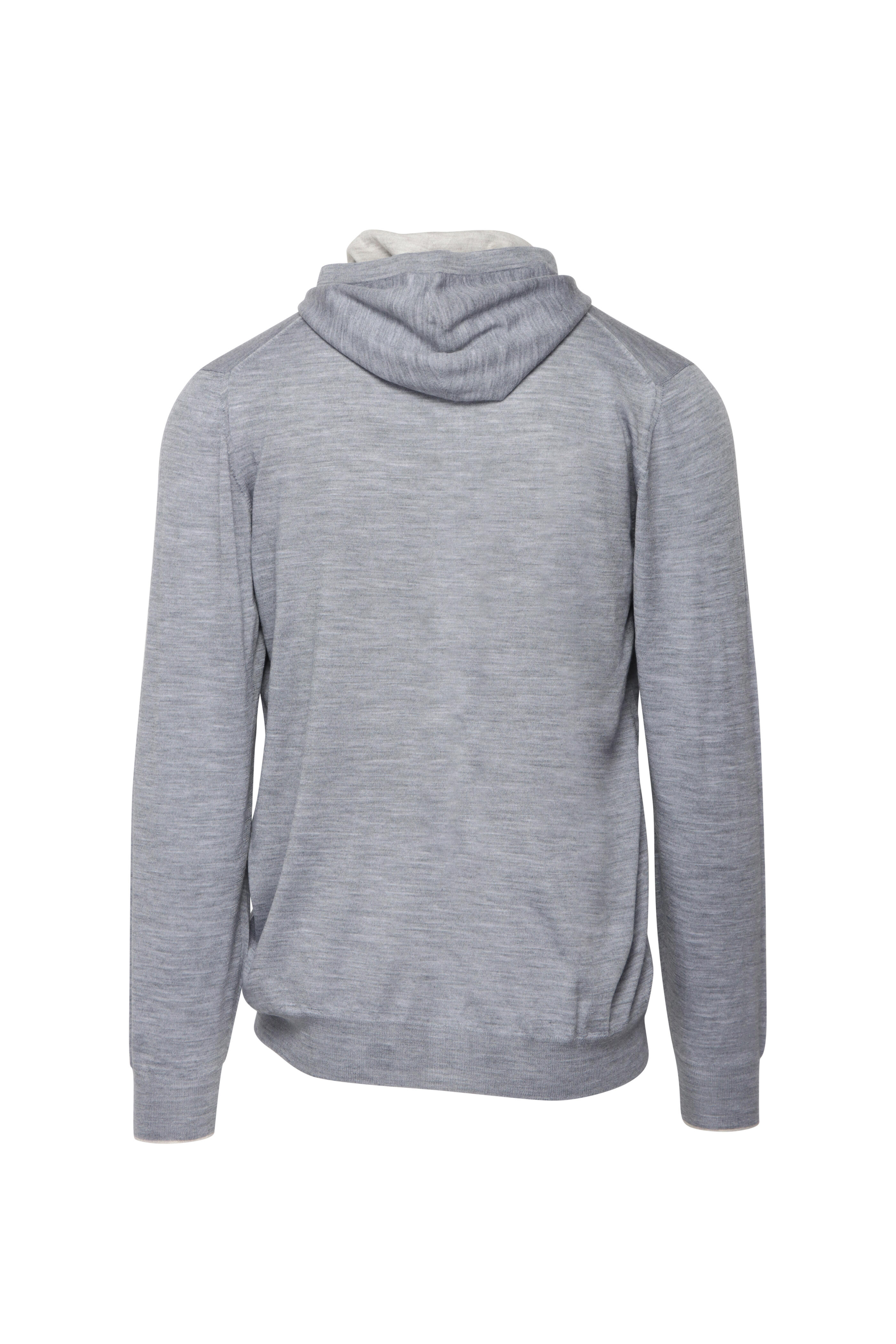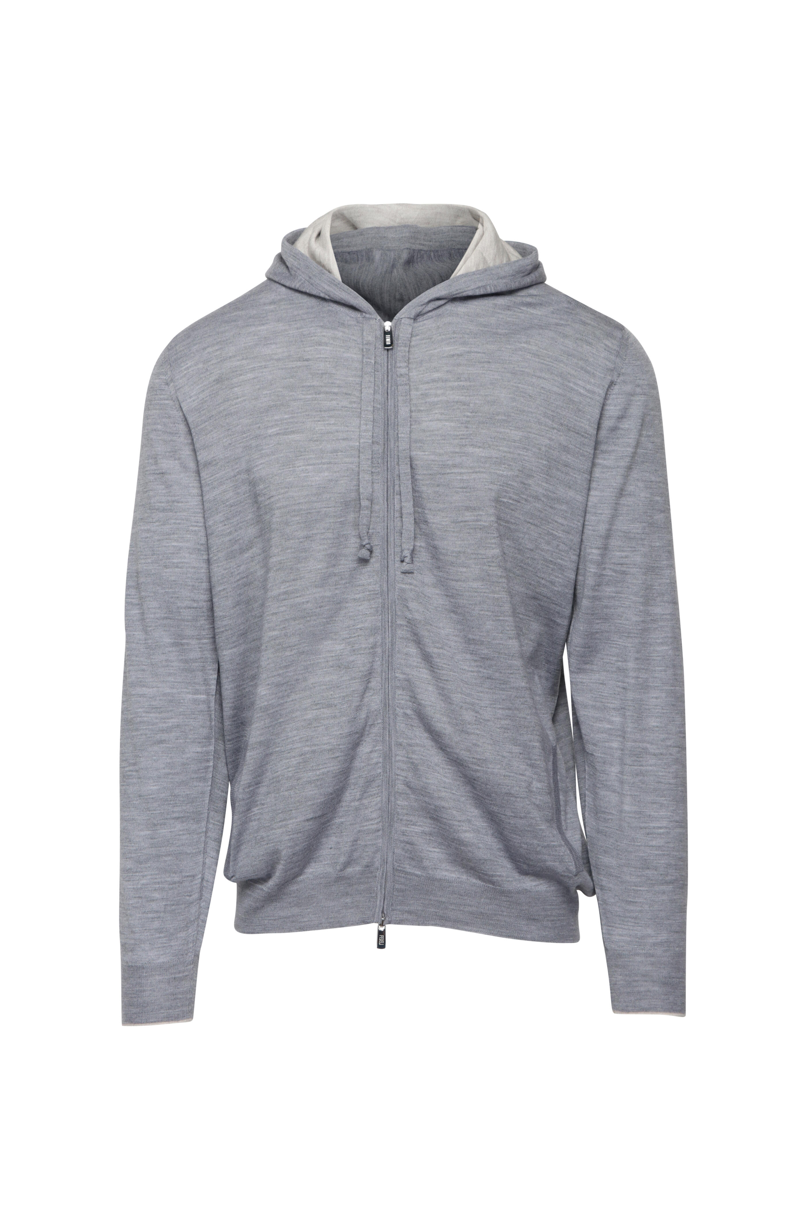 Hooded. Two way front zip. Side slip pockets. Ribbed trims. Made in Italy. 100% virgin wool. Hand wash.