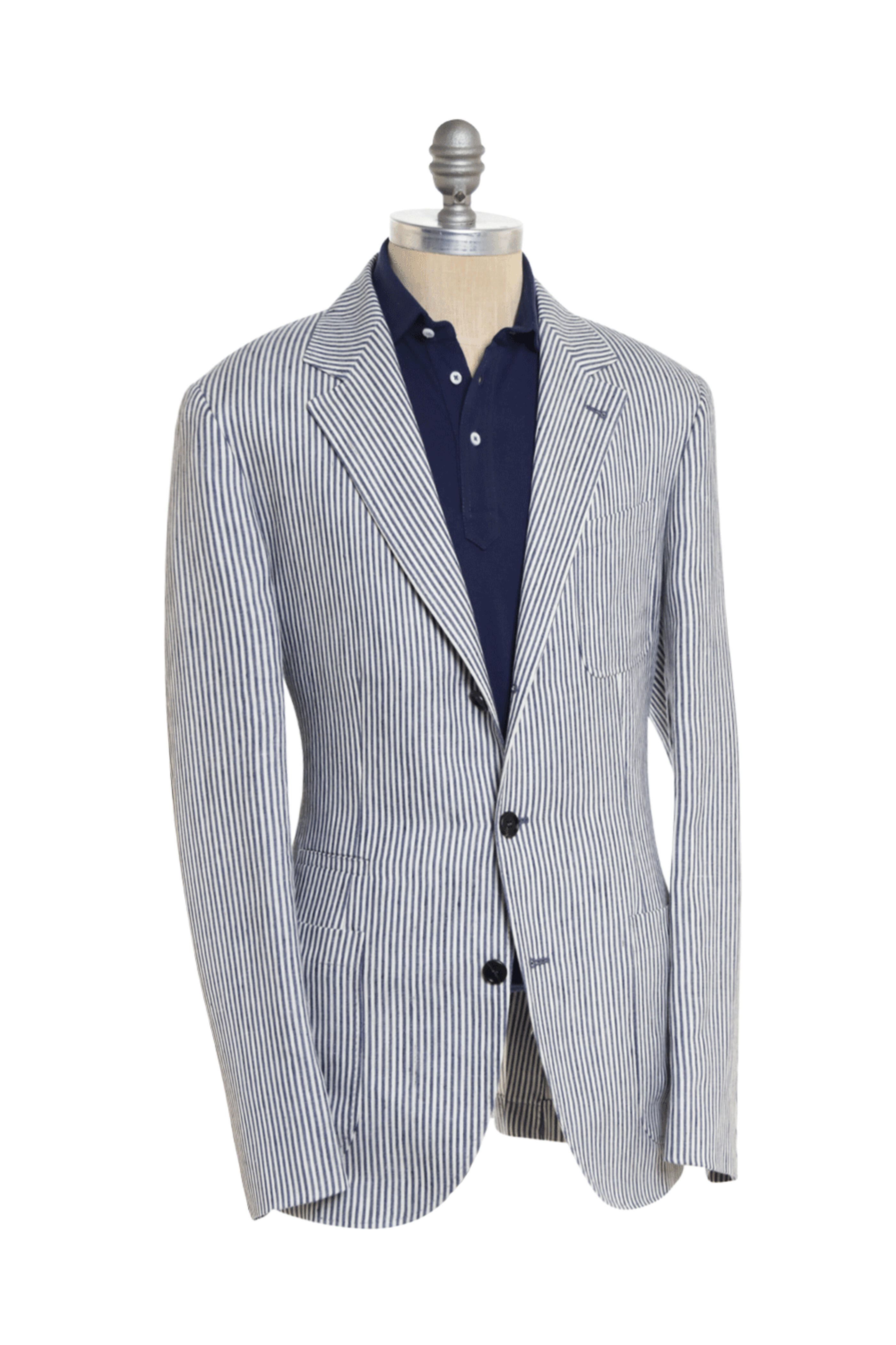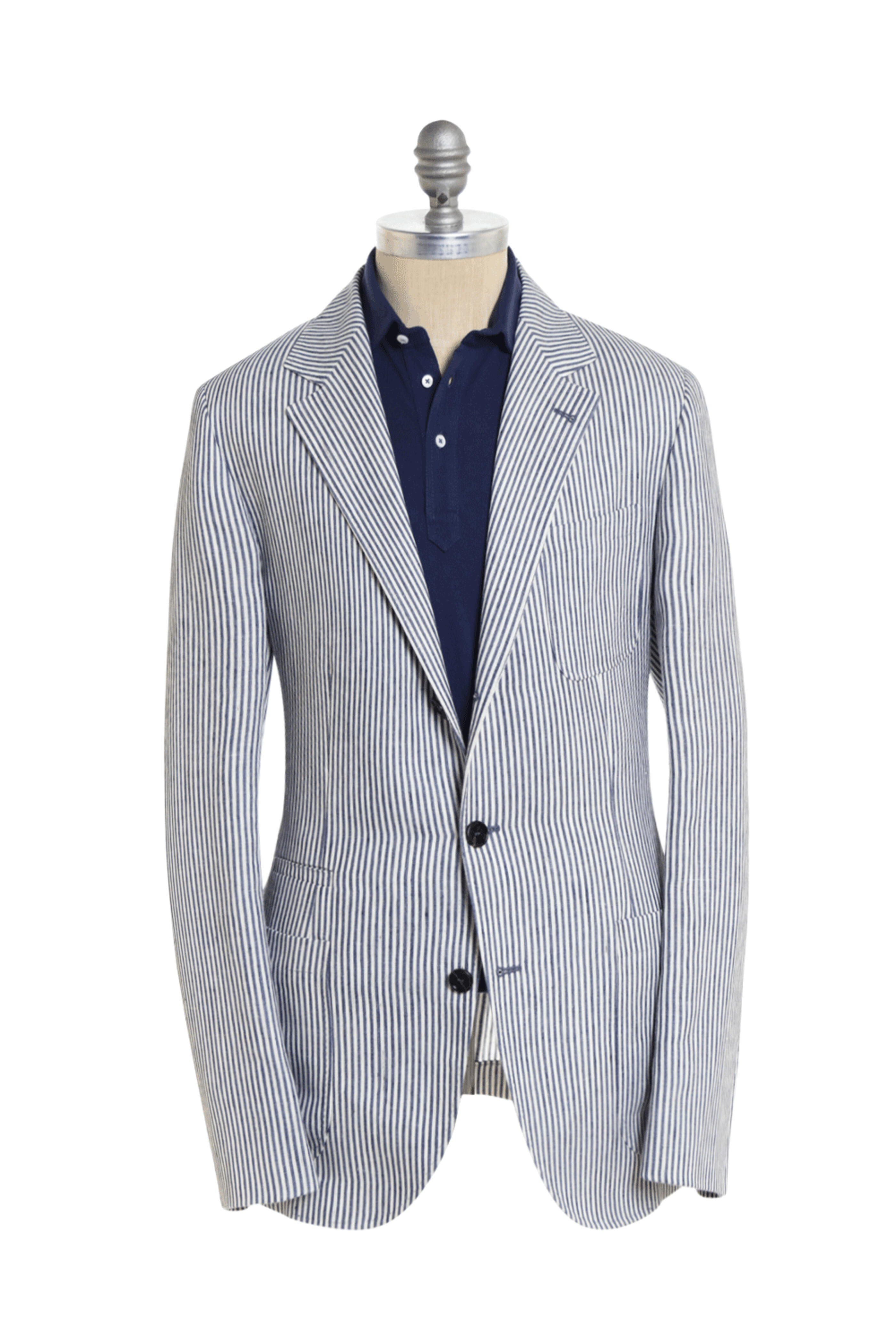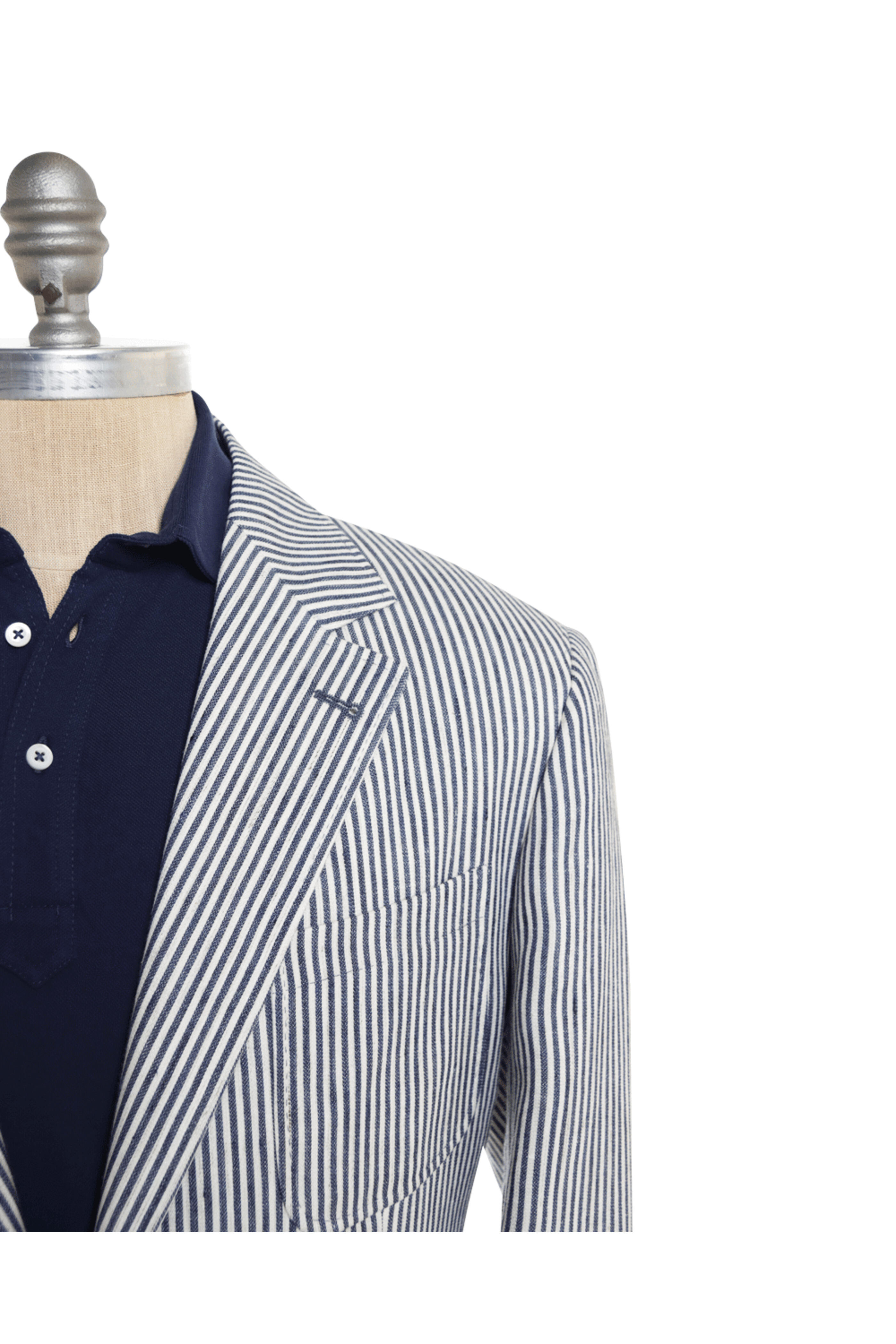 - Brunello Cucinelli Denim Blue and White Striped Linen Blend Sportcoat