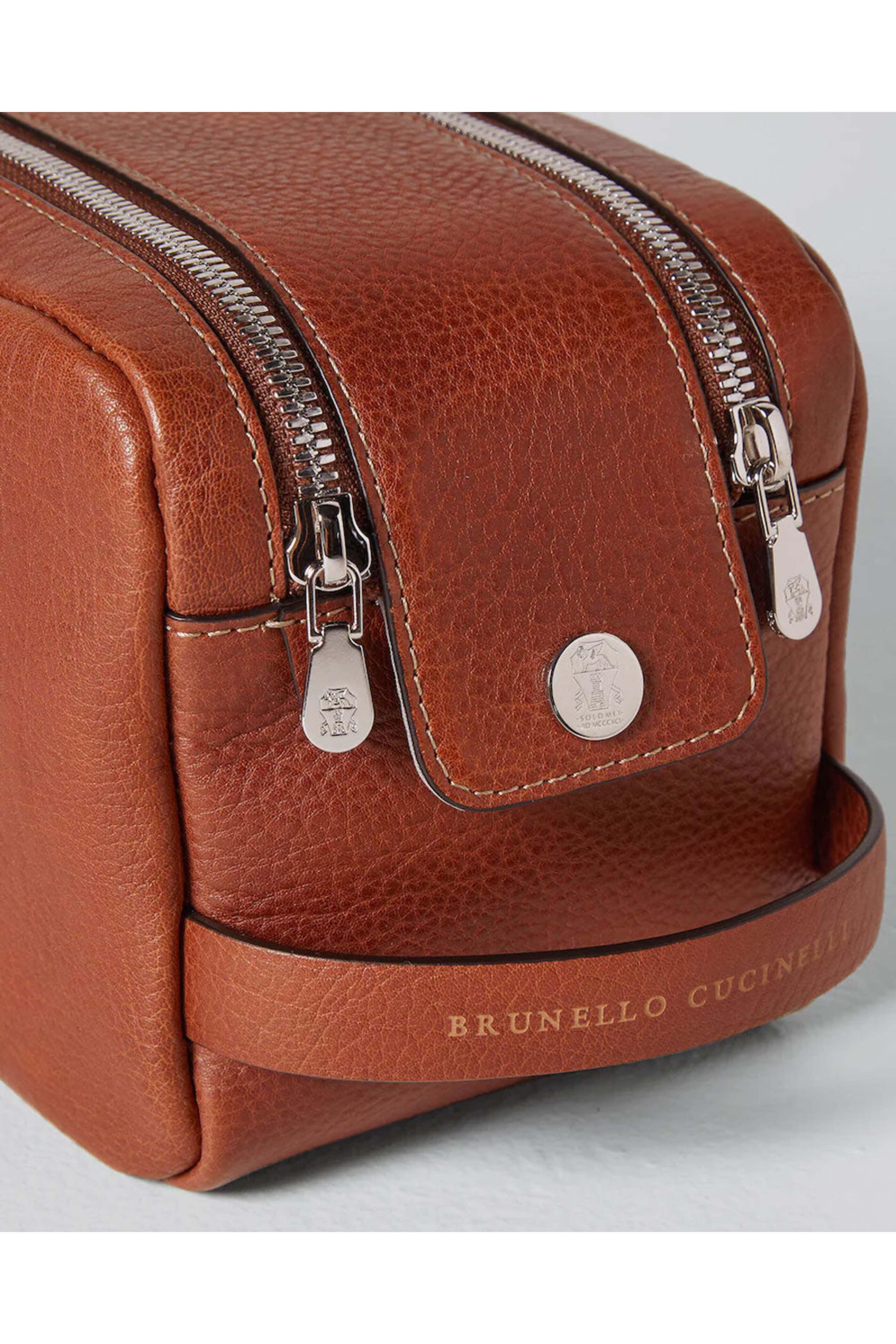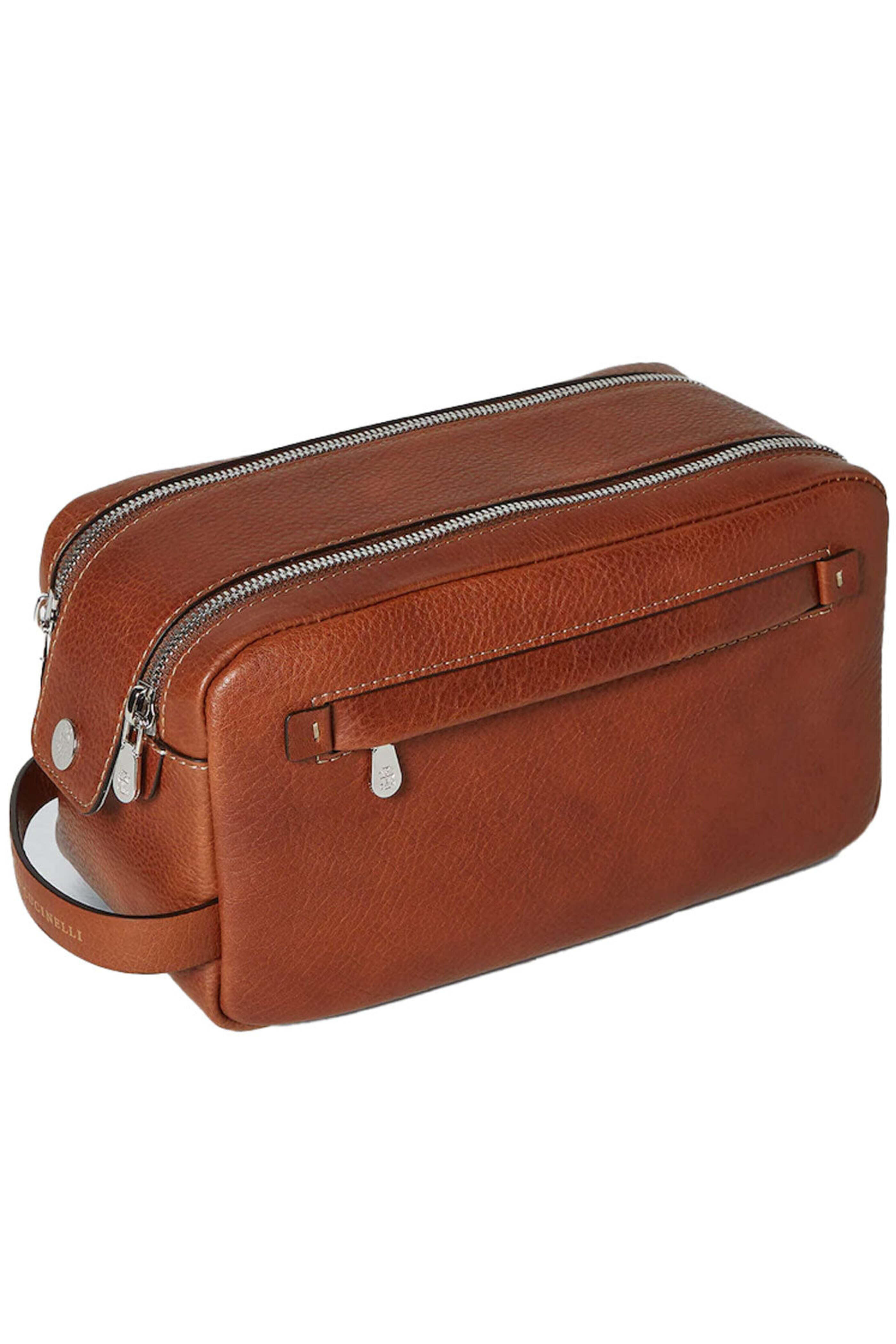 Cucinelli Brown Leather Travel Case. Double zipper and magnet closure. Side handle with branded detail. Exterior zip pocket. Interior compartment with zip closure. Nickel-free silver tone hardware. Lined with water-resistant fabric. 11 W X 5 H X 6 D. Made in Italy. 100% grained calfskin.