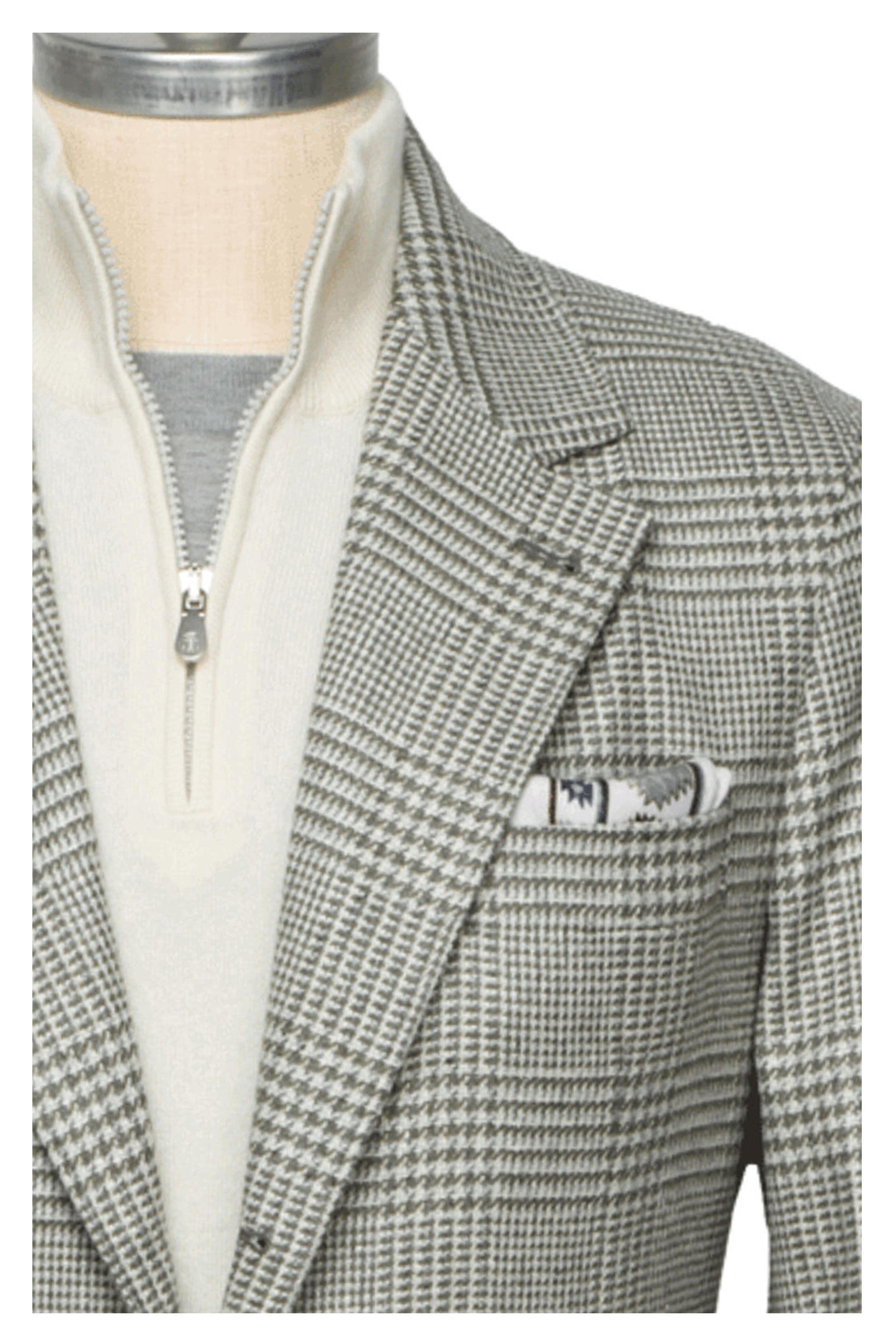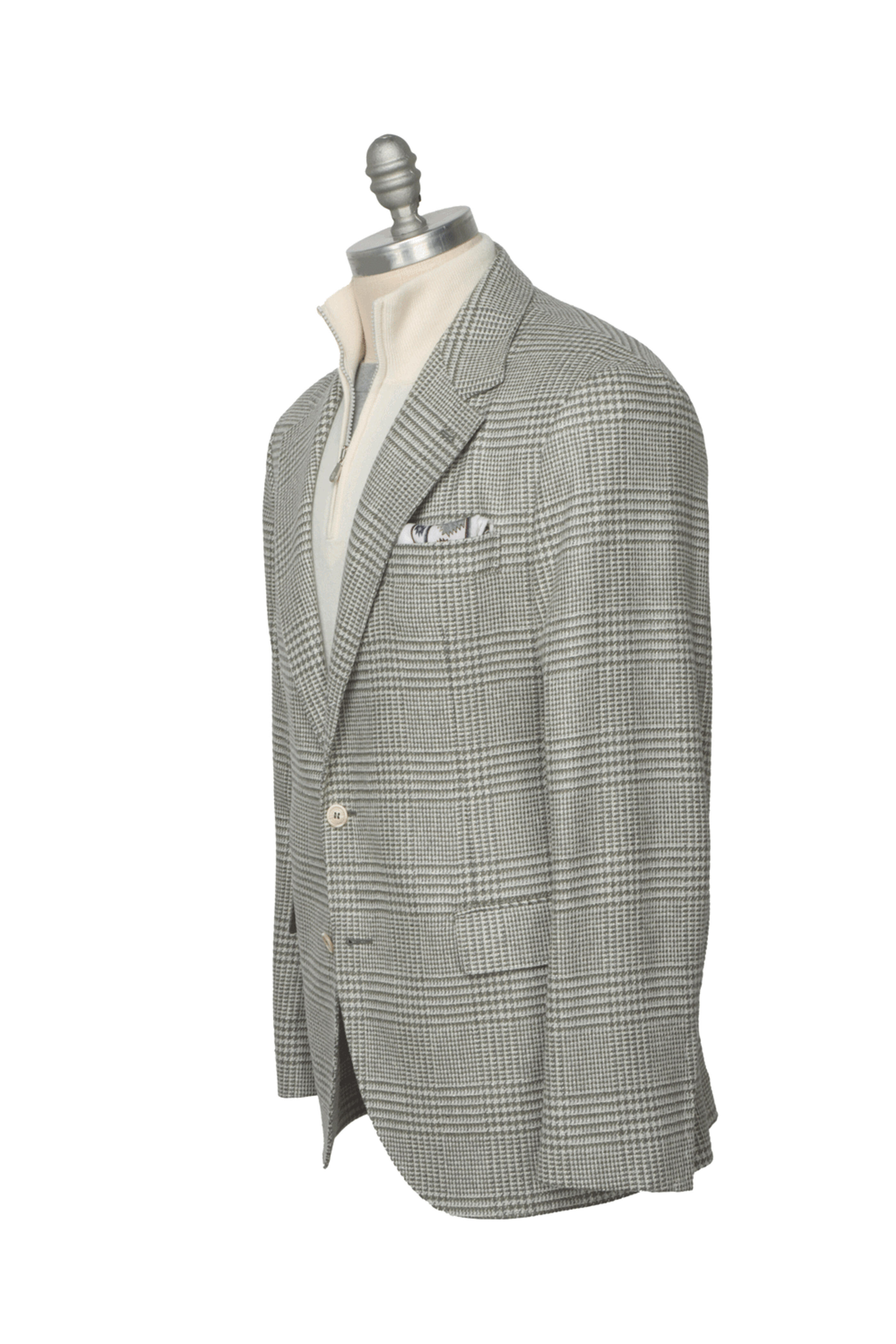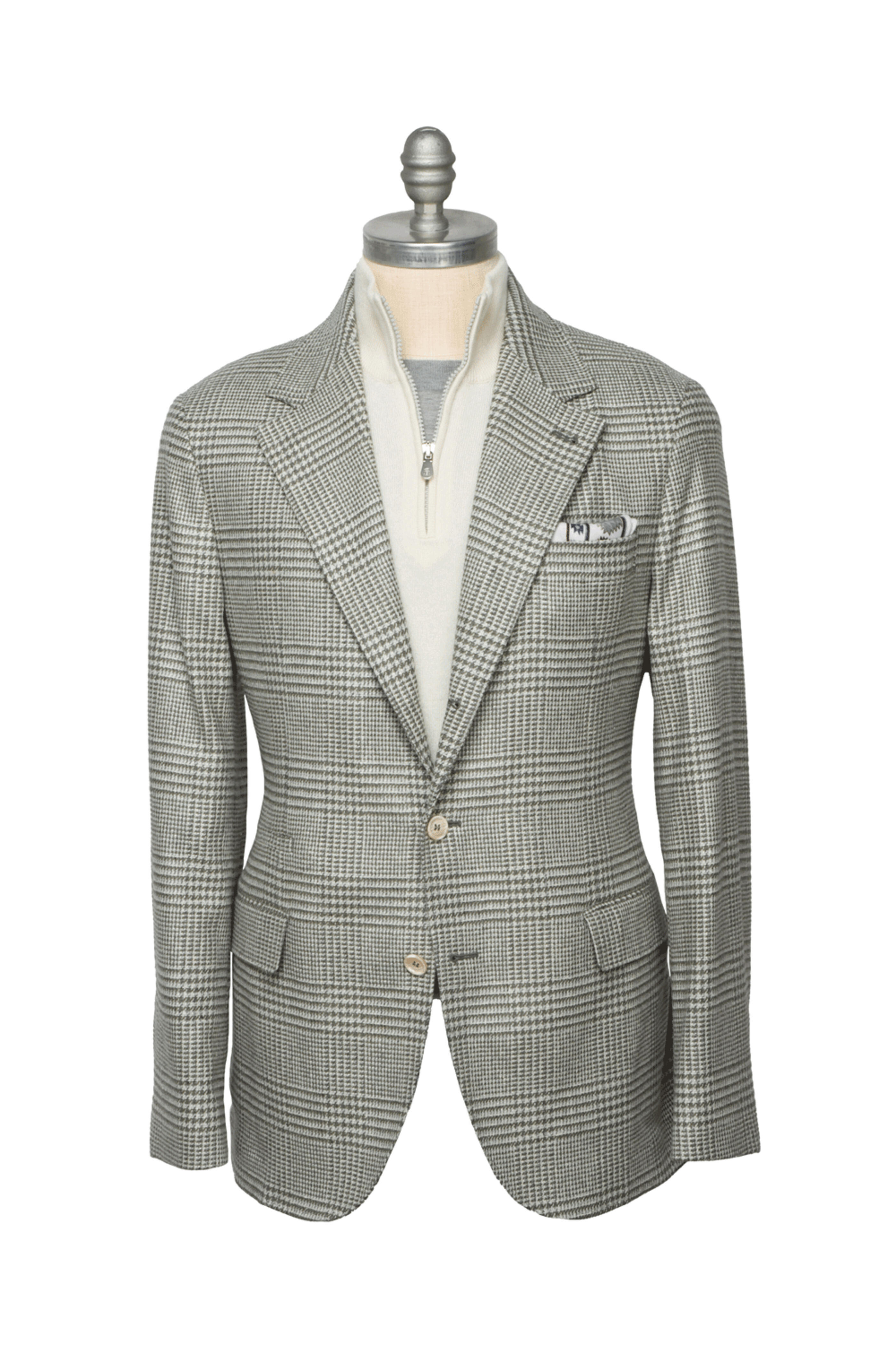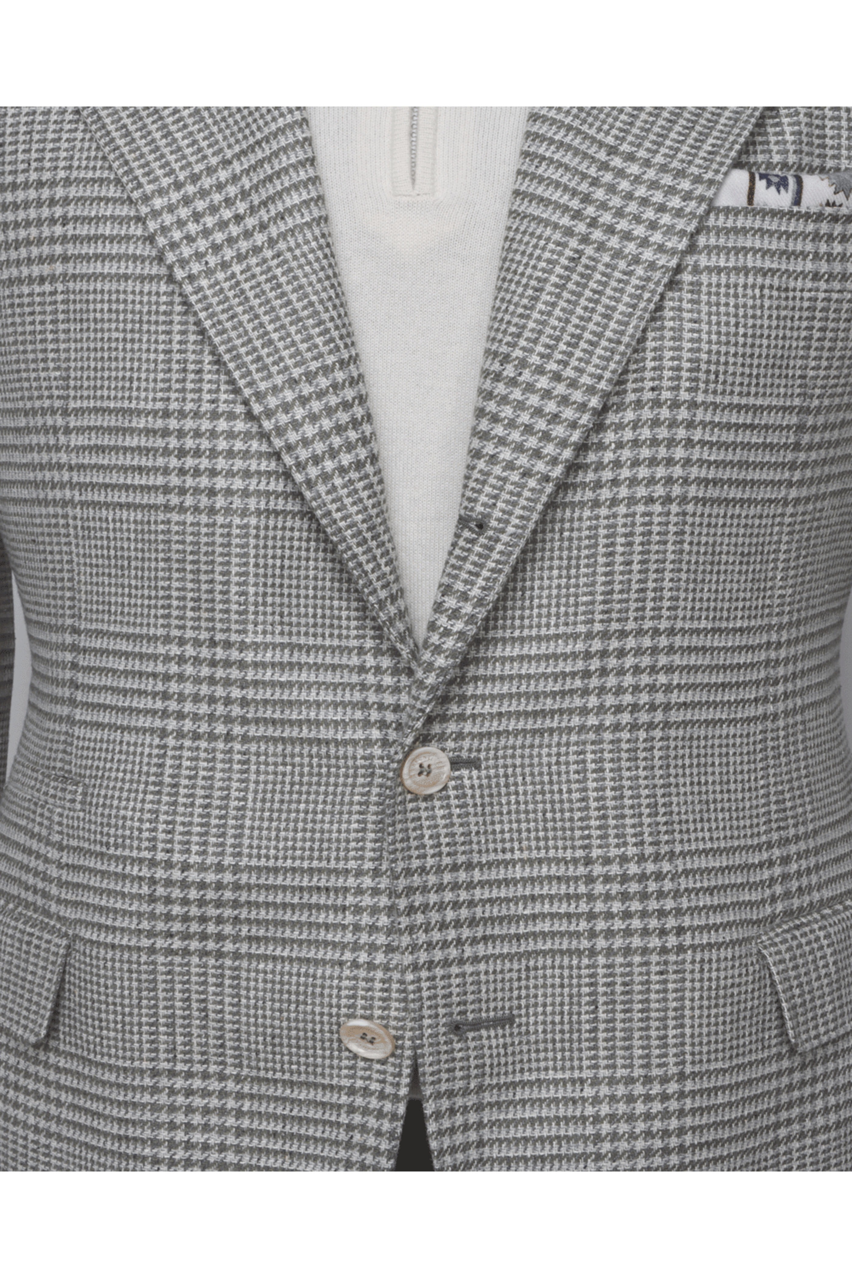 Notch lapels. Left lapel buttonhole. Front left chest welt pocket . Button front closure. Ticket pocket. Waist flap pockets. Unfinished buttonholes. Double back vents. Made in Italy . 64% wool, 33% silk, 2% cashmere, 1% elastane; quarter-lined 100% cupro lining.