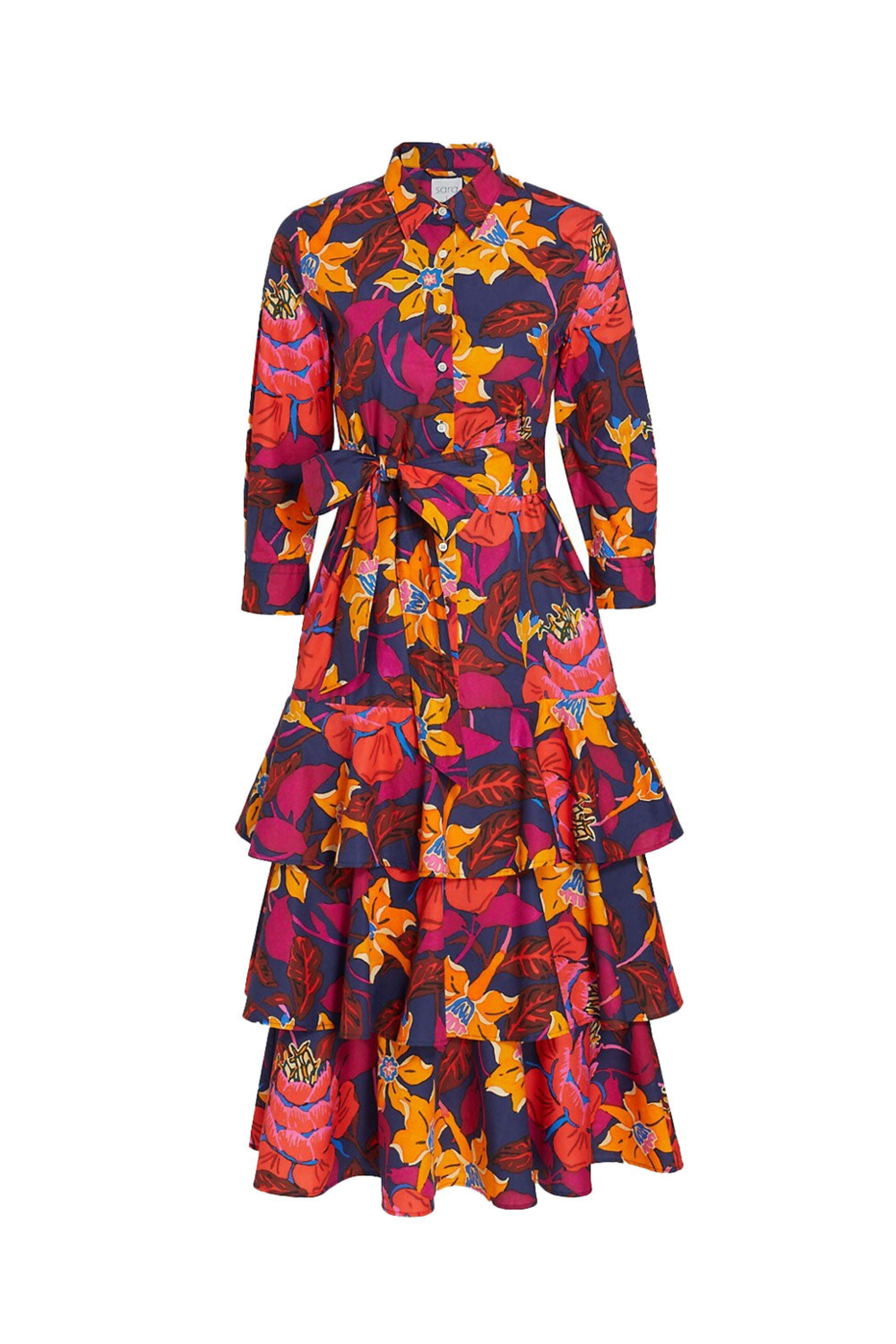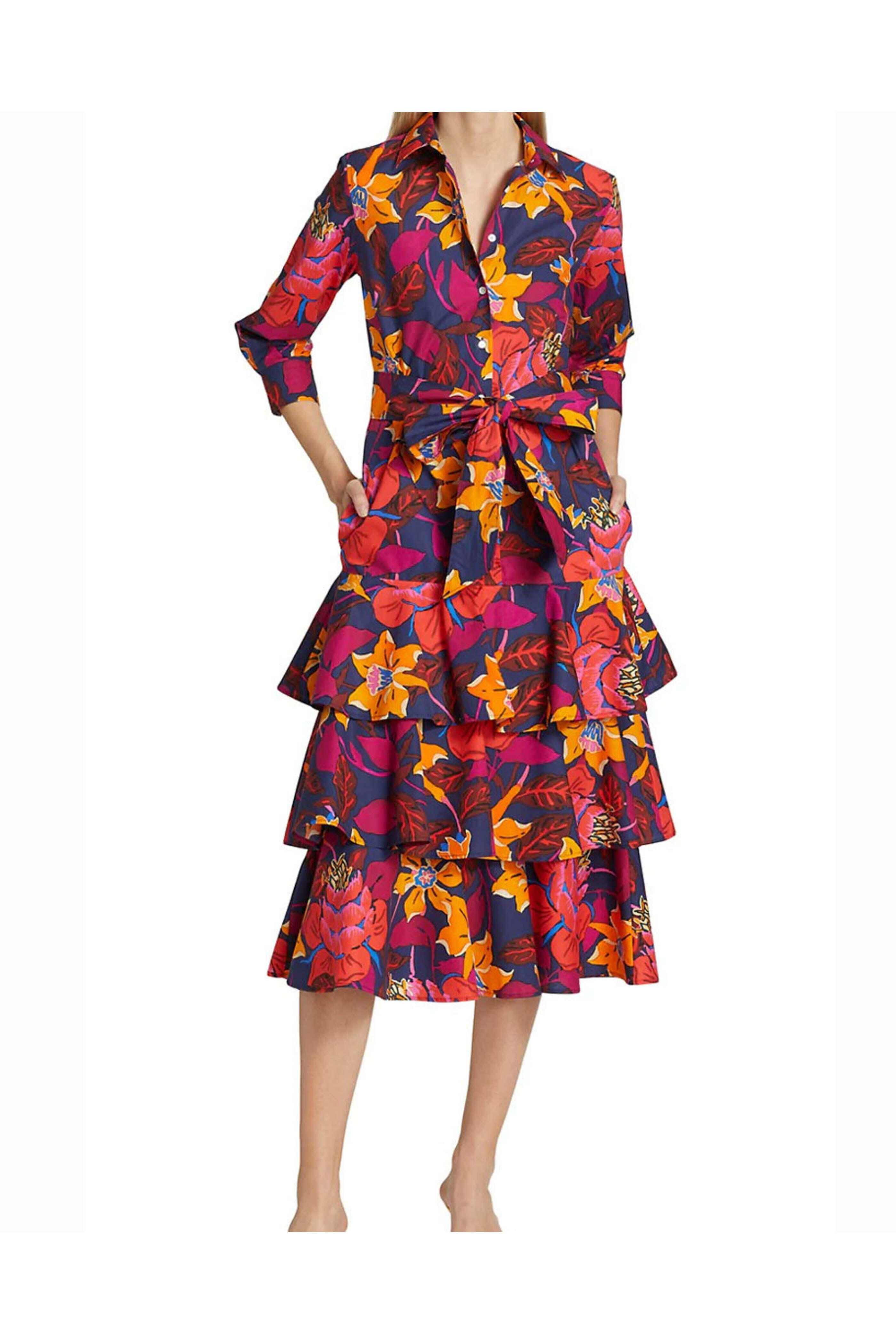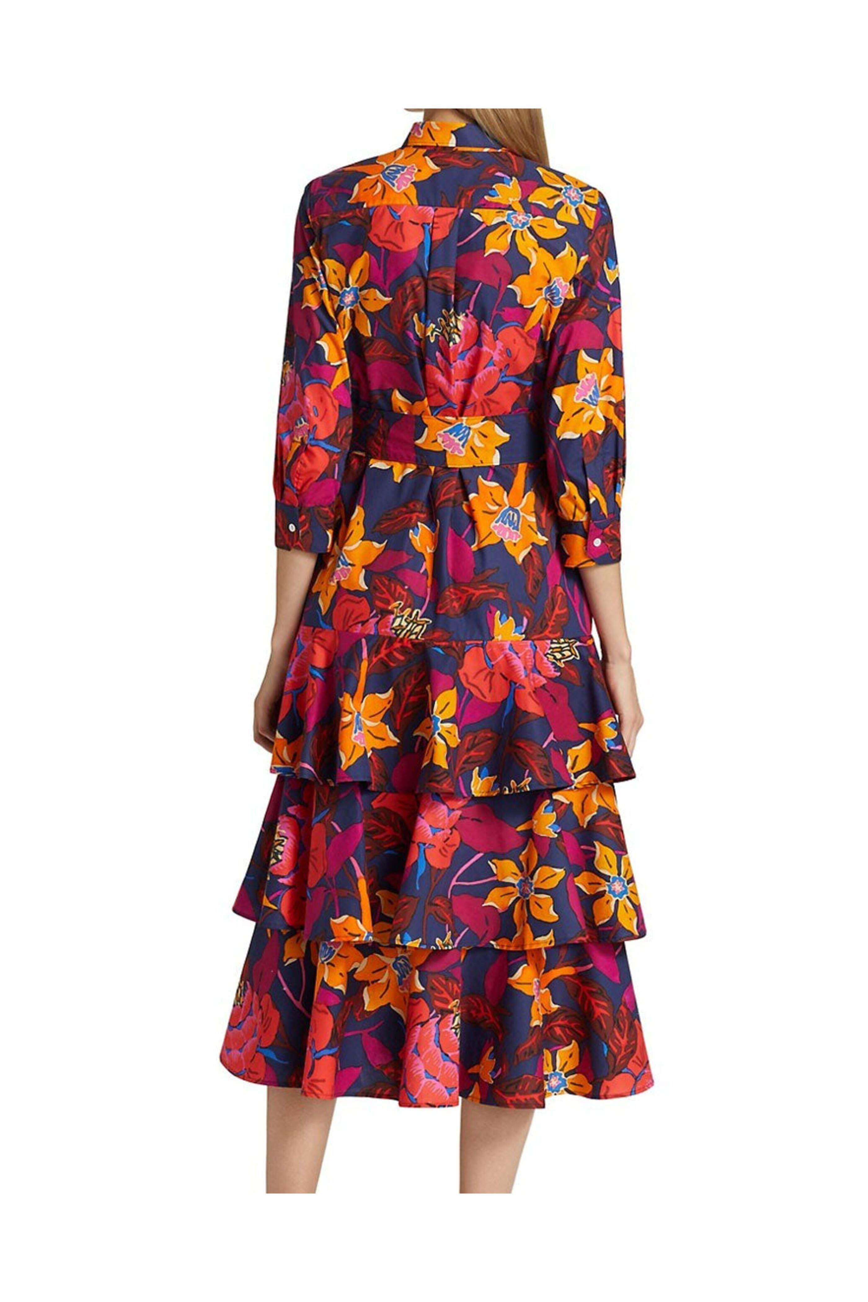 Sara Roka Coral Floral Mynaxa Dress. Spread collar. Three-quarter length sleeves. Side slip pockets. Button closure. Midi length. Tiered silhouette. 100% cotton.