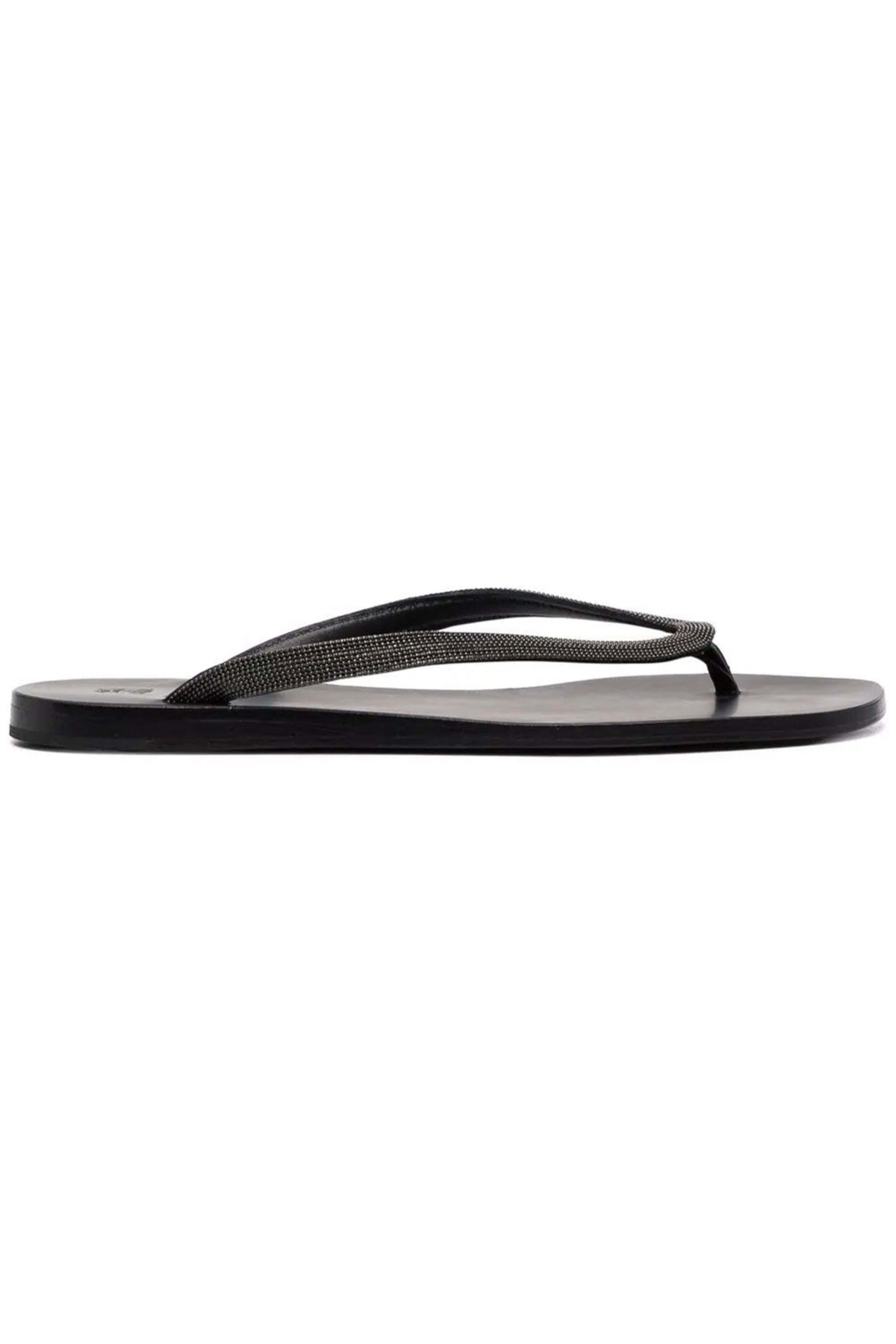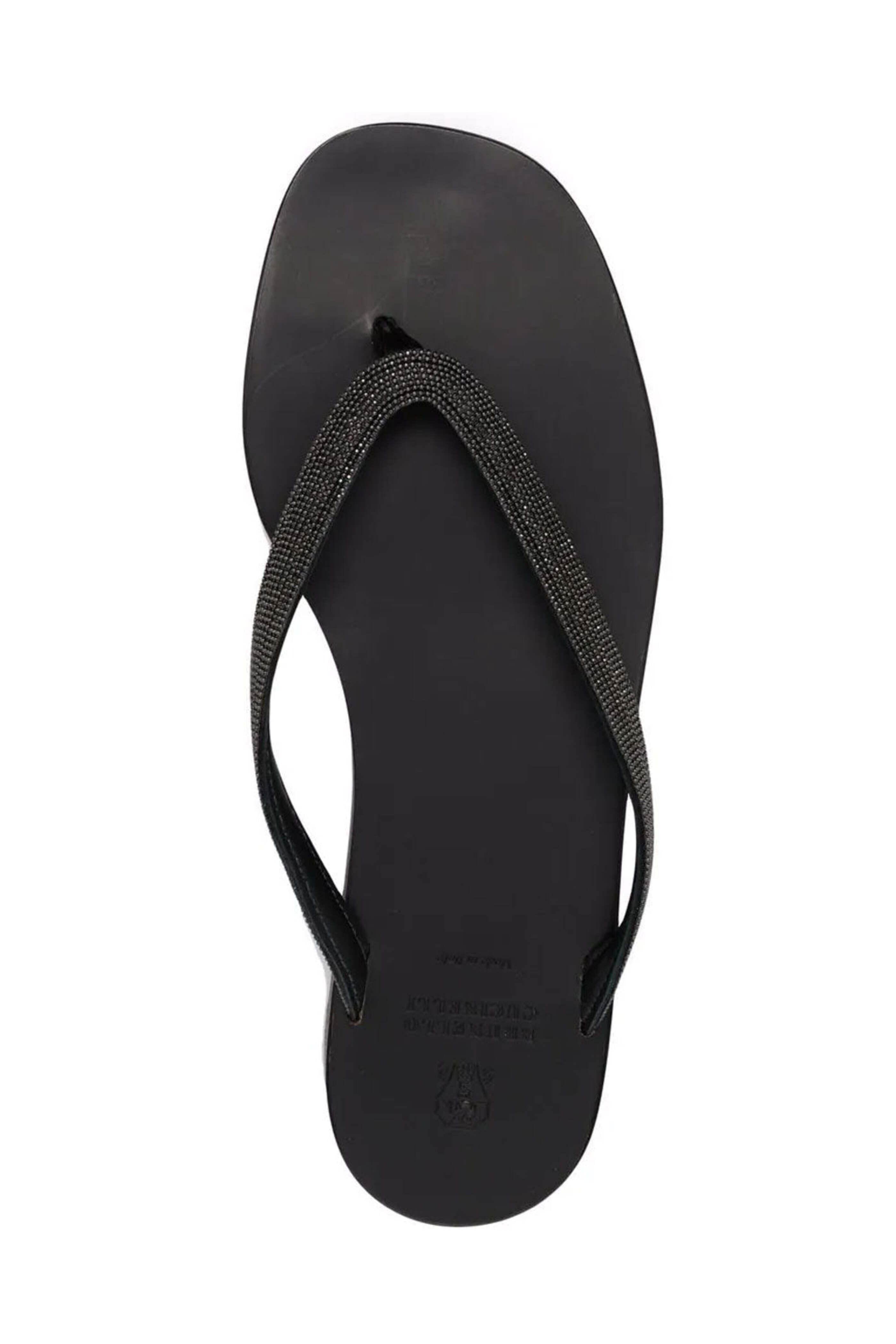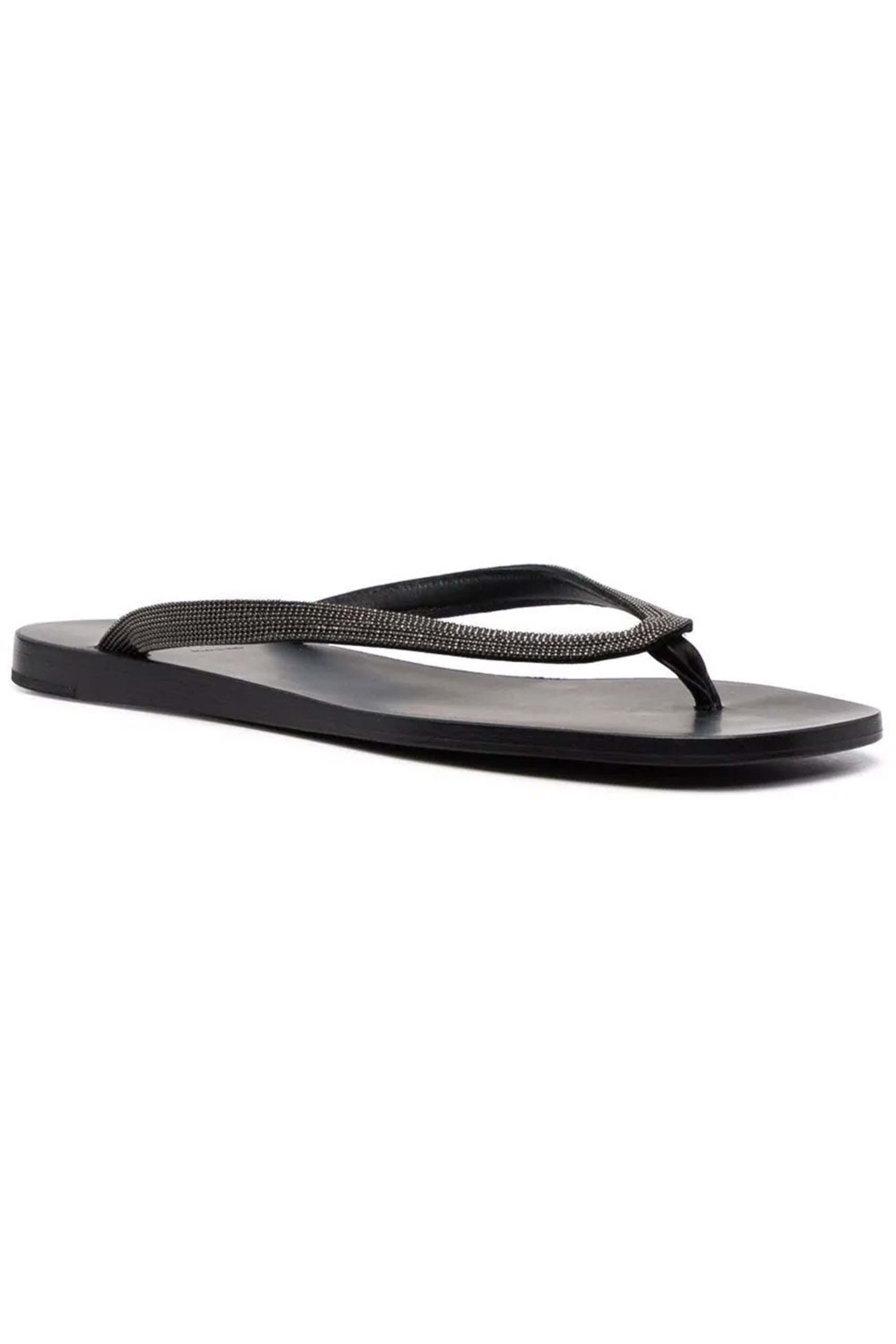 Brunello Cucinelli Monili Flip Flop in Black. Open thong style toe. Slip on. Signature Monili detail. Leather upper and lining. Leather and rubber sole. Made in Italy.
