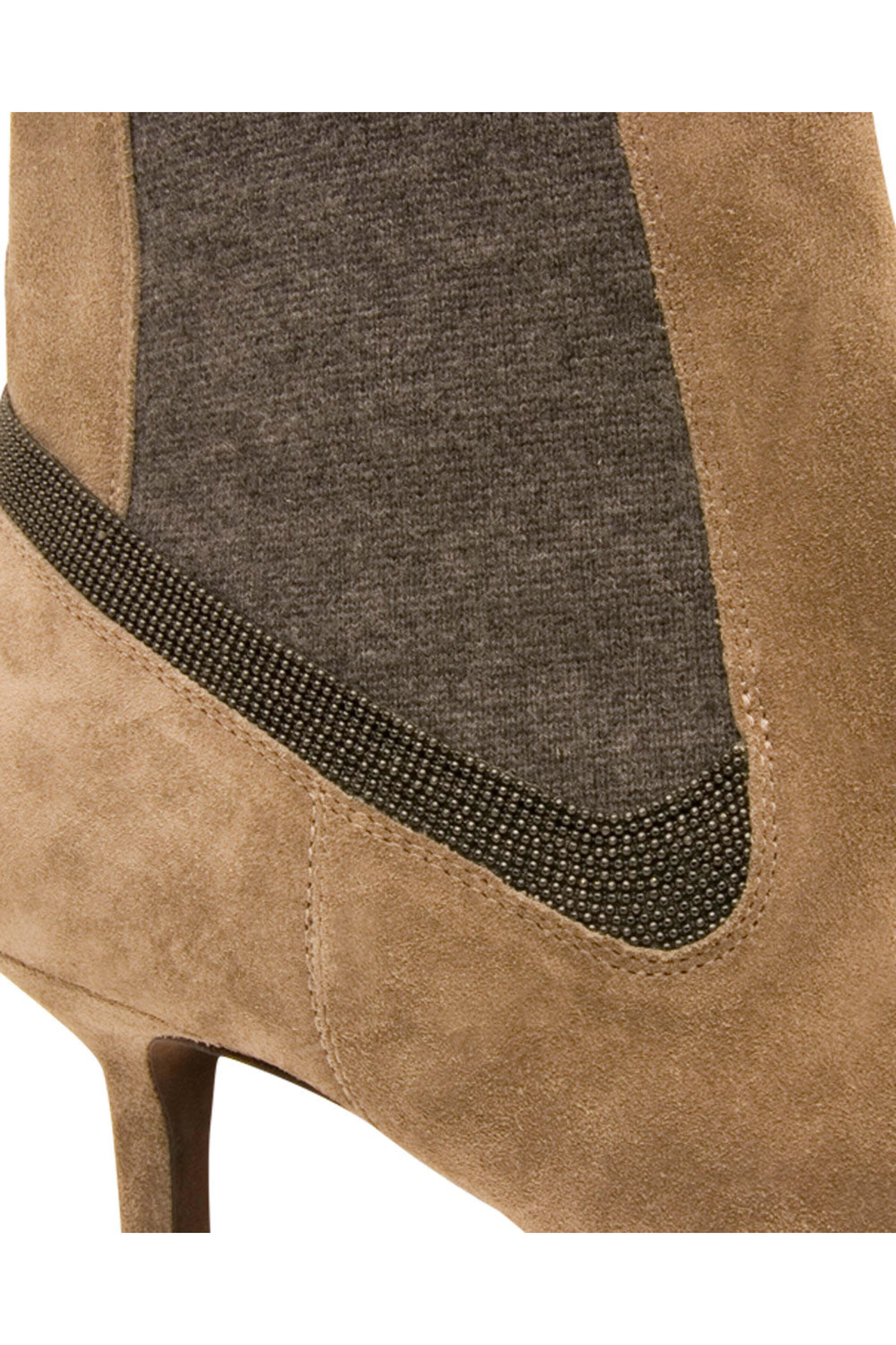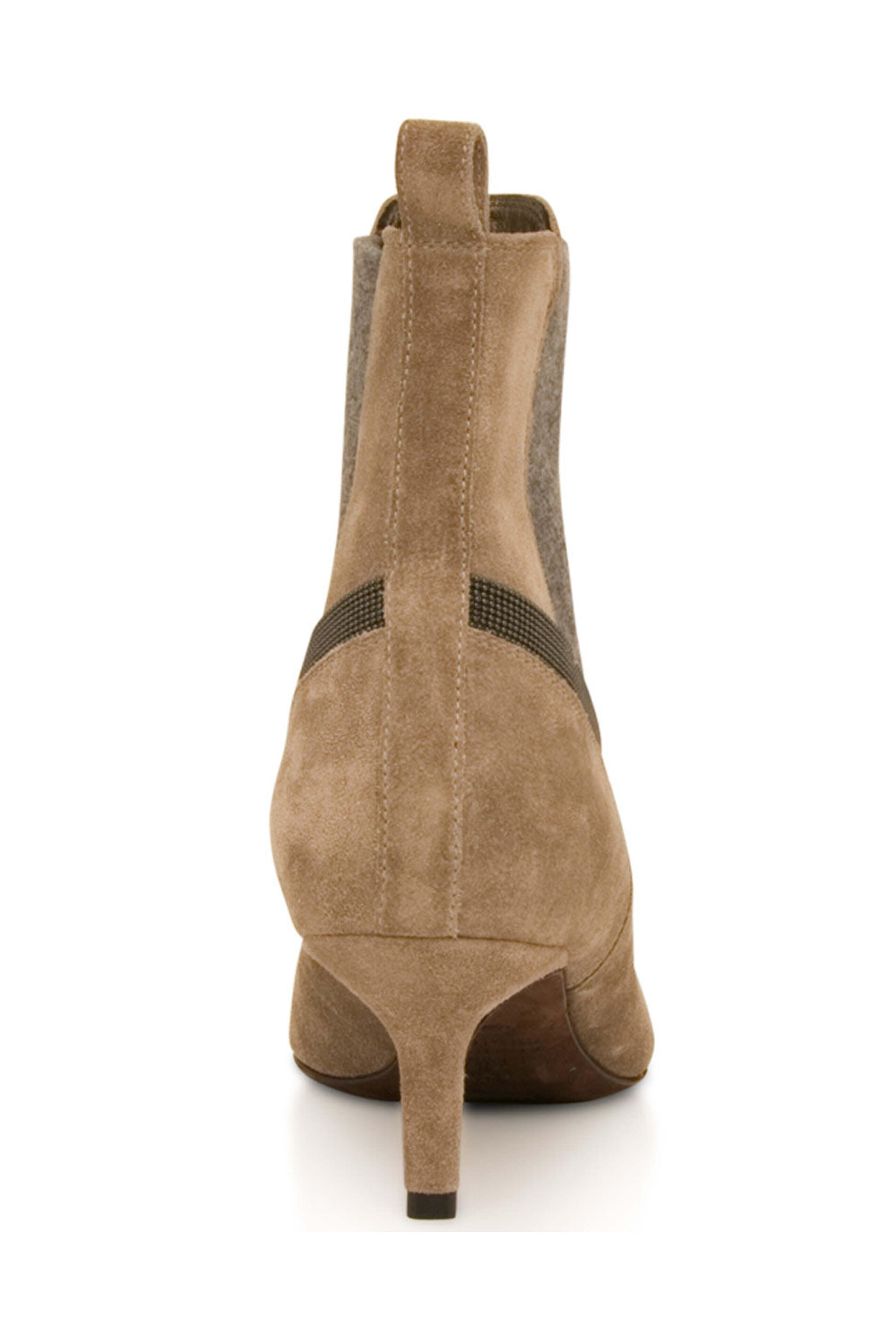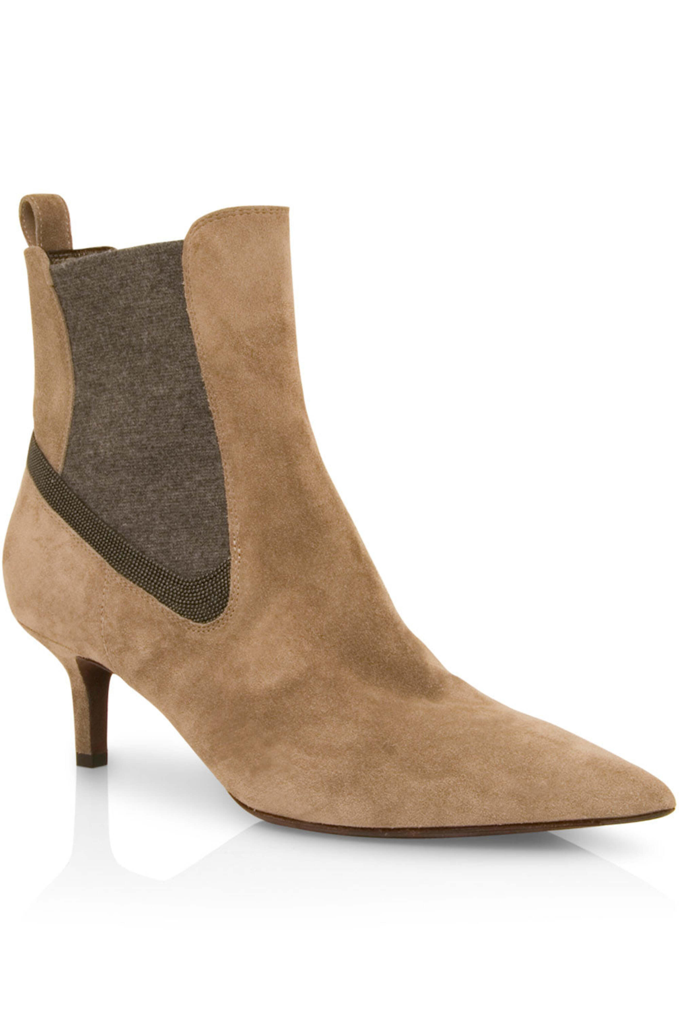 Brunello Cucinelli Light Taupe Pointed Toe Suede Bootie. Pointed toe. Ankle height. Cashmere panel at sides. Monili detail. Pull tab at heel. Low heel height. Suede outer. Leather sole. Made in Italy. Cashmere panel outer; 93% wool, 7% polyester.