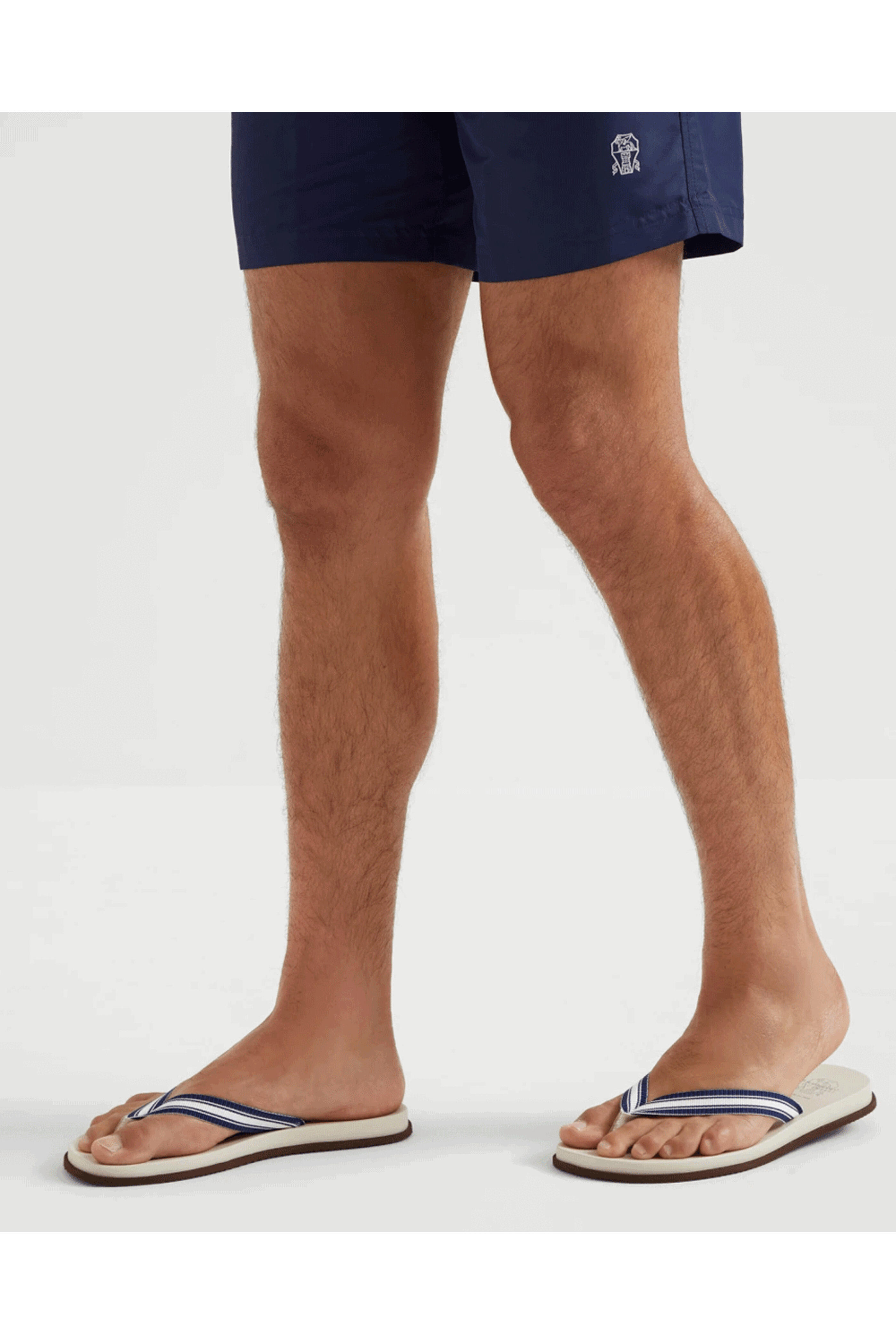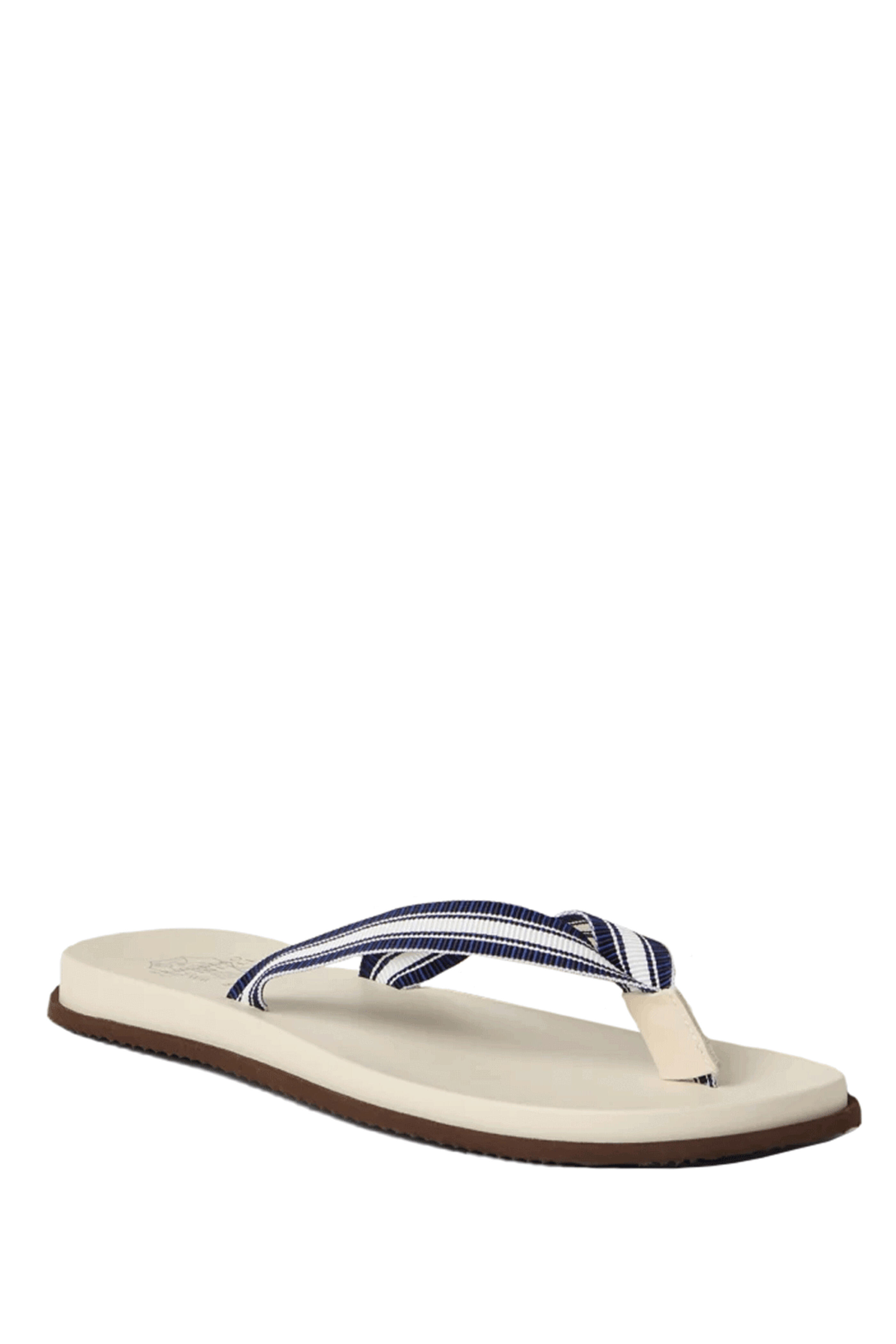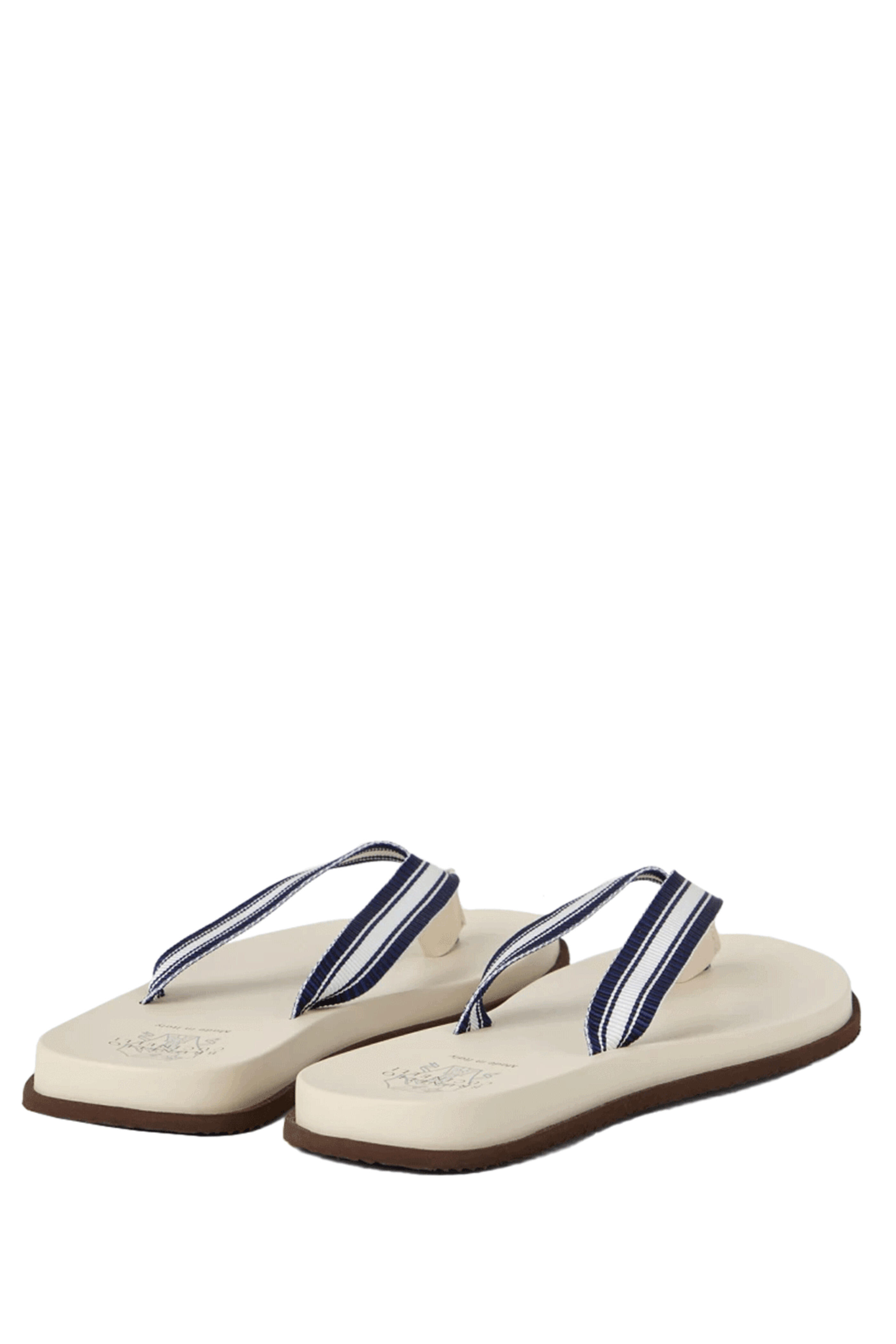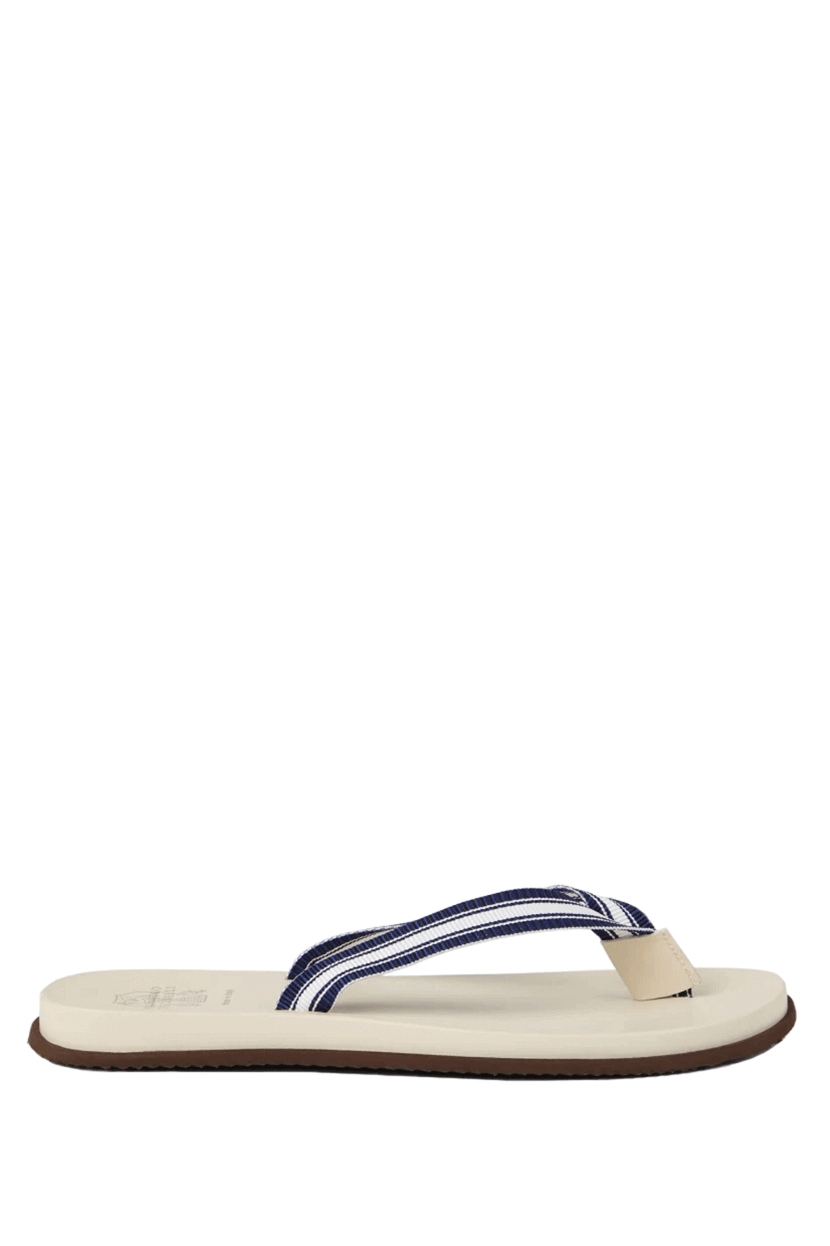 Thong strap. Round open toe . Molded insole. Striped motif. Rubber lining and sole. Made in Italy .