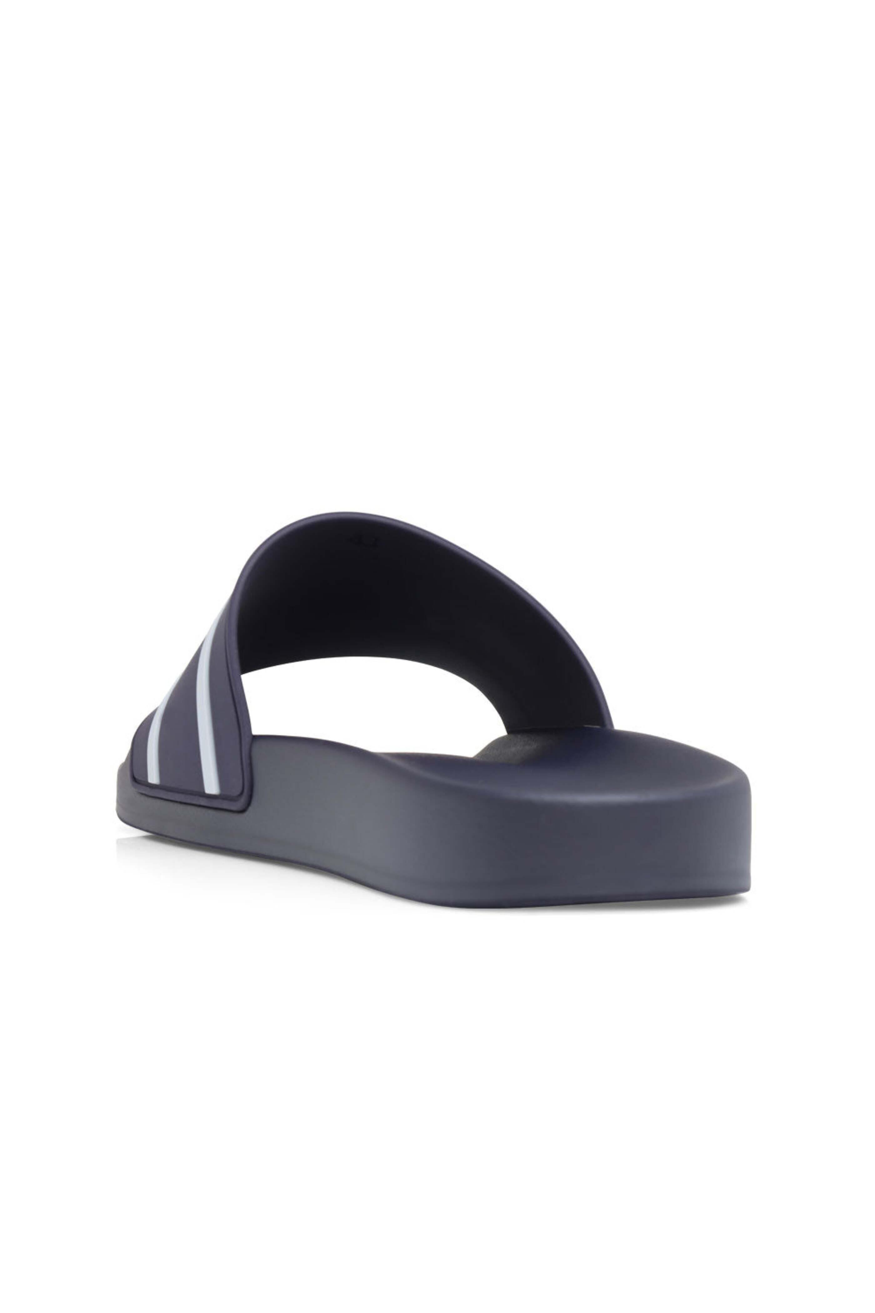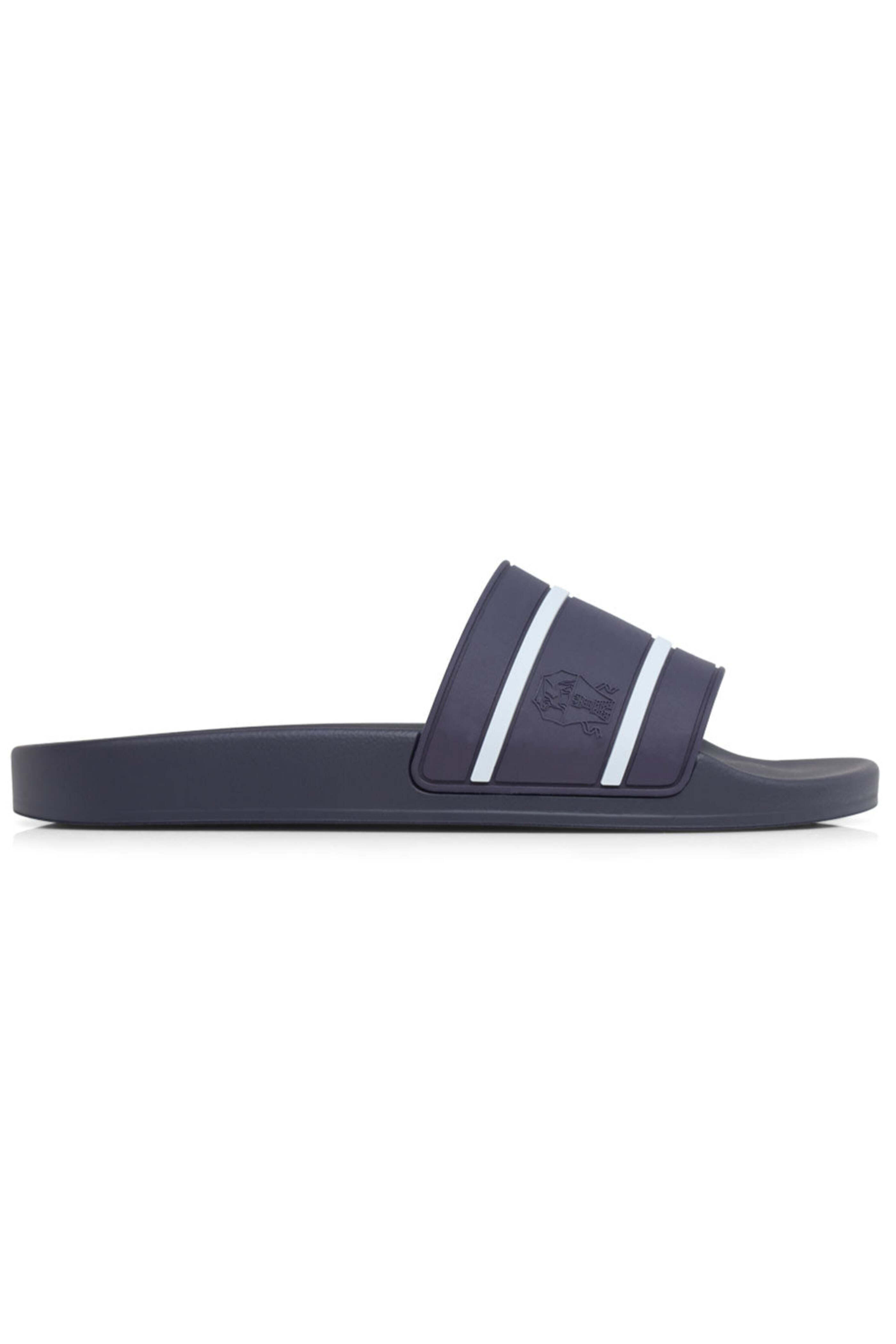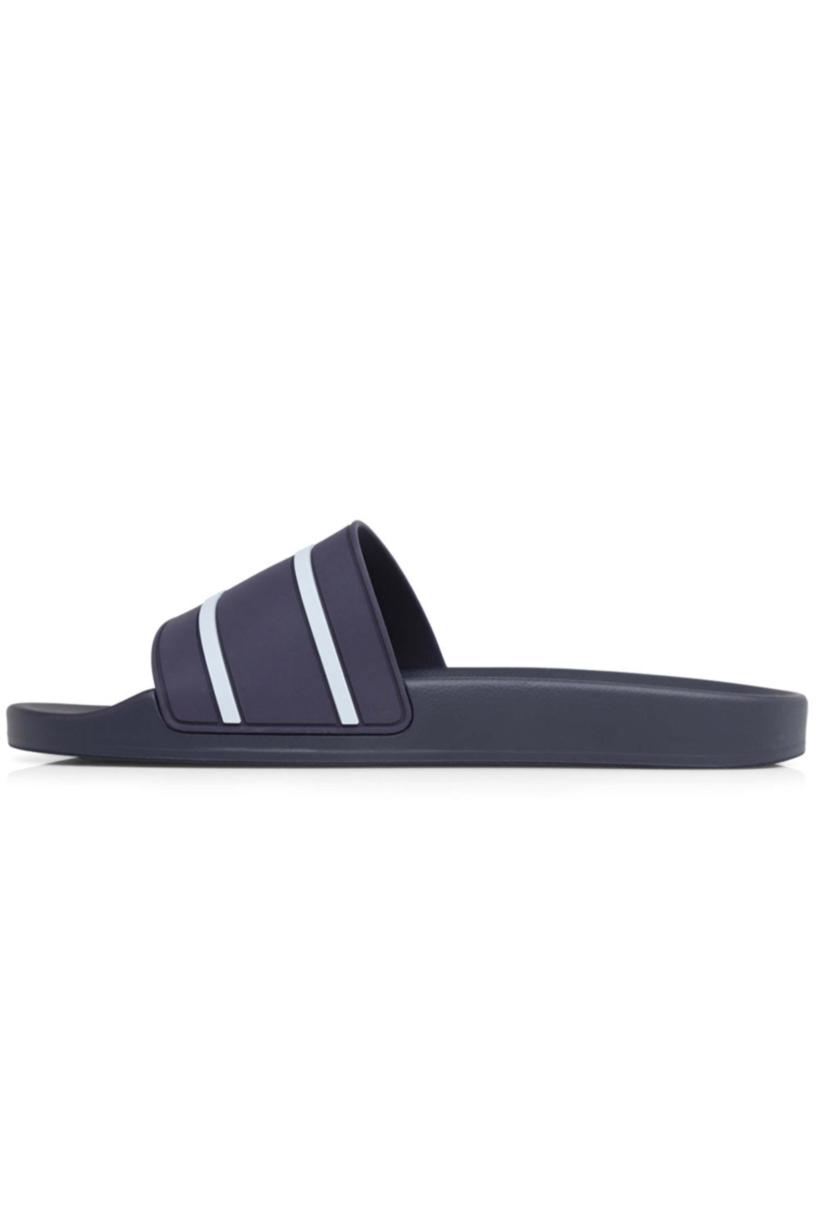 Brunello Cucinelli Slide Sandal in Blue and Grey. Round open toe. Slip-on. Two-toned striping. Polyurethane upper and sole. Made in Italy.