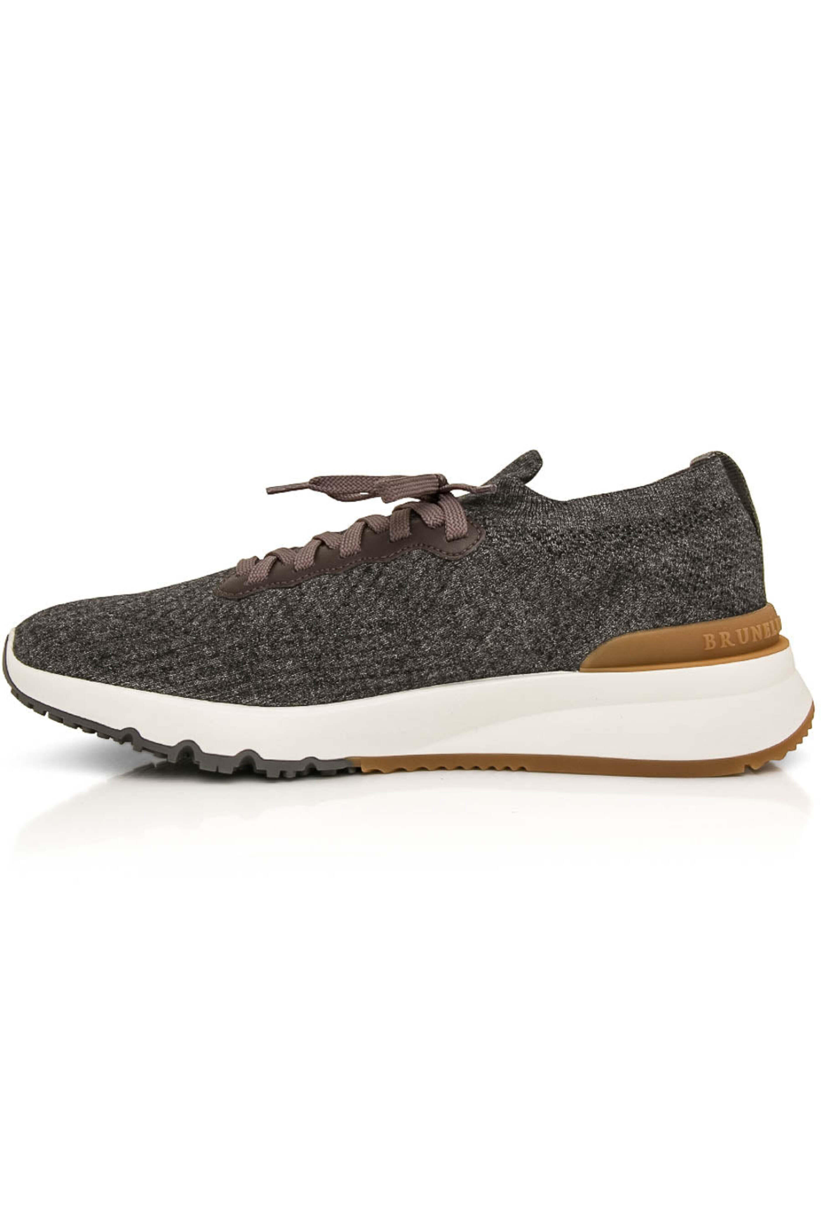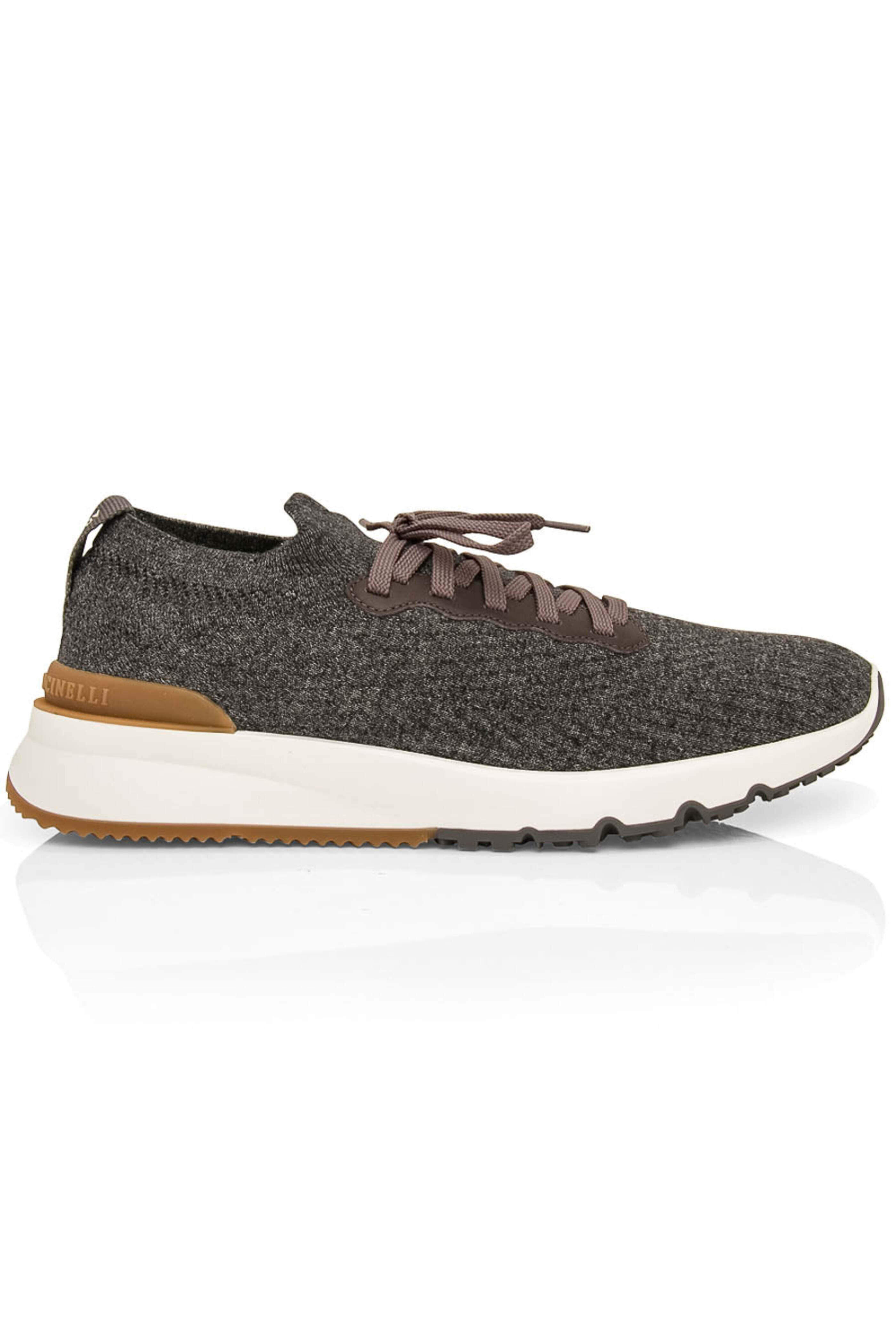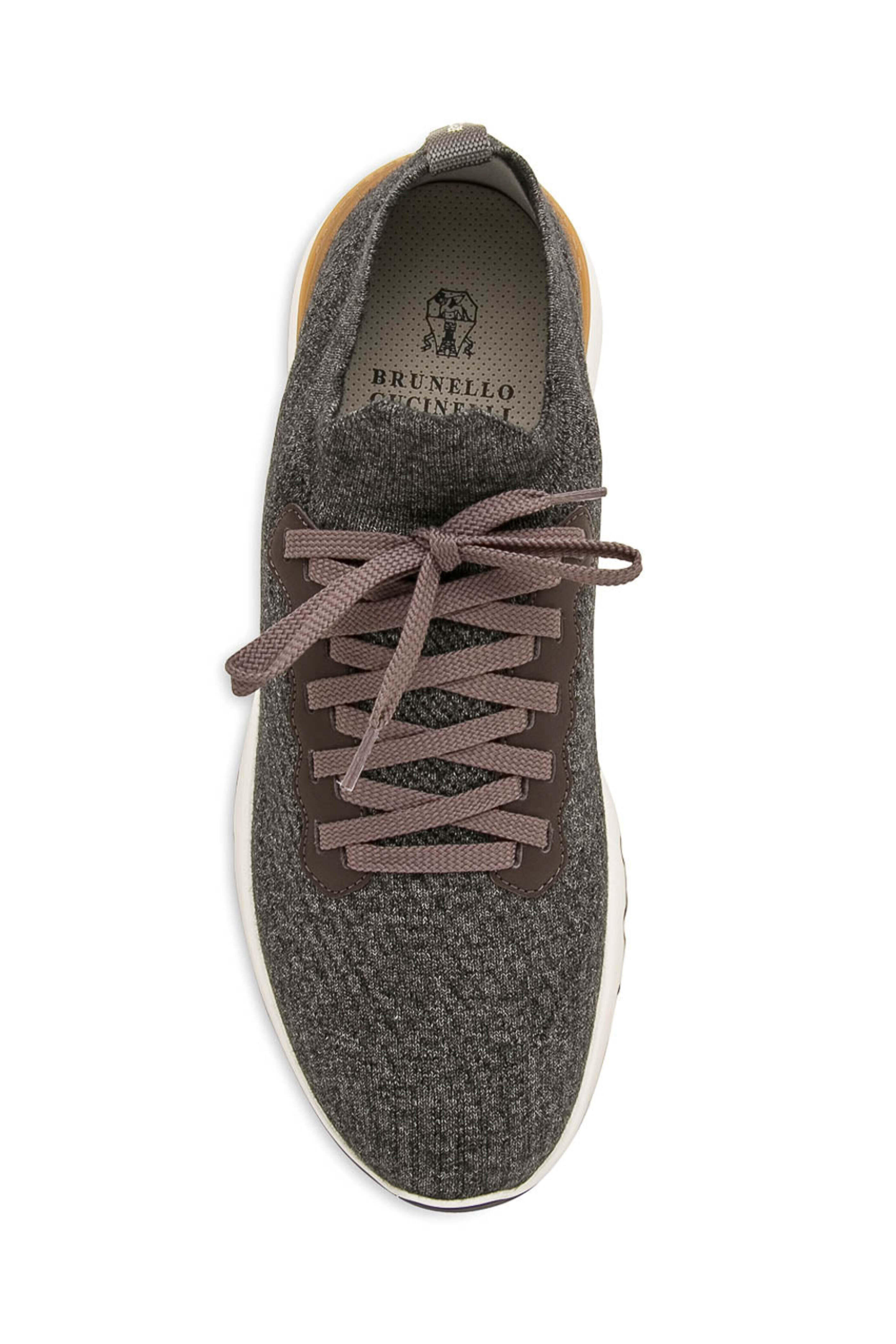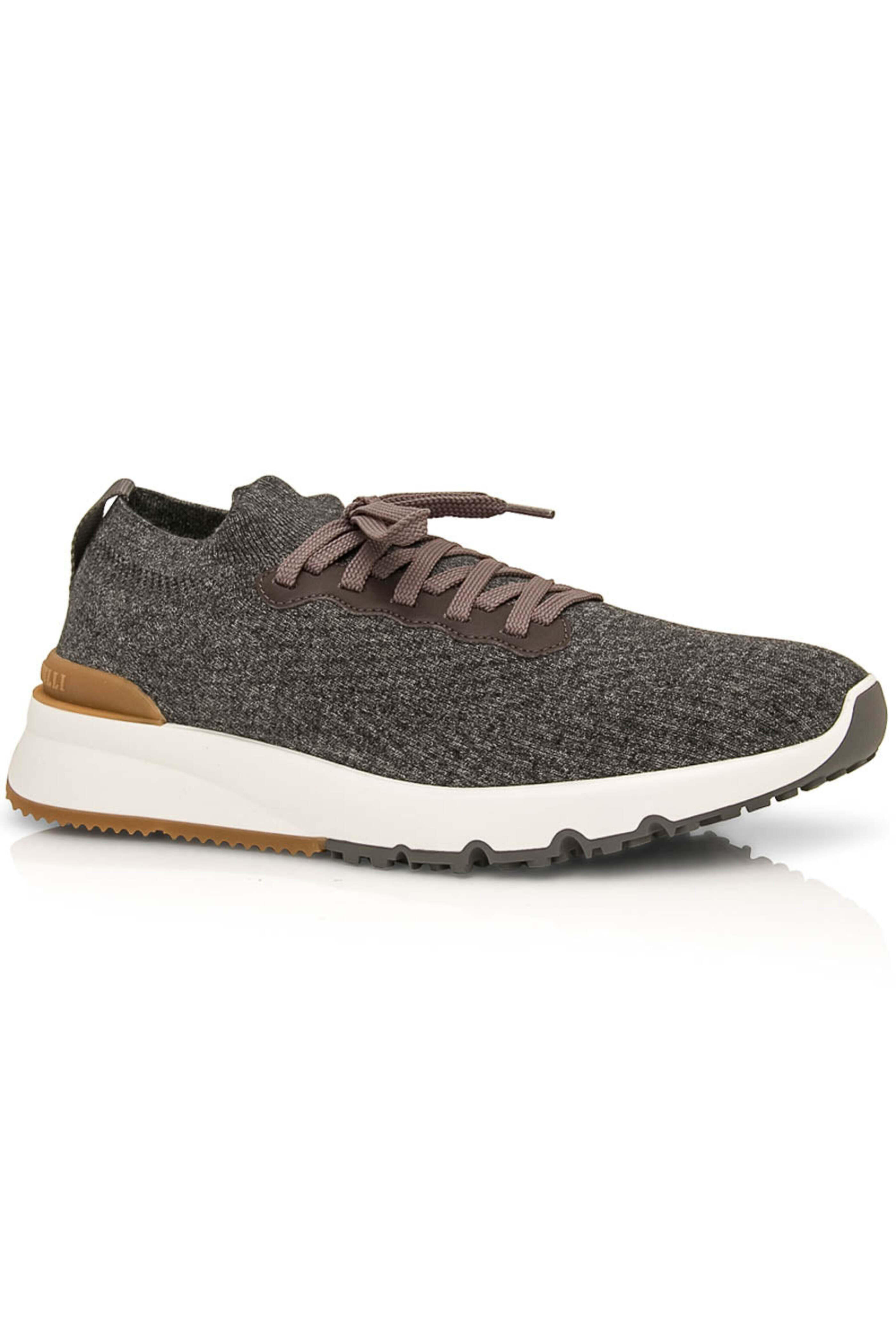 - Brunello Cucinelli Anthracite Cotton Knit Sneaker Cotton knit upper Lace up front Leather trim Rounded toe Leather insole Cushioned footbed Rubber sole Made in Italy