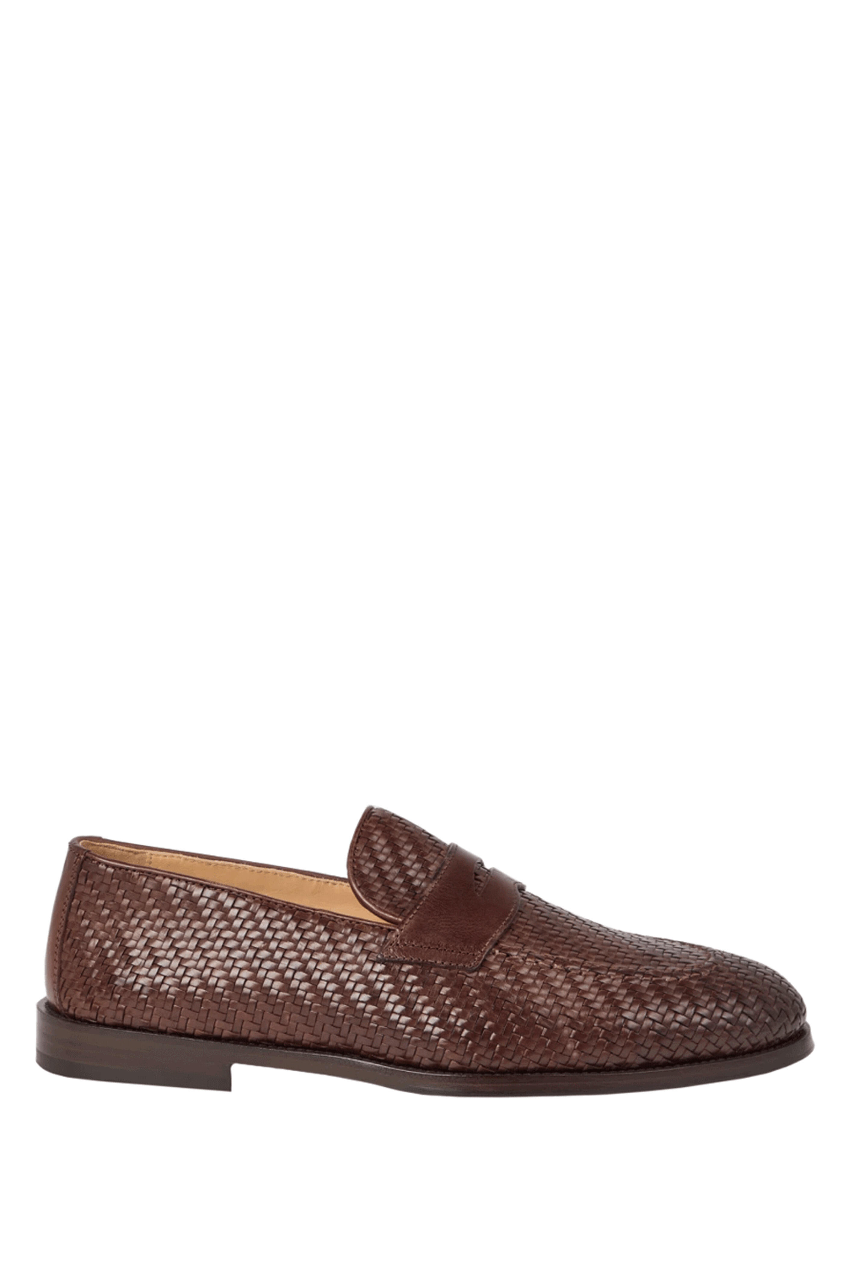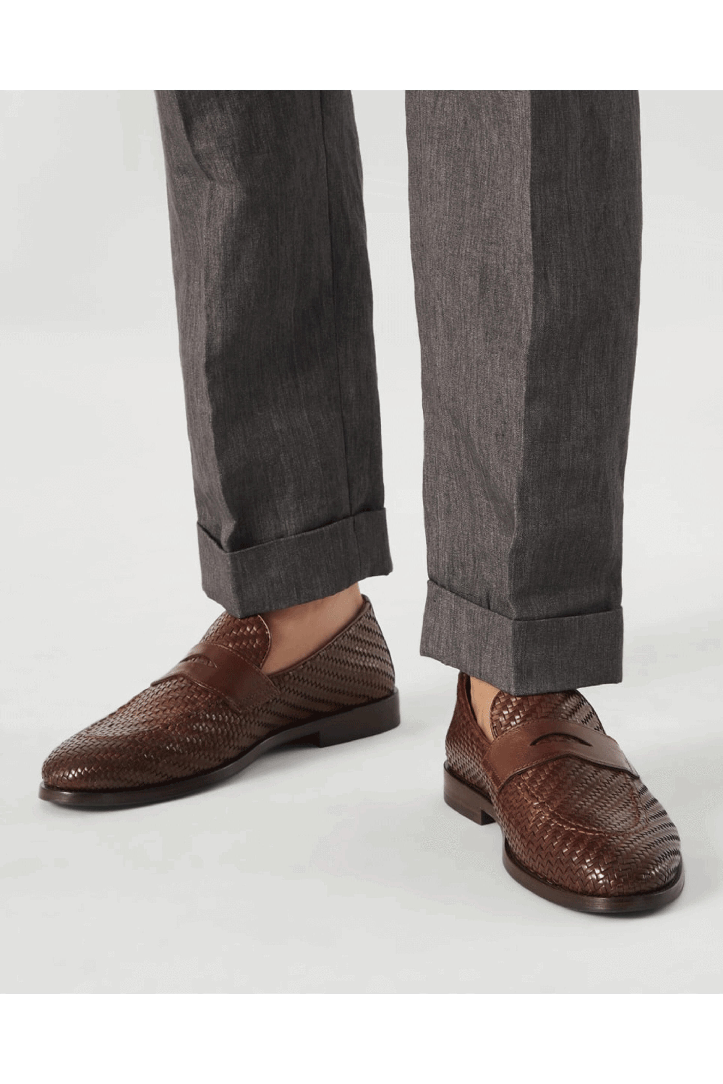 Calfskin leather upper. Almond toe. Slip-on style. Interwoven design. Penny slot. Low stacked heel. Leather lining and sole. Made in Italy. All sizes listed are in US measurements .