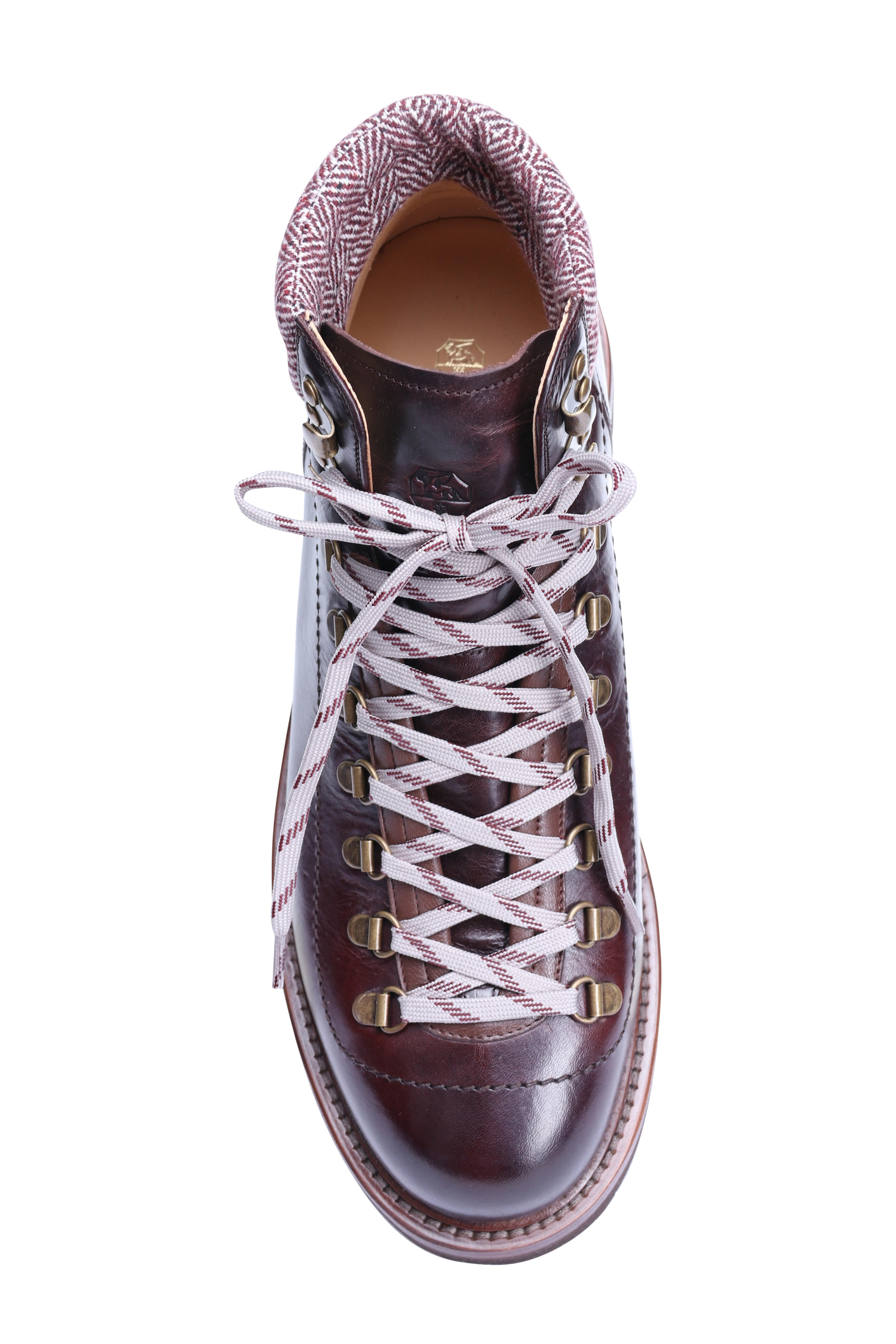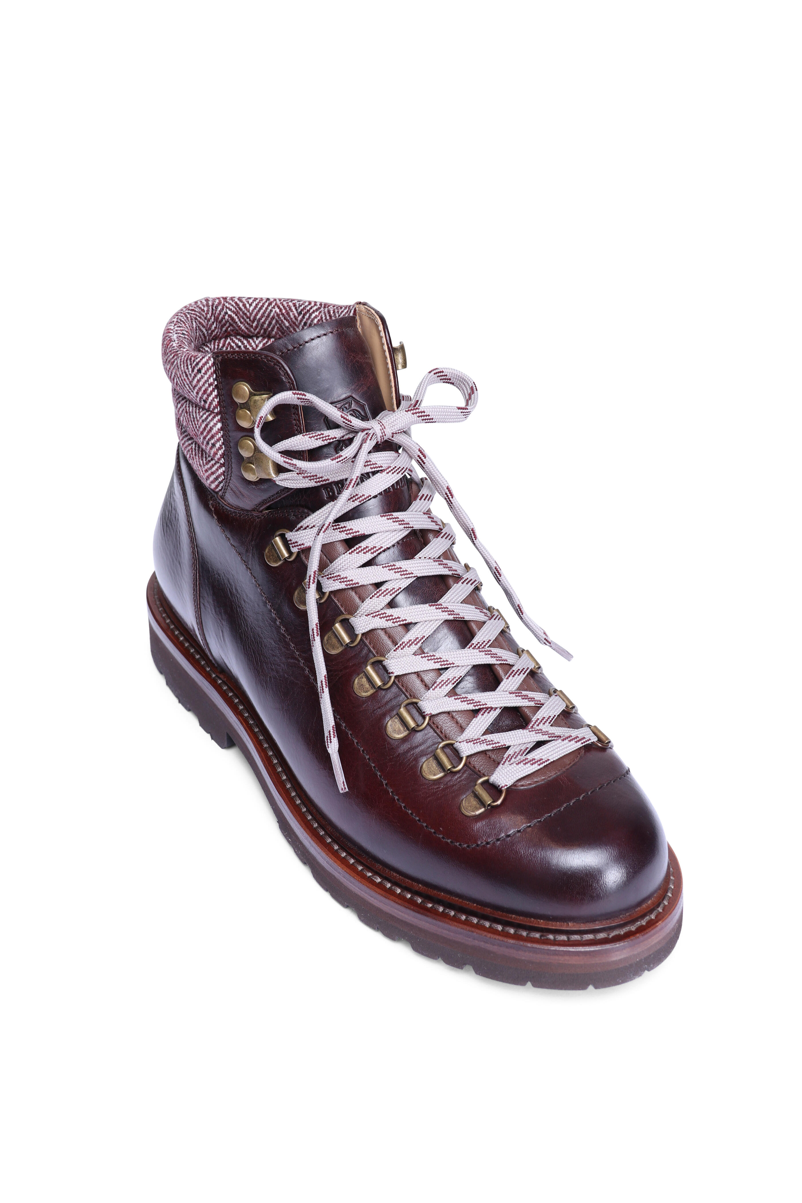 Calfskin leather upper. Leather lining and sole. TPU rubber tread outsole. Round toe. Lace-up vamp. Flat cotton tow-tone laces. Metal d-rings. Wool and cashmere back tab. Pull-on style. Made in Italy. All sizes listed are in US measurements.