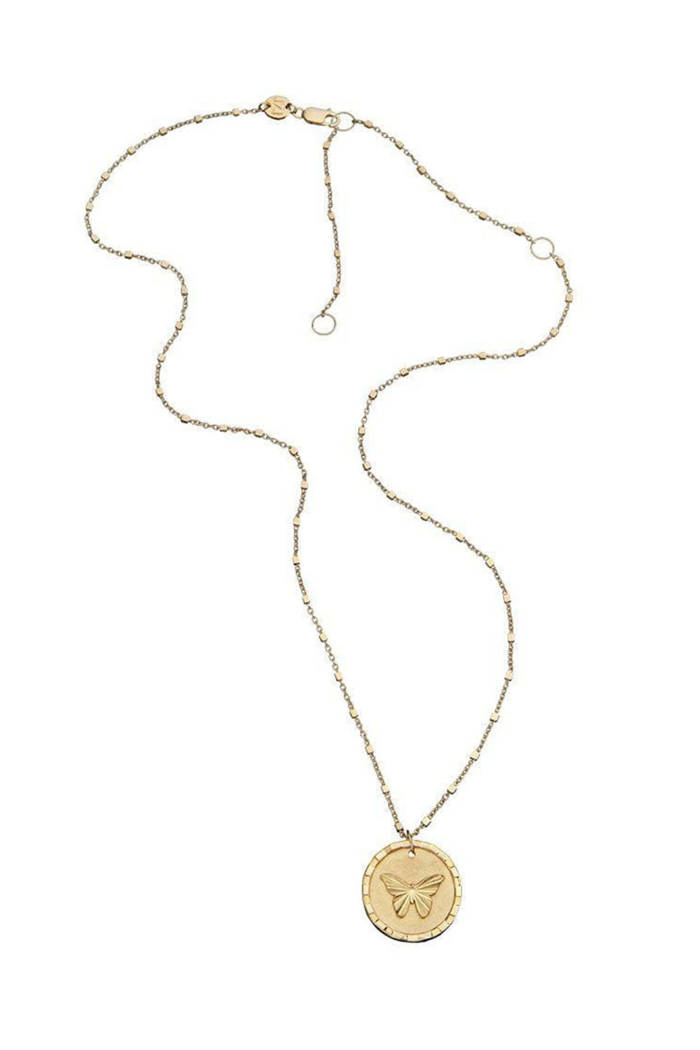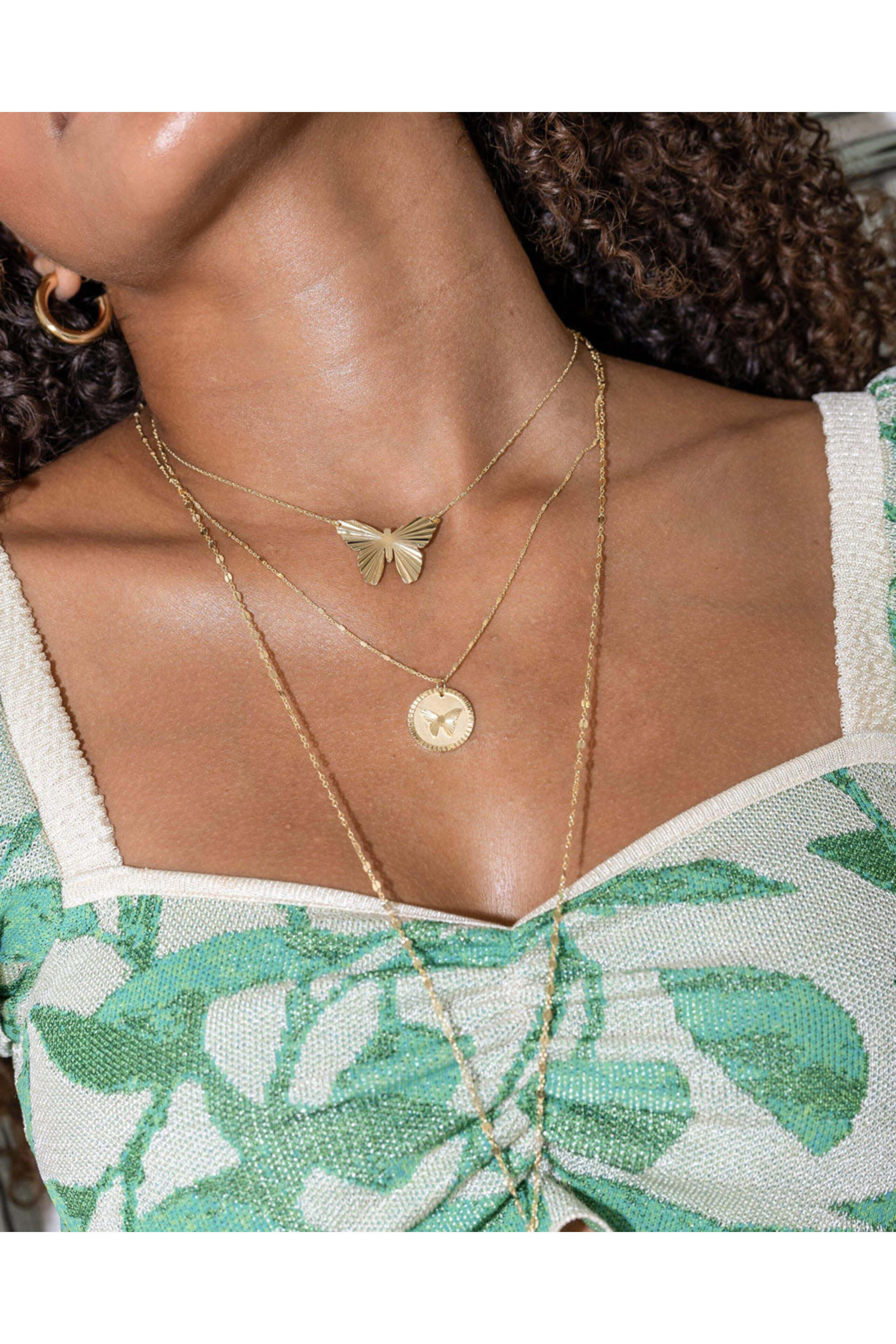 Jennifer Zeuner Amelia Necklace. 14k yellow gold vermeil. Butterfly motif. Chain link. Chain: 16/18/20 L. Pendant: 0.75 L. Adjustable lobster claw closure.