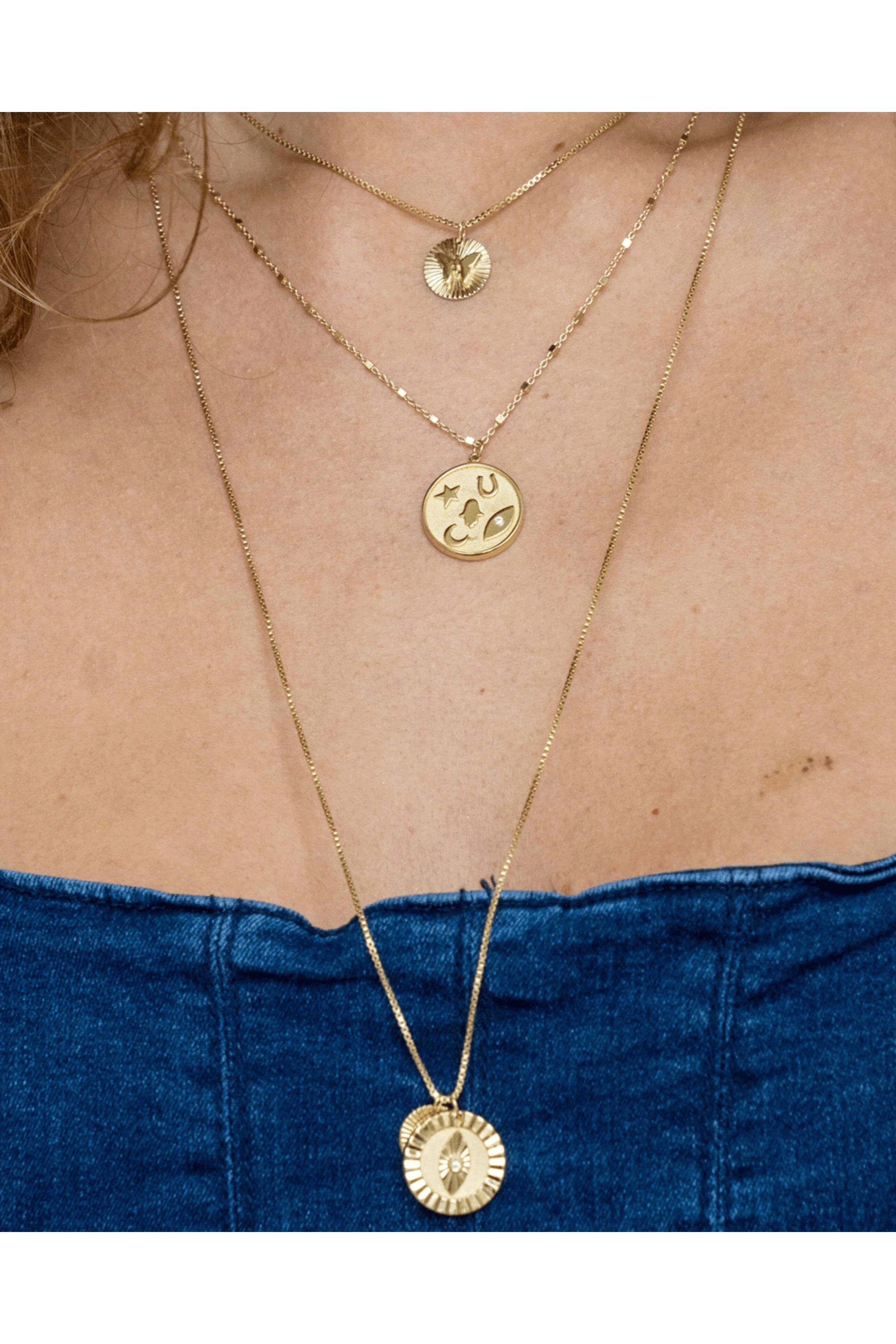 Jennifer Zeuner Jewelry Gold Vermeil Jolene Two Charm Necklace. Gold vermeil. Diamond: 0.015 pt.. Box chain style. Adjustable chain length: 25-27. 0.75 pendant with 0.5 evil eye. 0.5 radical circle with 0.25 hamsa. Lobster claw clasp.