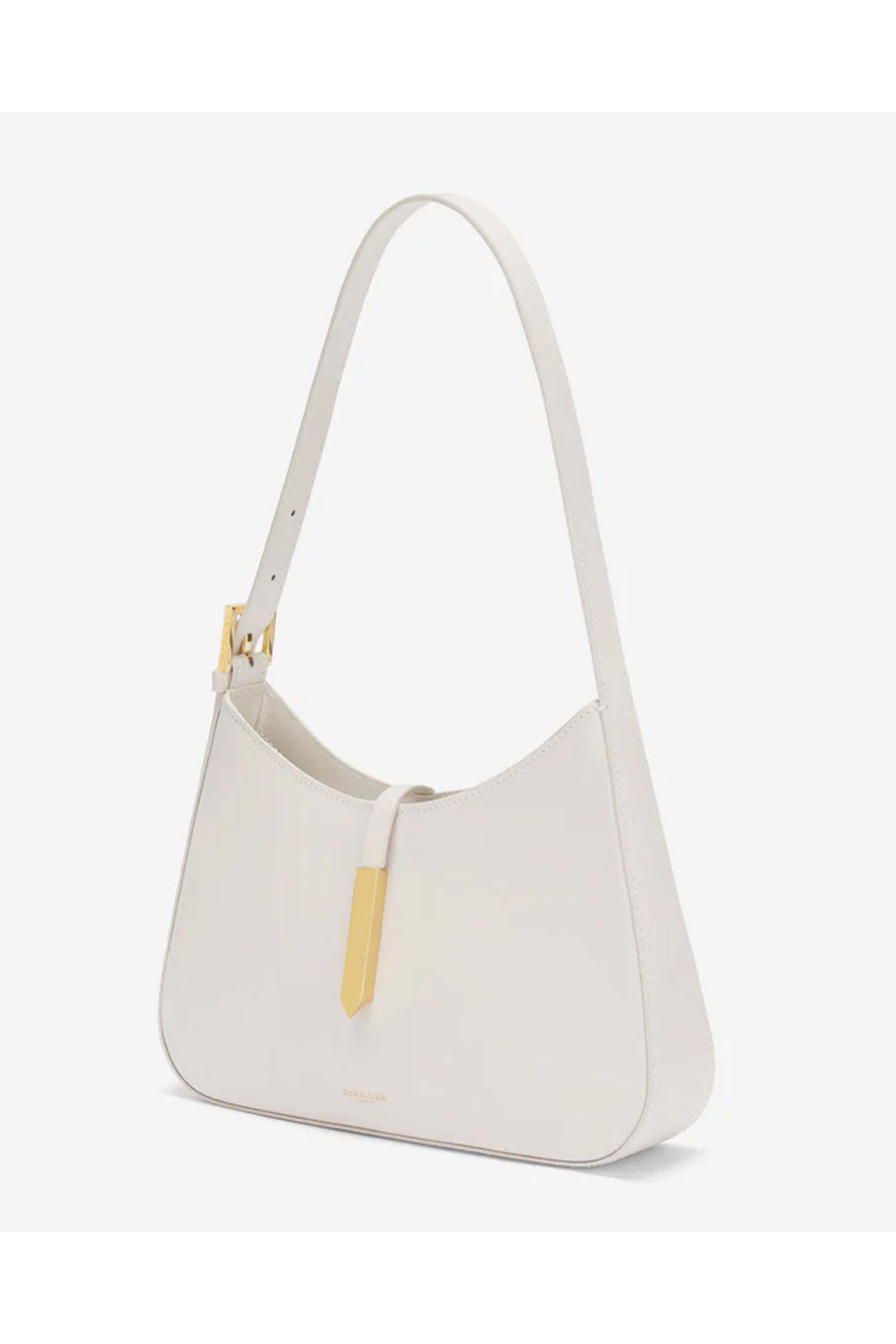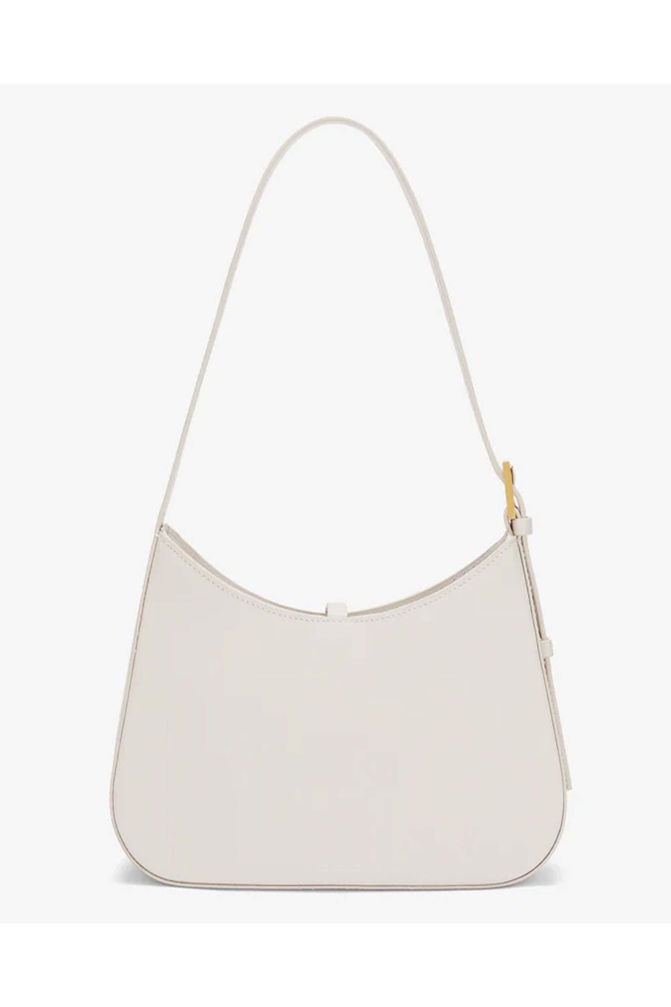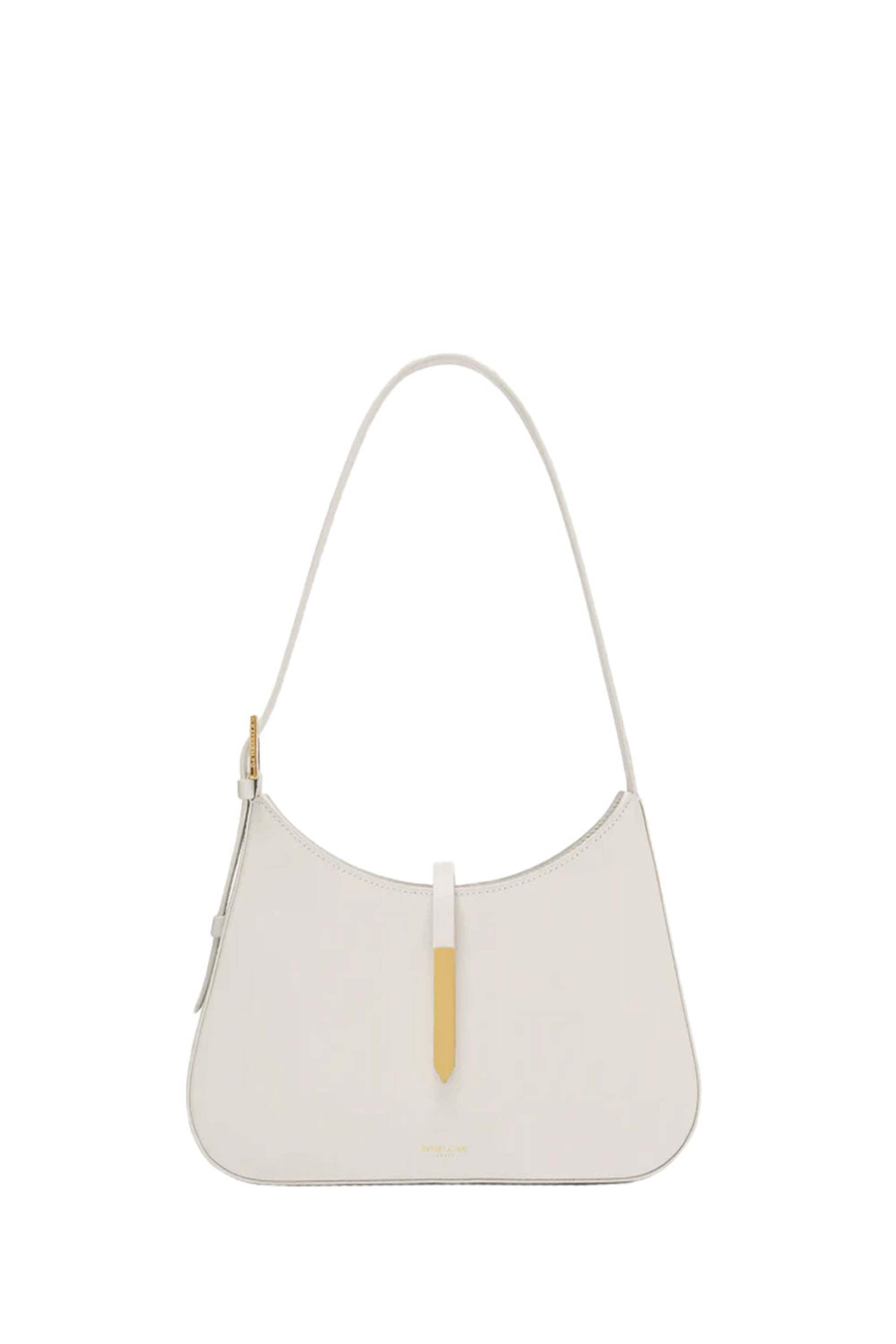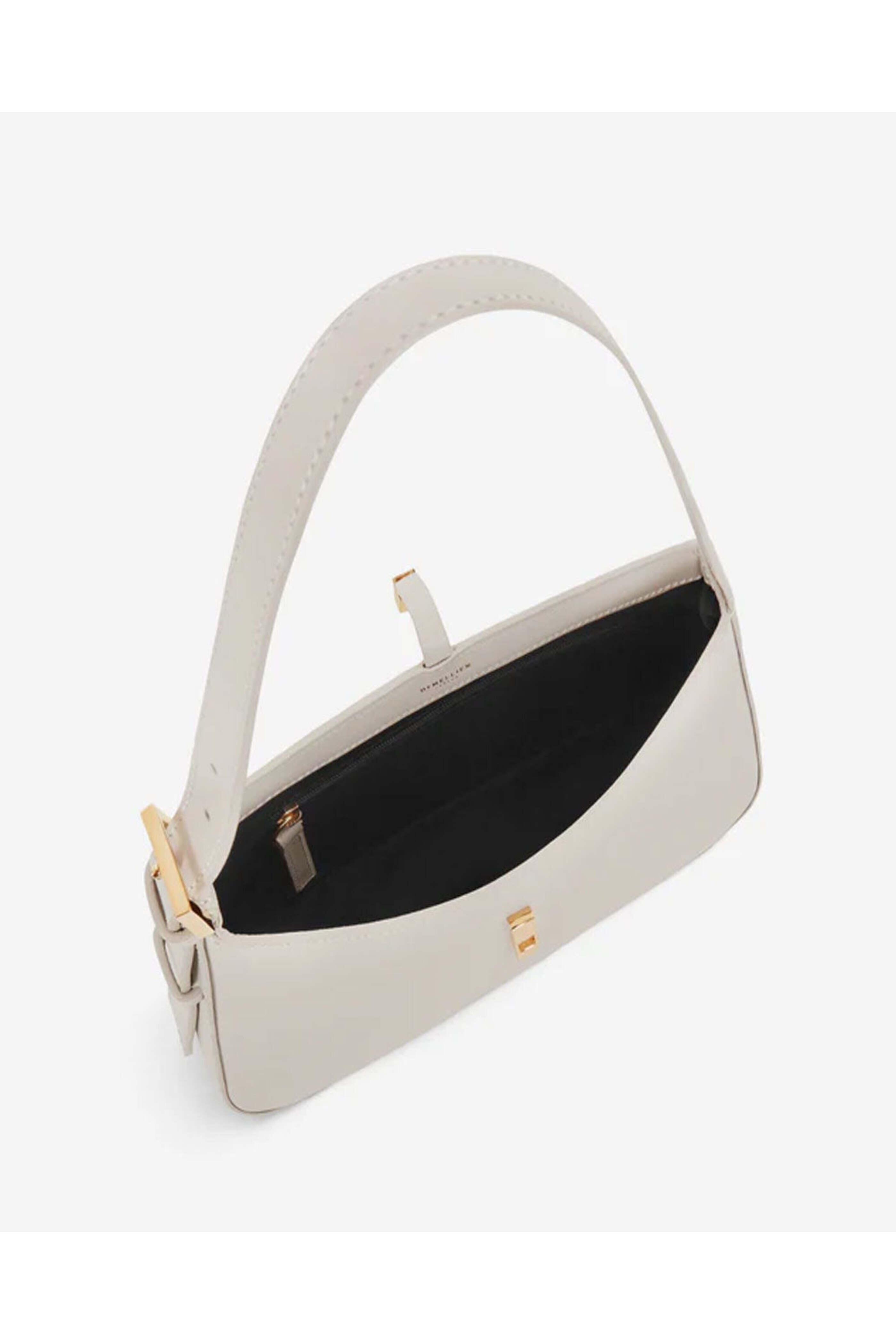 Demellier Tokyo Bag in Off White. Arrow shaped lock. Adjustable shoulder strap. Interior zip pocket. Leather outer. Cotton lining. 10.6W x 5.1H x 2.5D. 11 handle drop.