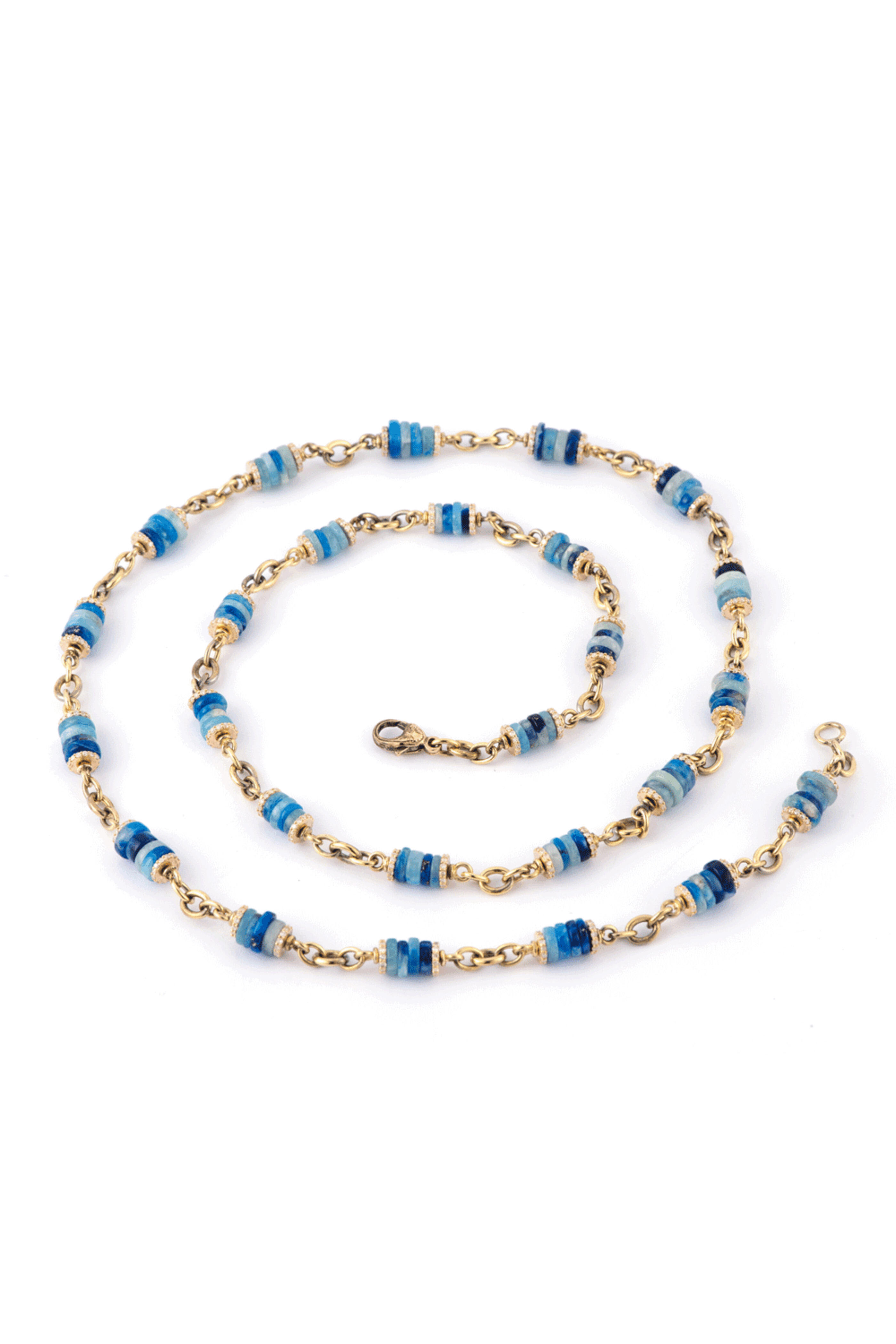 18k gold. Diamond. Afganite. Rondel design. Beaded. Chain links. Lobster claw clasps. Made in the USA. 25 L.