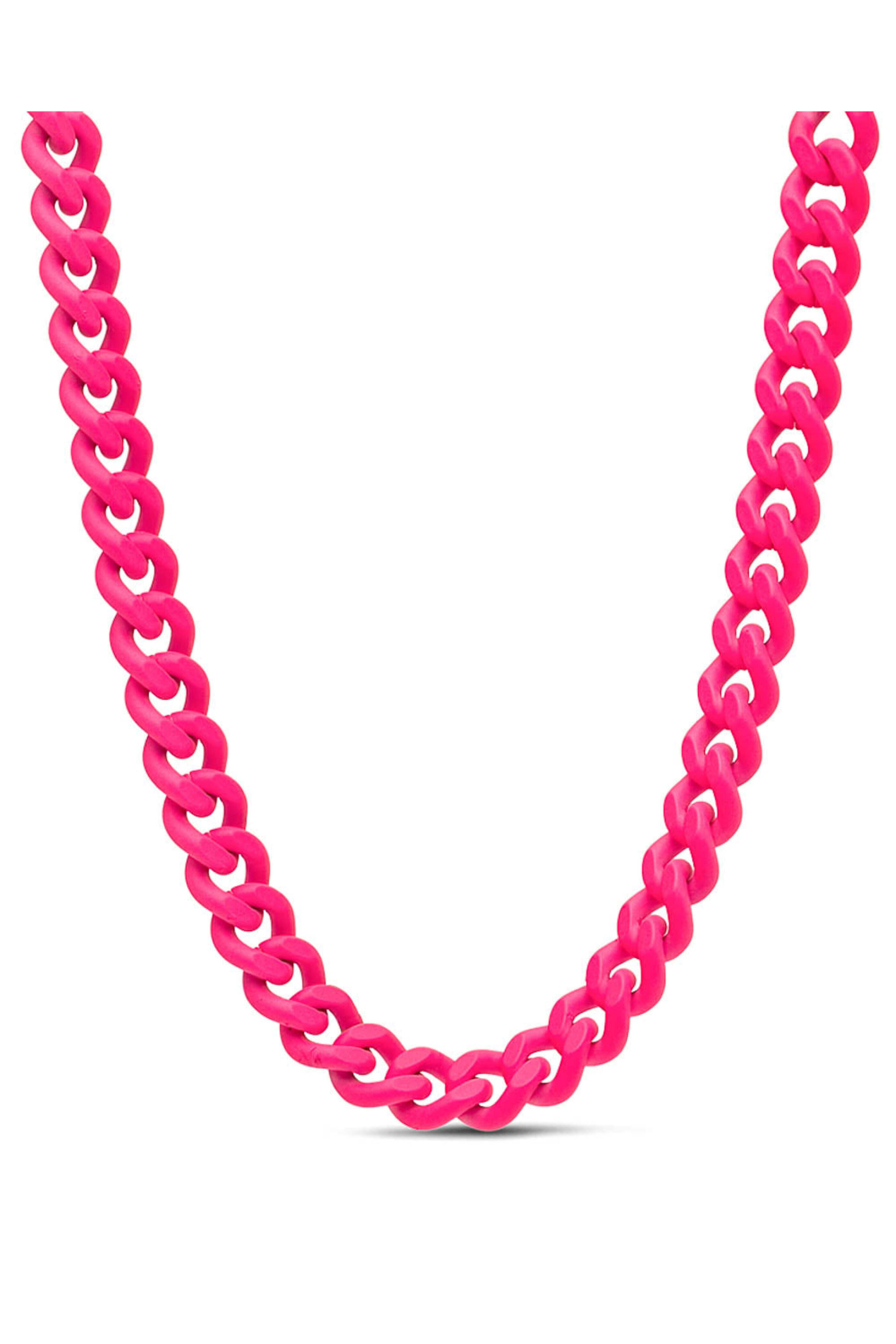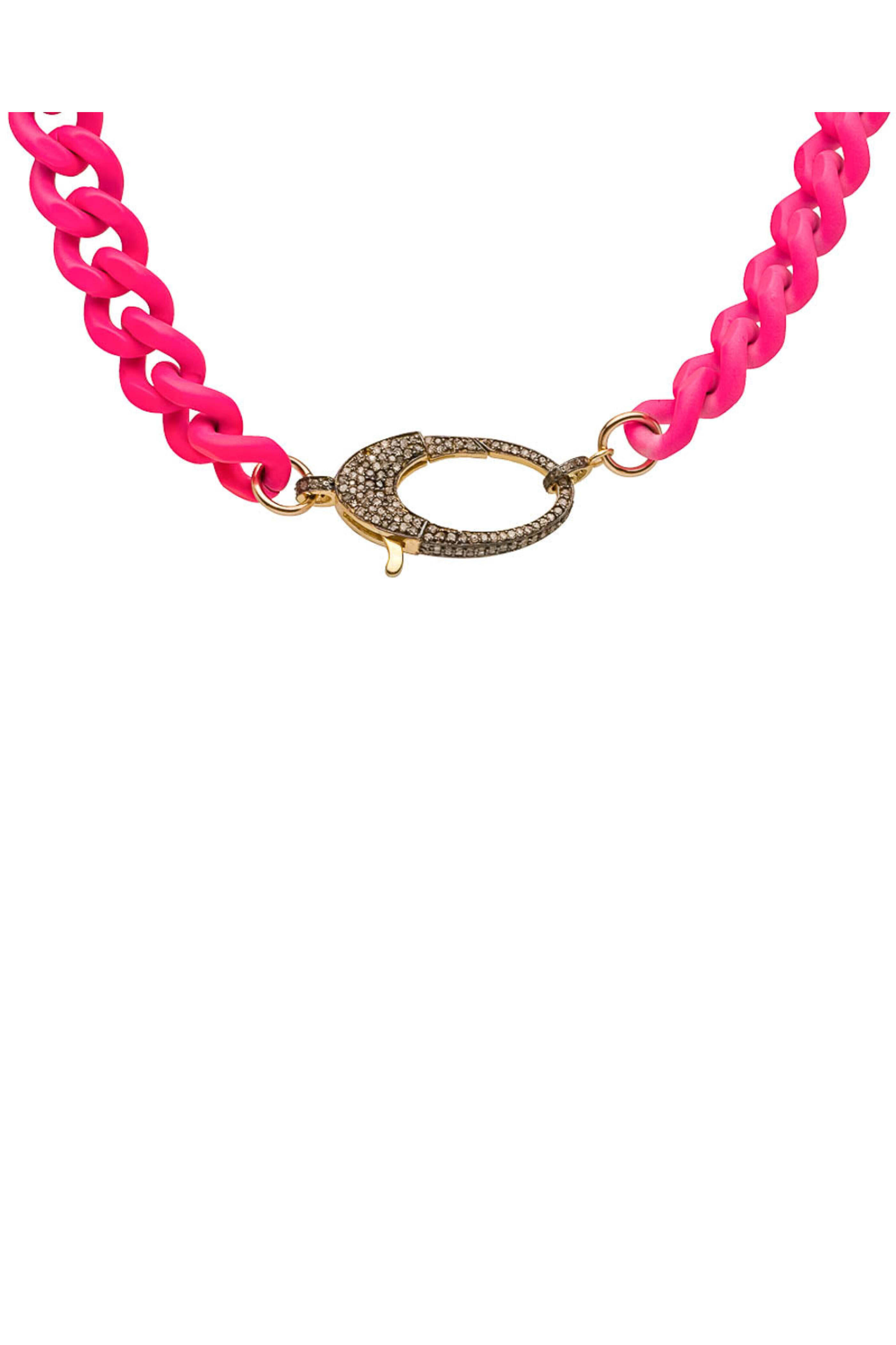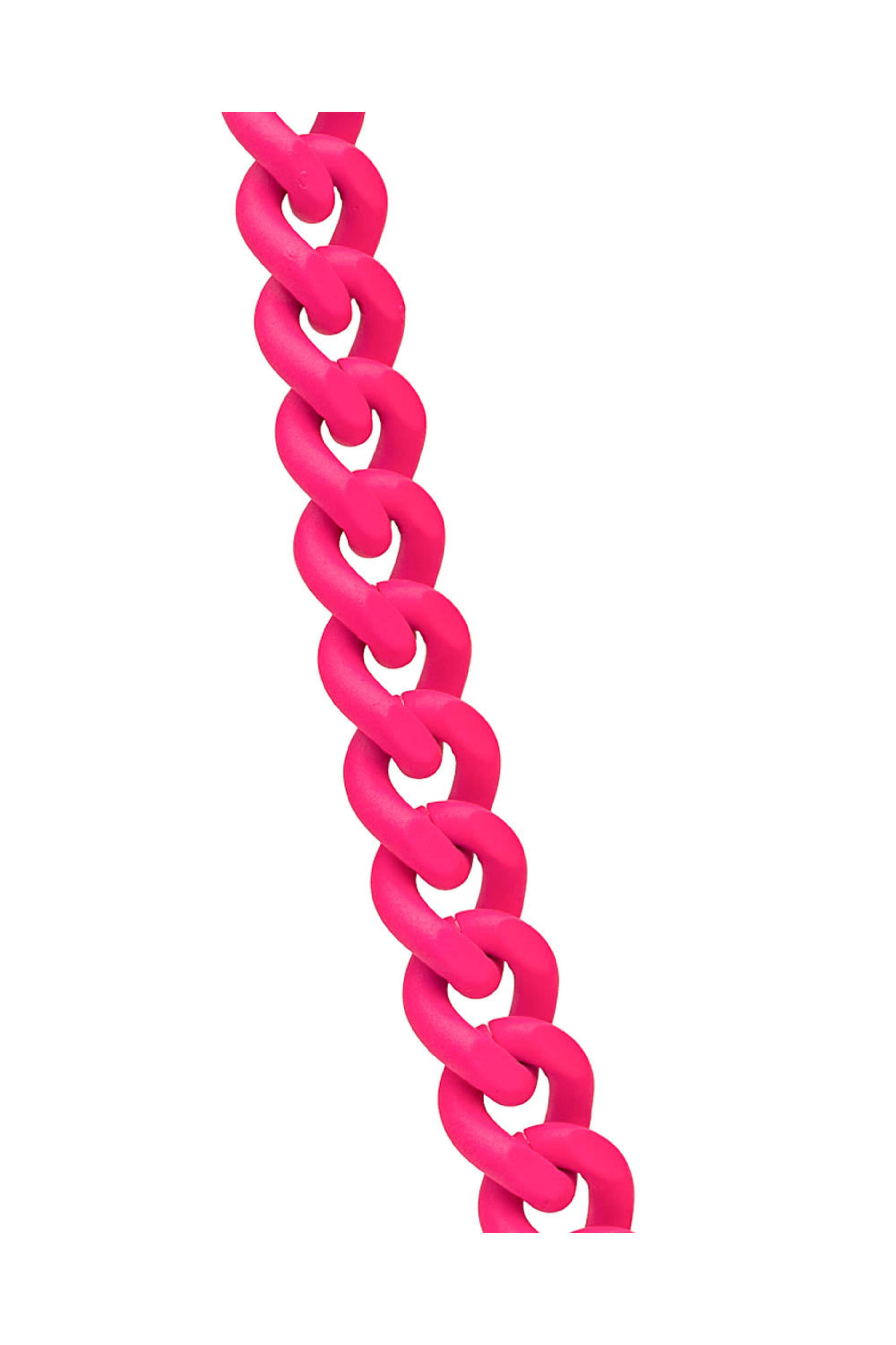 Royal Nomad Diamond Embellished Neon Pink Link Necklace Brass Diamonds Neon pink chain Large link design Individual link: 0.425 L x 0.25 W 16 long Diamond embellished oversized clasp Lobster claw clasp: 0.50.