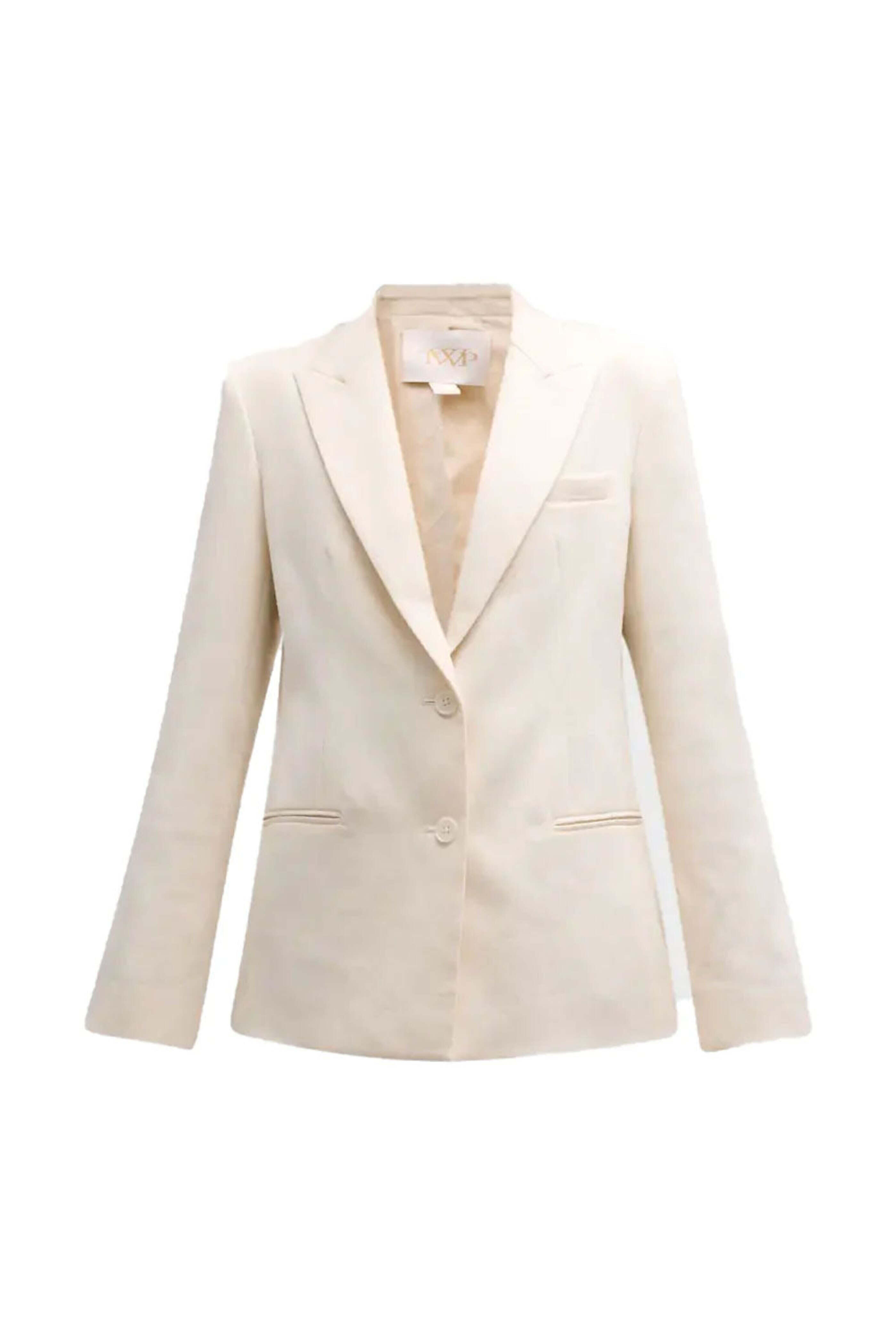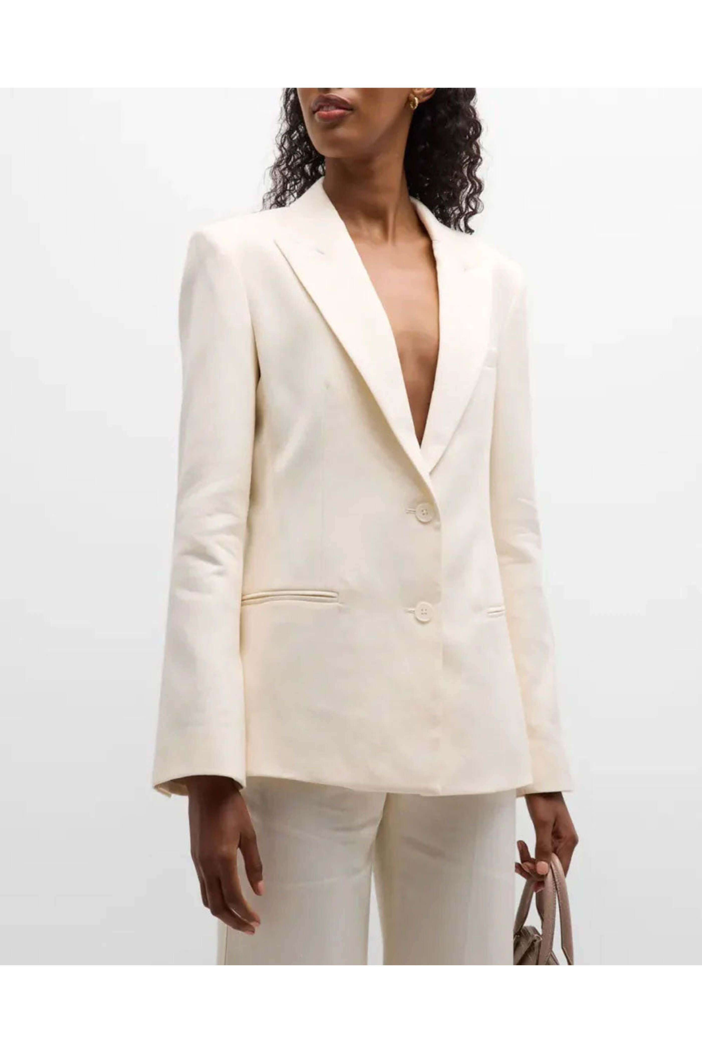 TWP Husband Blazer in Bone . Peak lapels. Long sleeves; button cuffs. Button front closure . Chest welt pocket; hip besom pockets. Relaxed fit. 44% linen 29% cotton 27% lyocell.