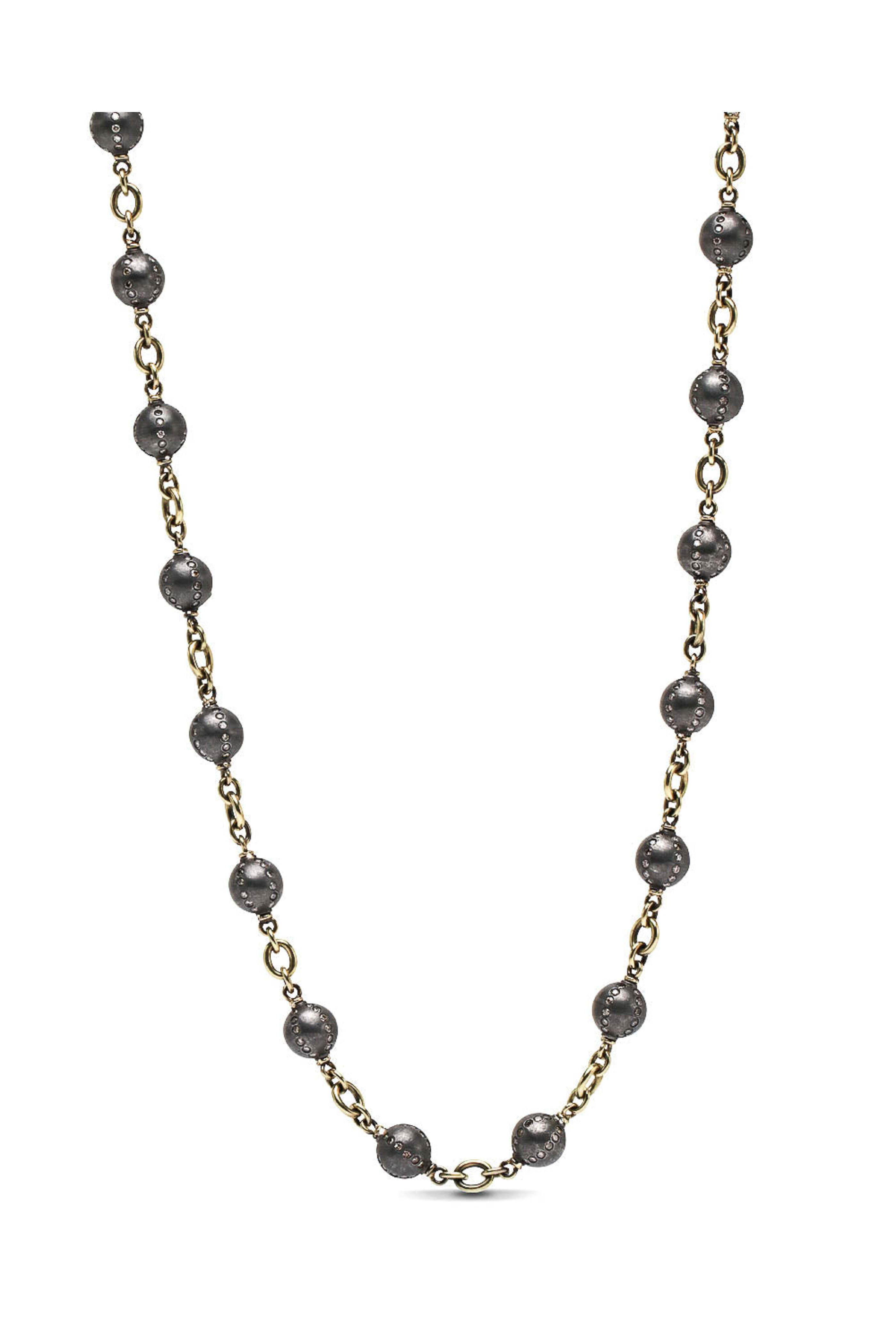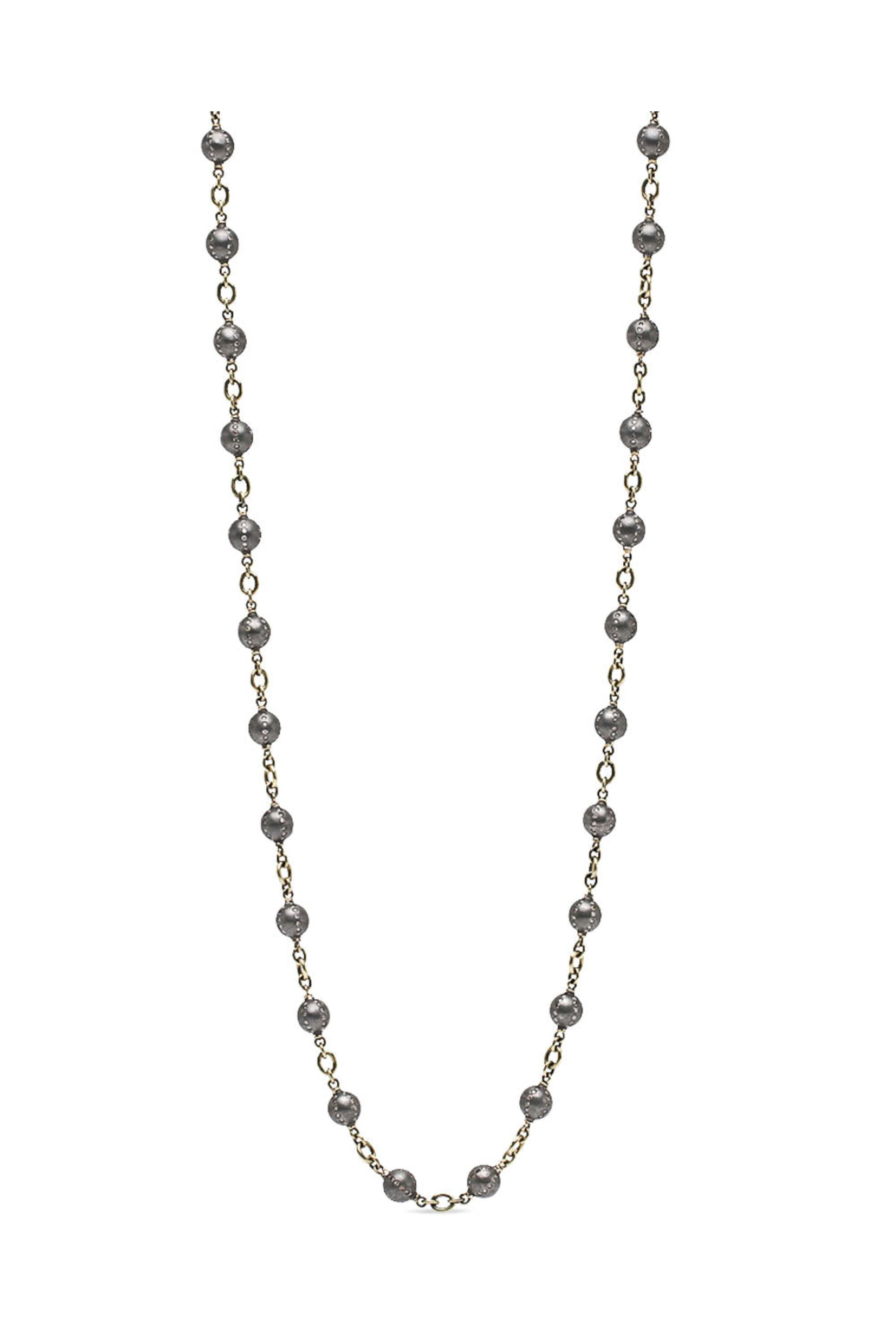 - Sylva & Cie Sterling Silver Bead Necklace with Diamonds 18k yellow gold Sterling silver beads encrusted with diamonds Lobster clasp closure 9.92 carat total weight diamonds Beads: 8 mm Length: 31