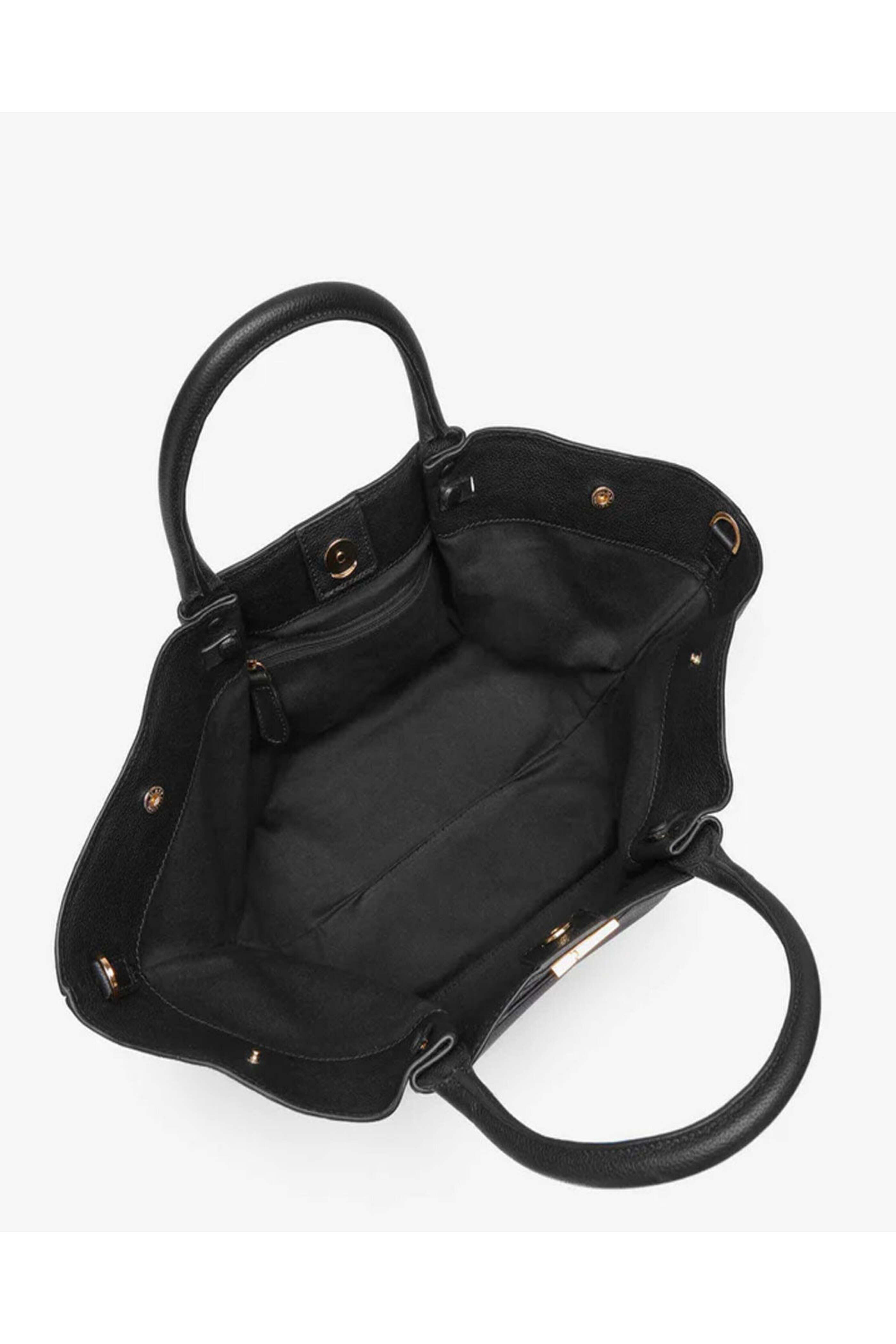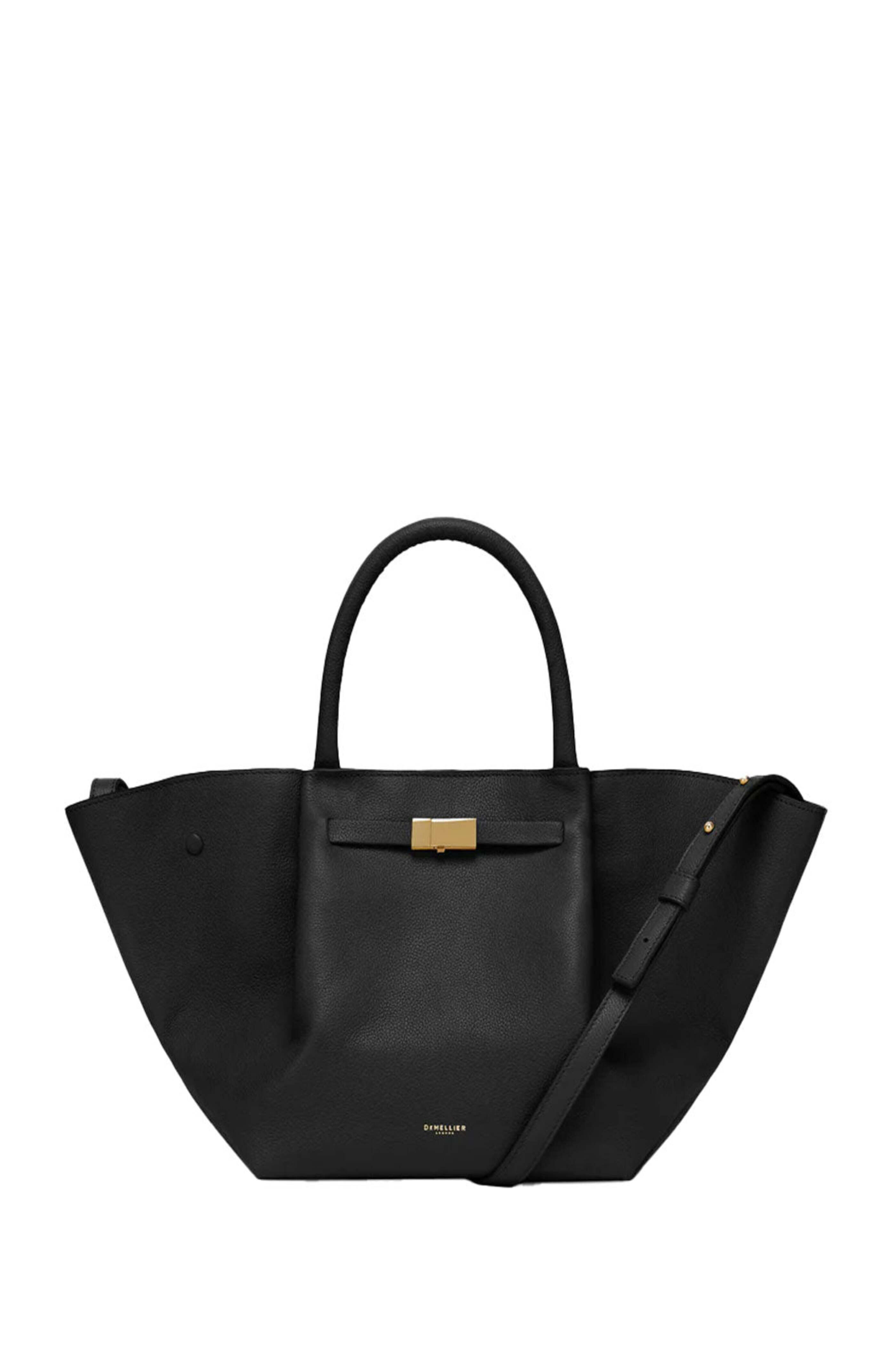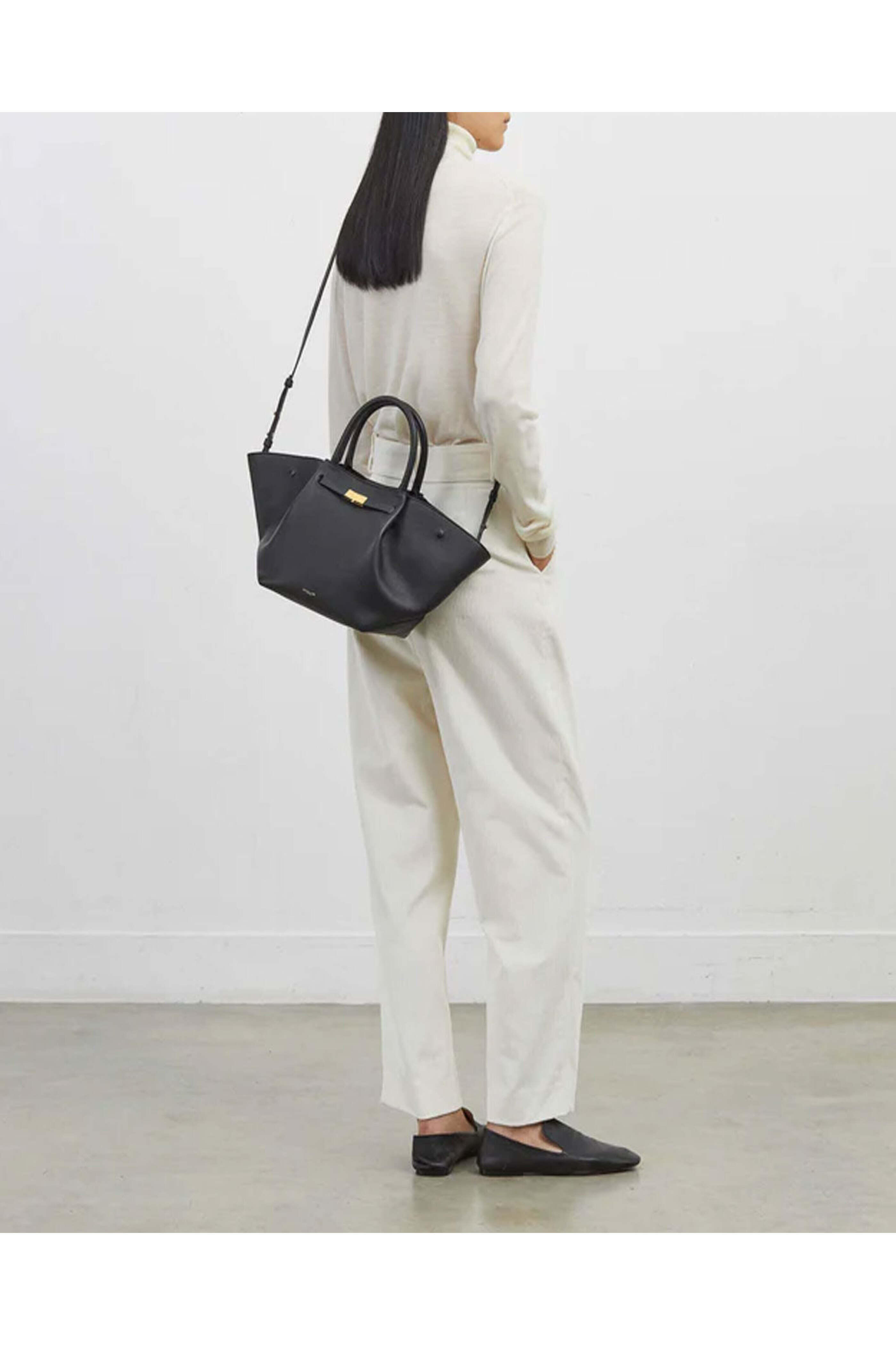 Demellier Midi New York Bag in Black. Magnetic closure. Dual top handles. Adjustable crossbody strap. Belted gold detail. Triangular folds on each side. Metal feet. Internal zip and slip pockets. Leather outer. Cotton lining. 19W x 8.7H x 5.9D. 4.7 handle drop. 19.3 strap drop.