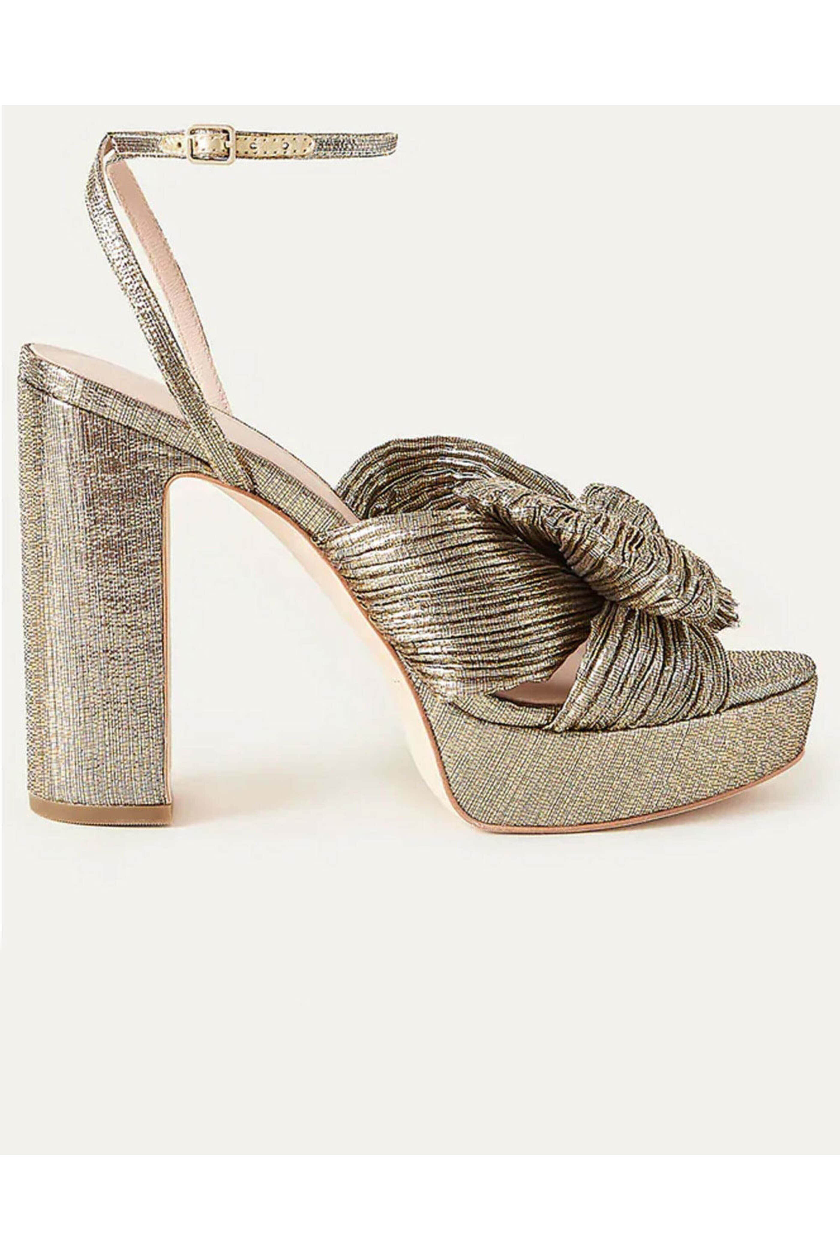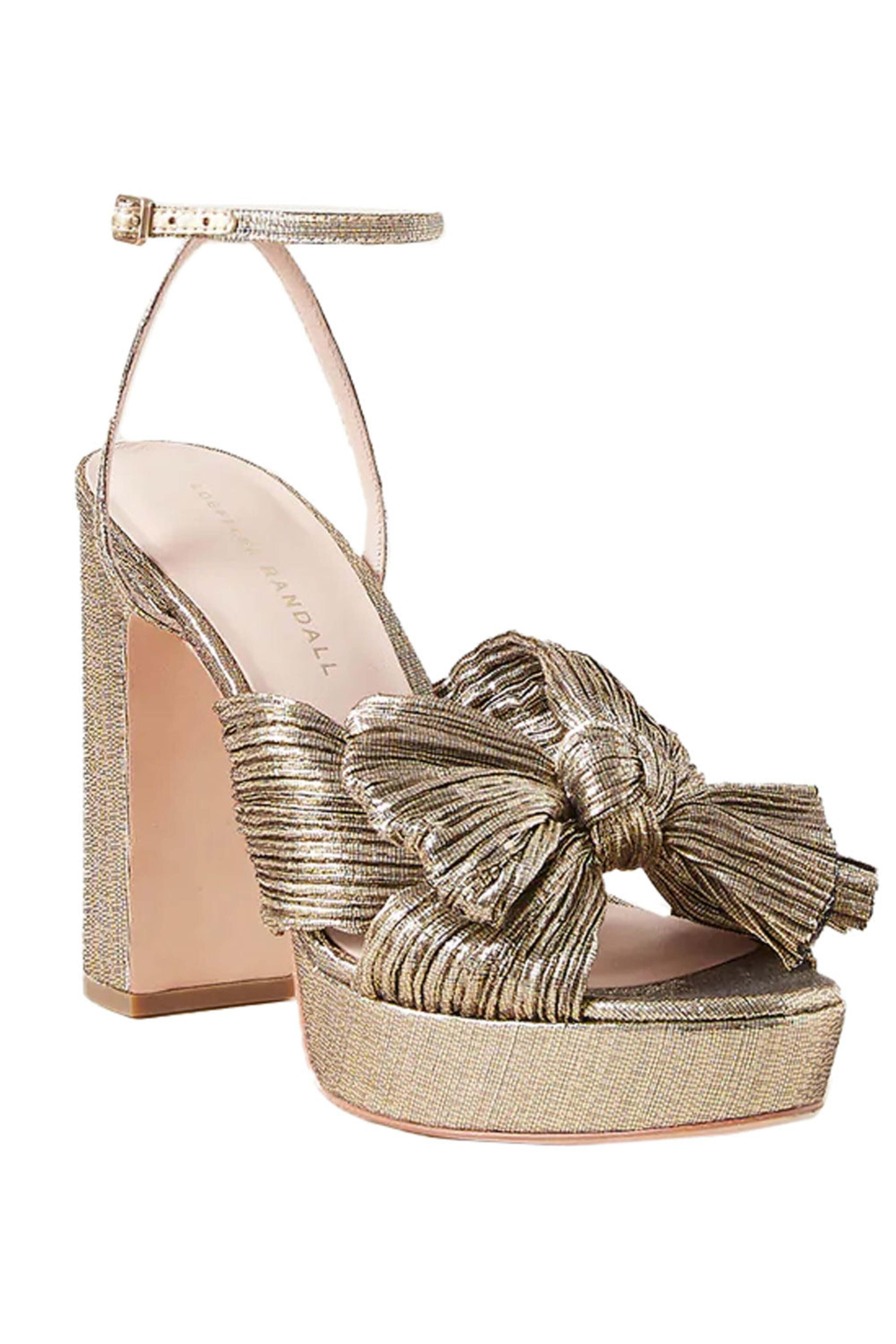 Loeffler Randall Pleated Platform Sandal in Gold. Round open toe. Bow detail strap. Adjustable ankle strap with buckle closure. 4.52 block heel; 1 platform. Silk and polyester upper. Leather lining and sole. Made in Italy.