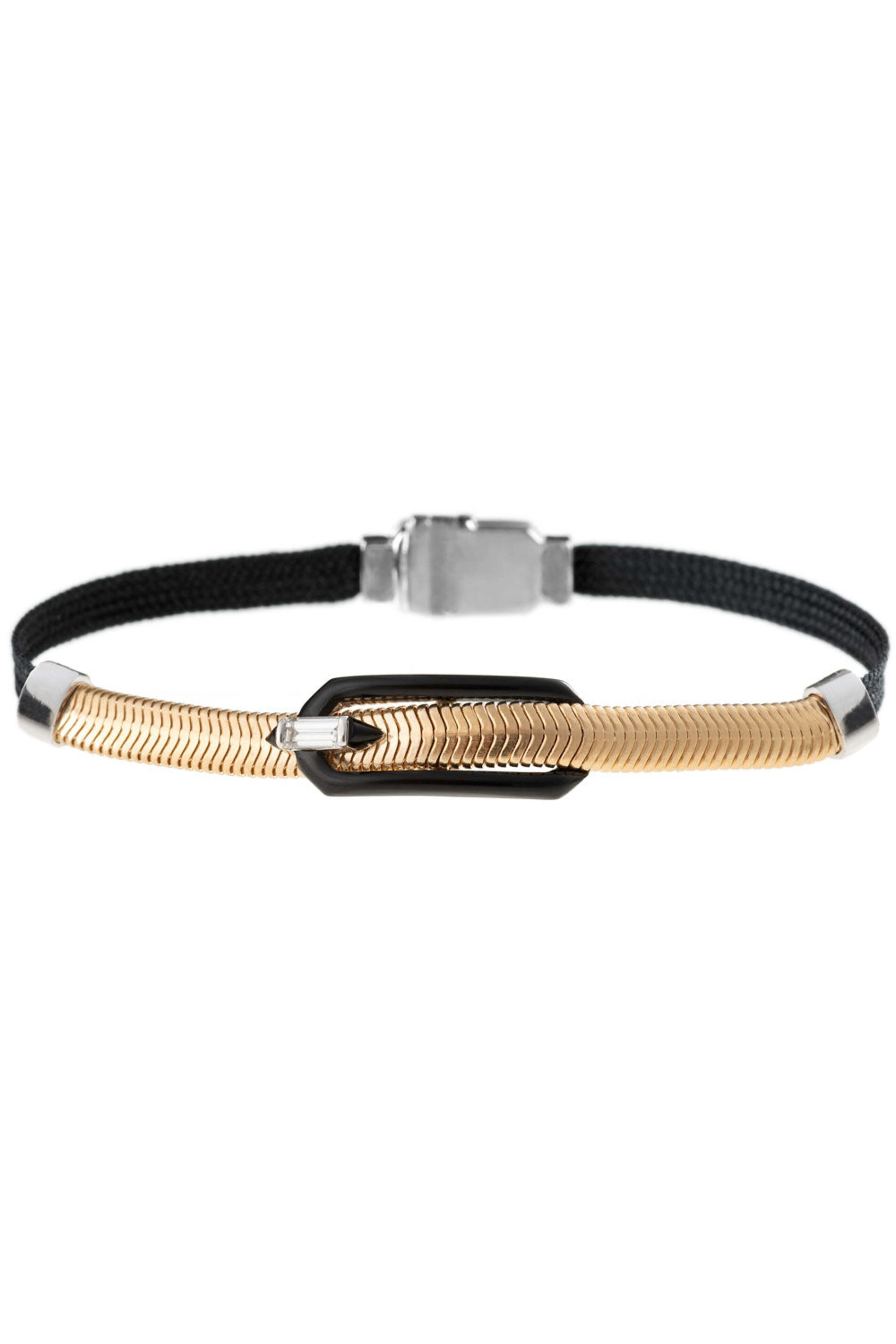 - Nikos Koulis Yellow Gold and Black Enamel Buckle Soft-Bracelet 18k yellow gold Black enamel 0.19 ct. white diamonds Buckle design Soft shell style bracelet Push lock clasp Feelings Collection