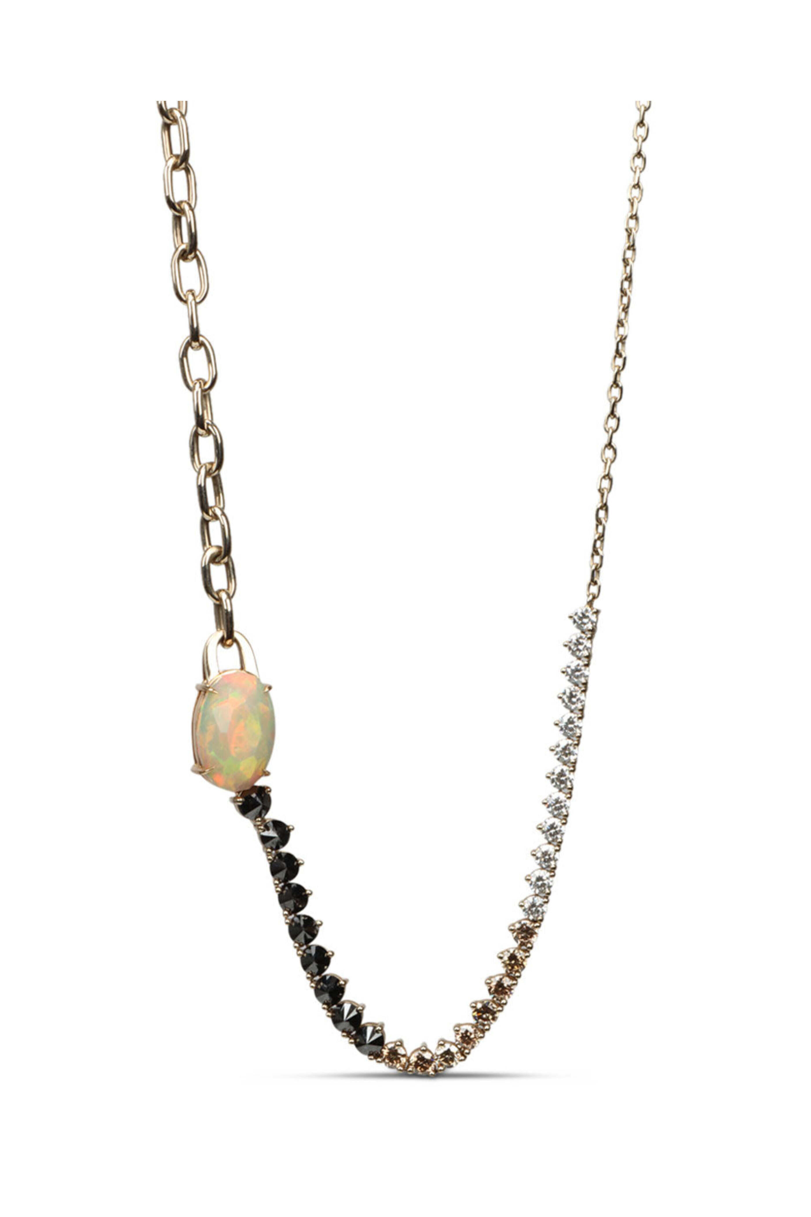18k white gold. Opal 2.40 total carat weight. Black diamond 3.68 total carat weight. River chain. Cable chain. Prong setting. Lobster claw clasps. Made in London.