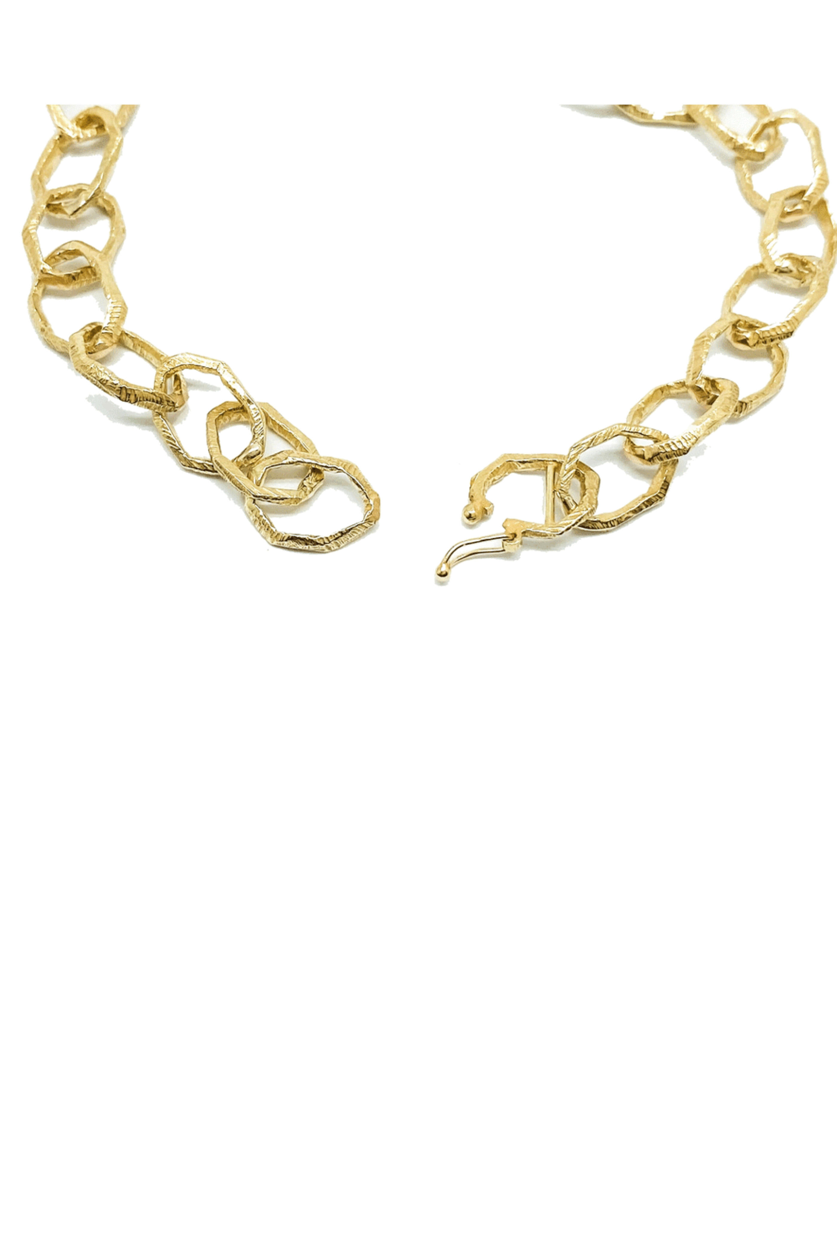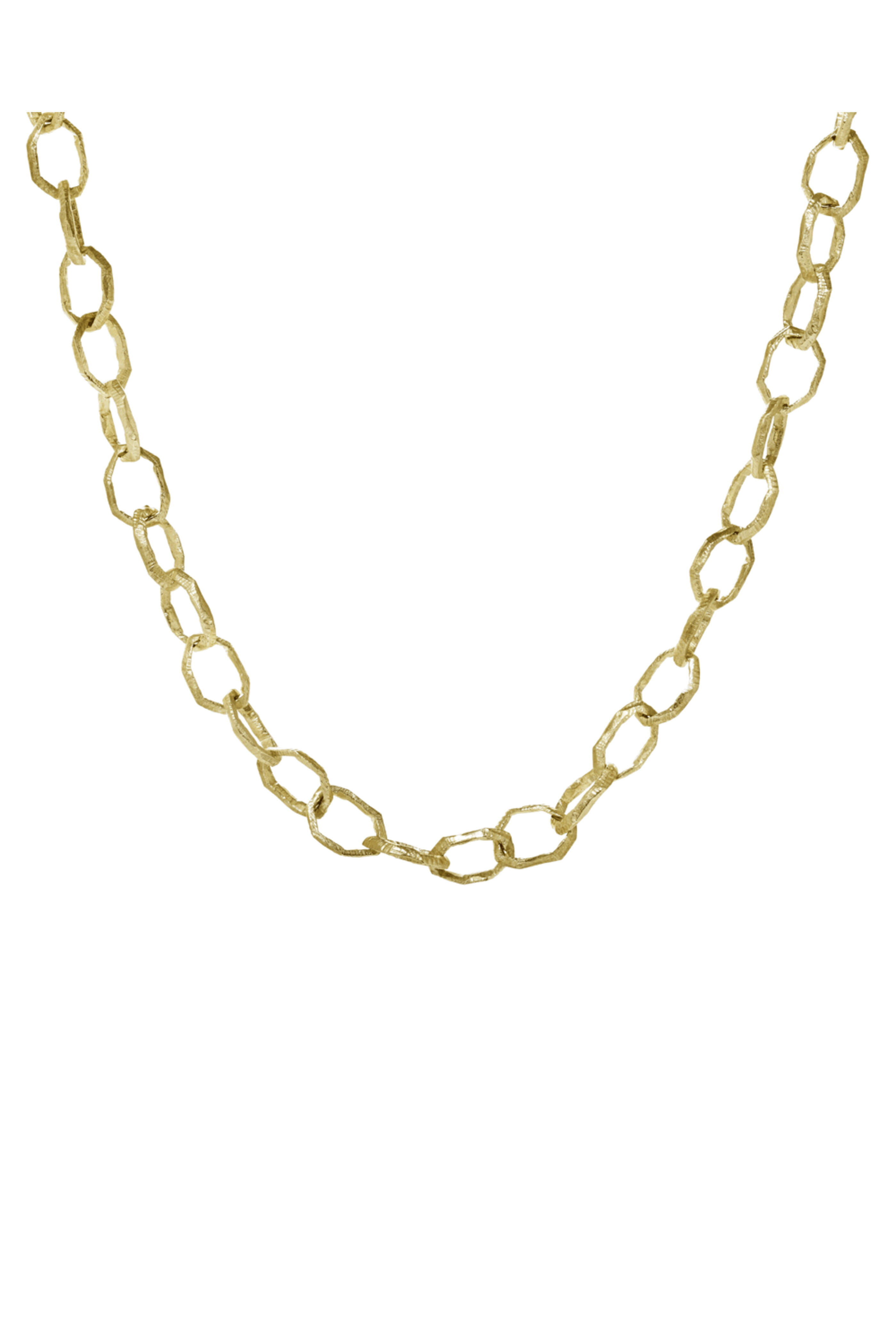 - Page Sargisson Hand Carved Gold Small Link Necklace 18k yellow gold 18 long Individual link: 1.6mm wide Latch clasp Handmade in New York