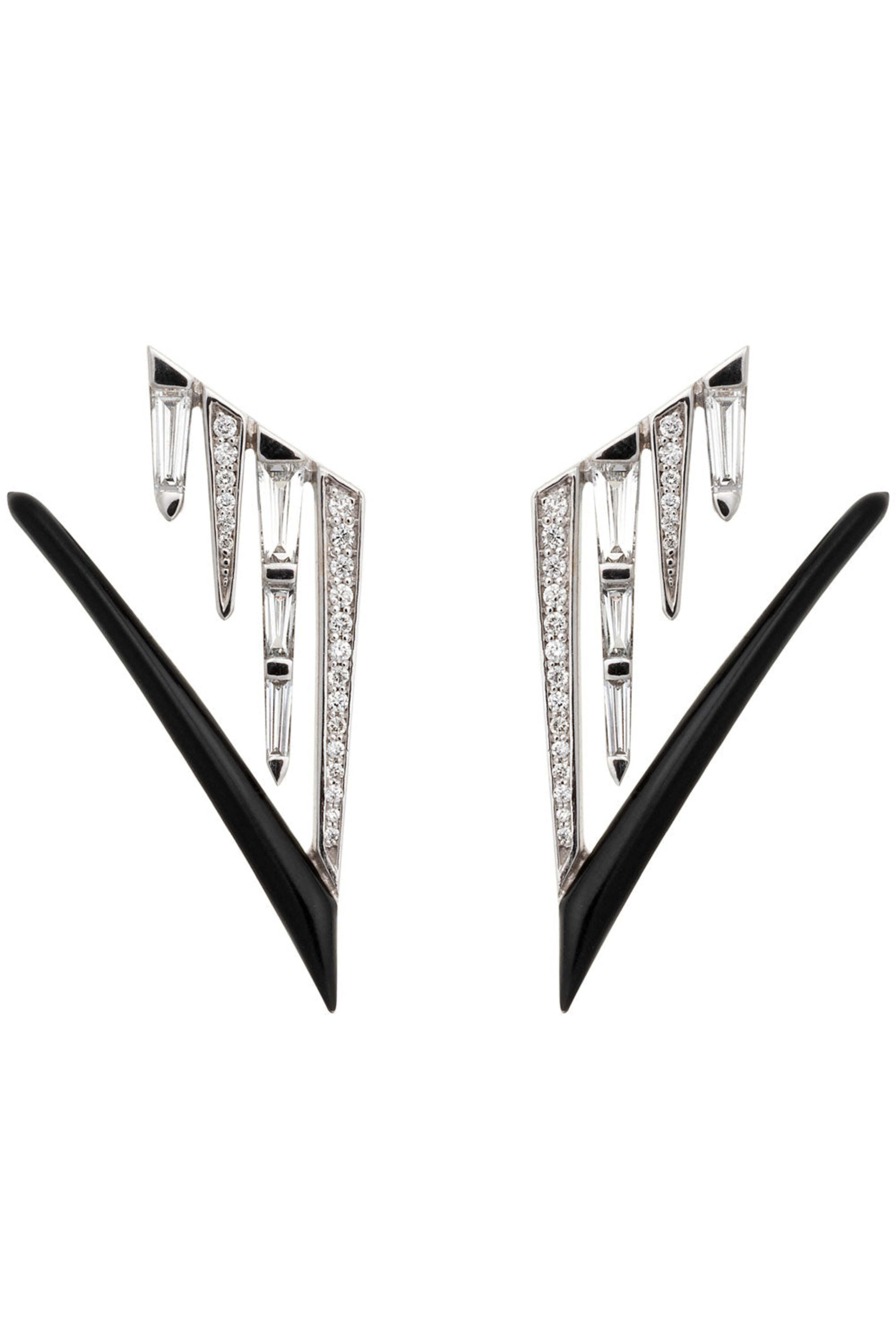 18k white gold. Black enamel. 0.72 ct. white diamonds. Fringe design. Geometric style. Post backs. Oui Collection.