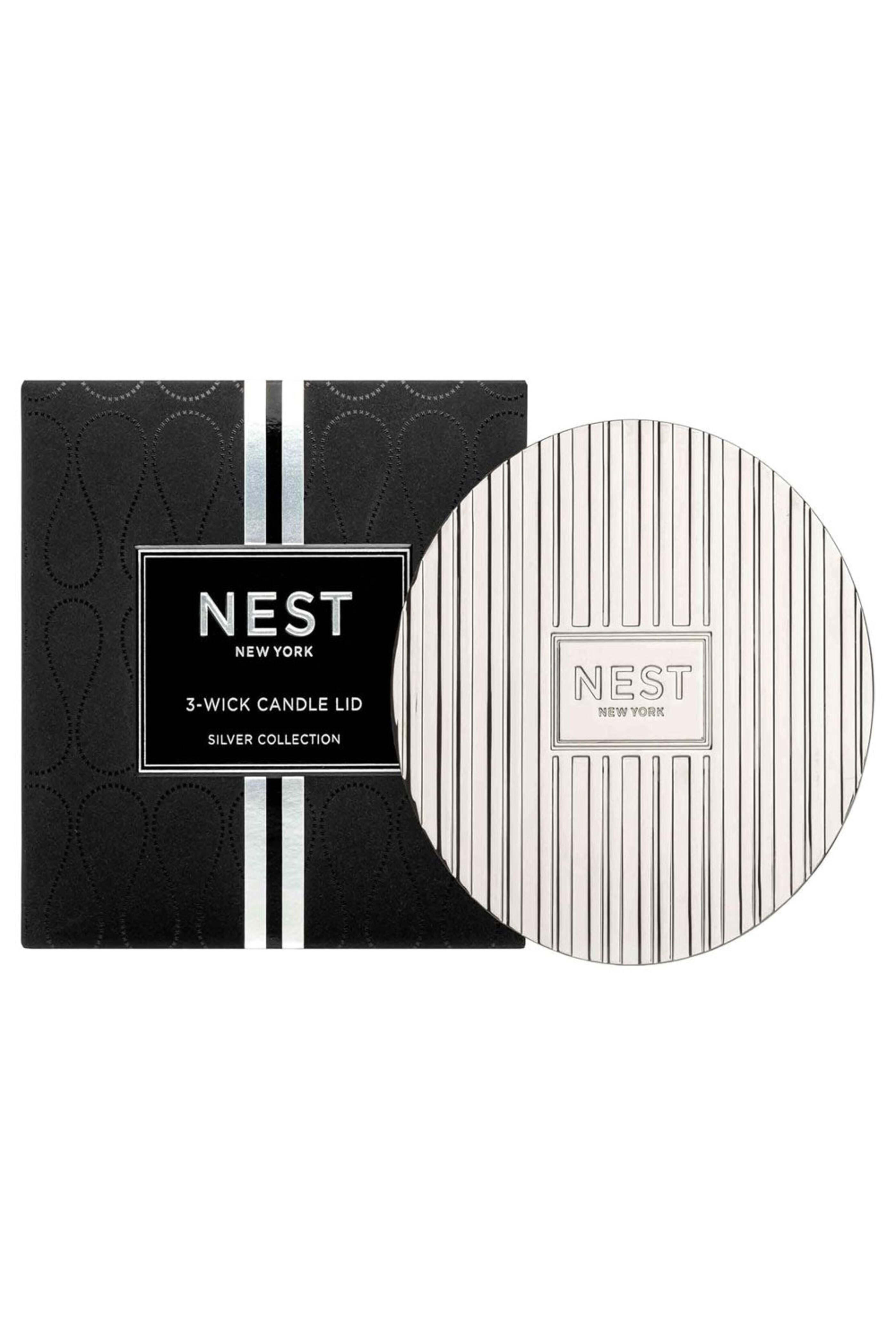 Nest Silver 3-Wick Candle Lid. Preserve the fragrance of your candle and protect the wax surface from dust. When the candle is in use, the lid can be used as a base. Tarnish free.