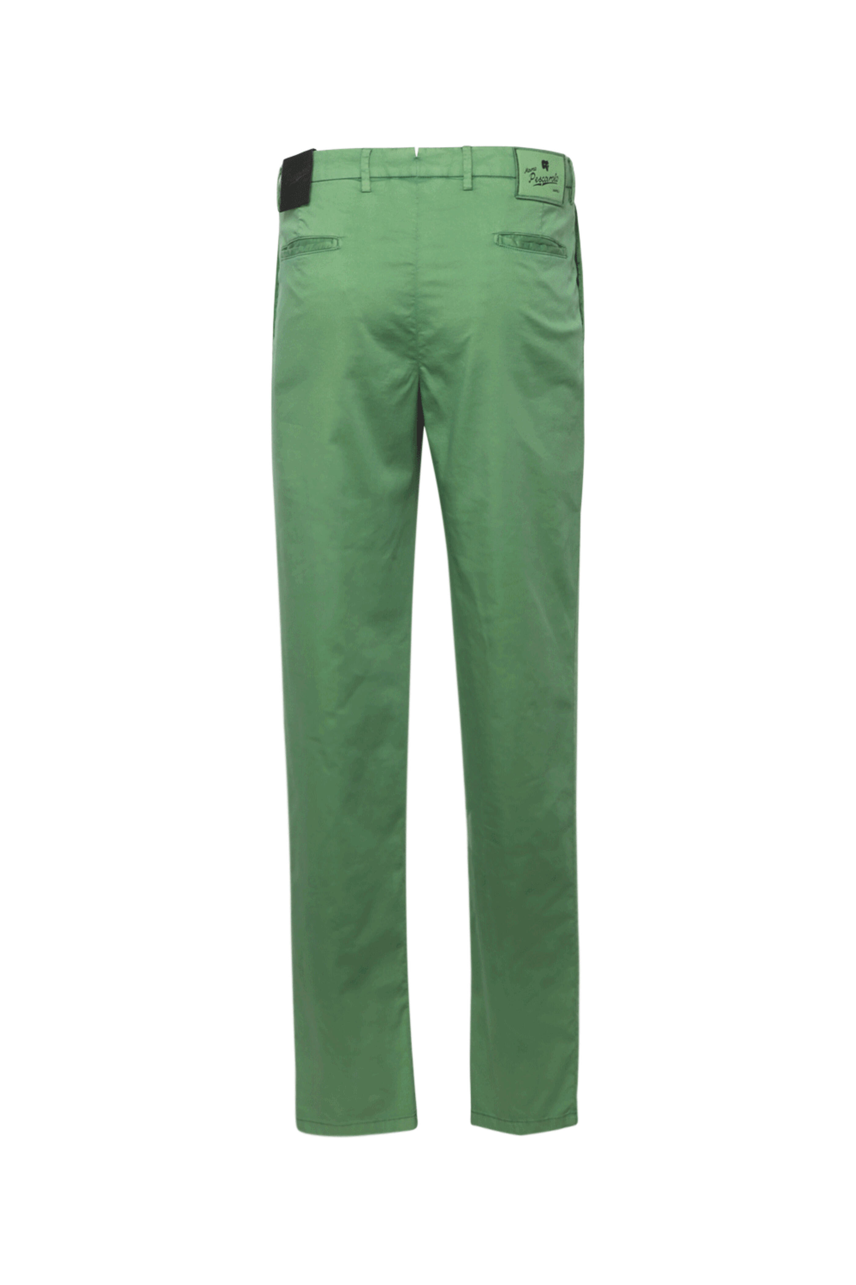 Marco Pescarolo Green Satin Dress Pant. Flat front pant. Zip fly. Double button closure. Logo button. Belt loops. Back vent. Back welt pockets. Lined. Made in Italy . 100% cotton lining. 85% cotton, 11% silk, 4% elastane.