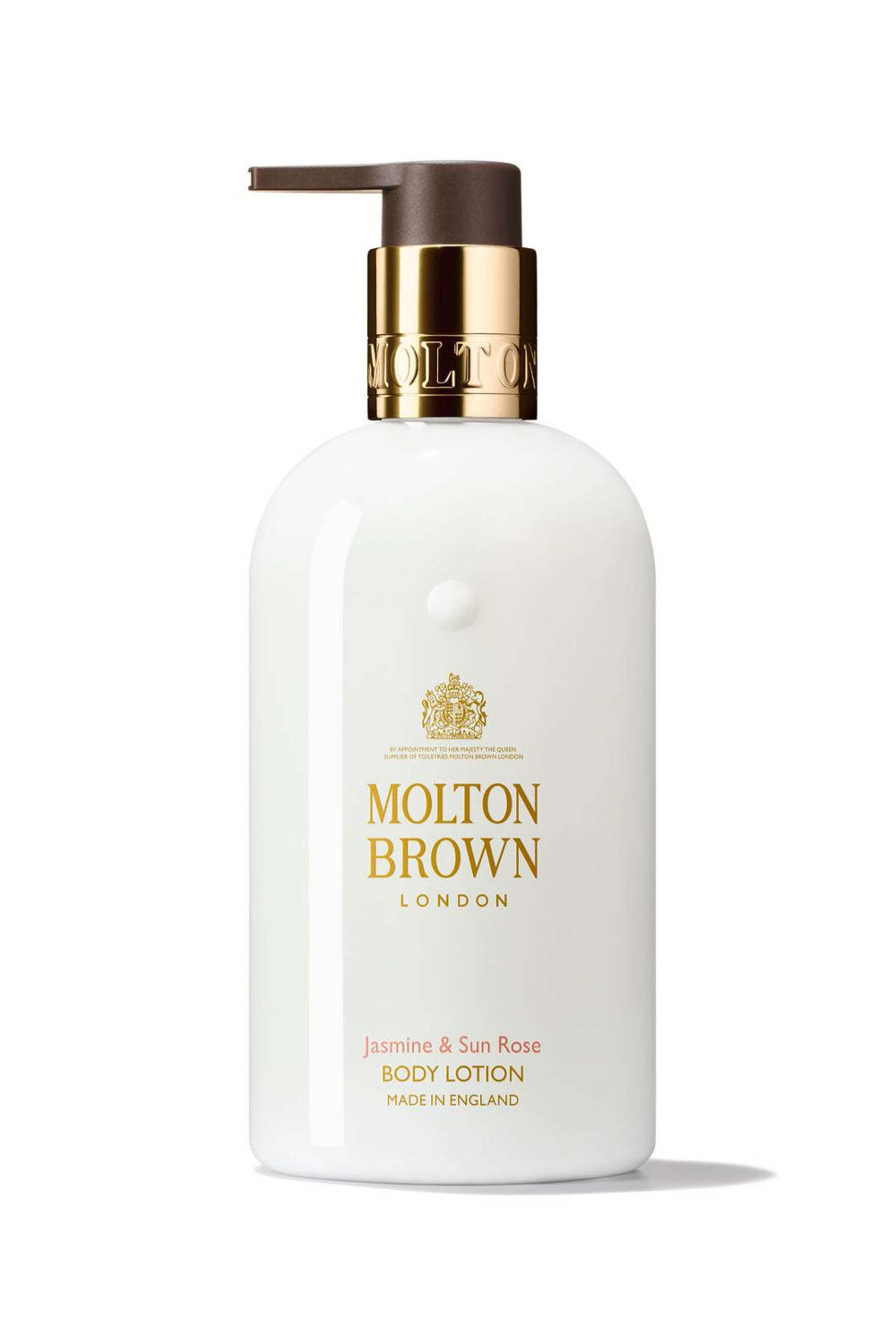 - Molton Brown Jasmine and Sun Rose Body Lotion Top notes: raspberry~ bergamot and peach Heart notes: jasmine~ osmanthus and rose Base notes: labdanum~ patchouli and musk 10 fl oz Made in England Paraben-free~ cruelty-free and vegan