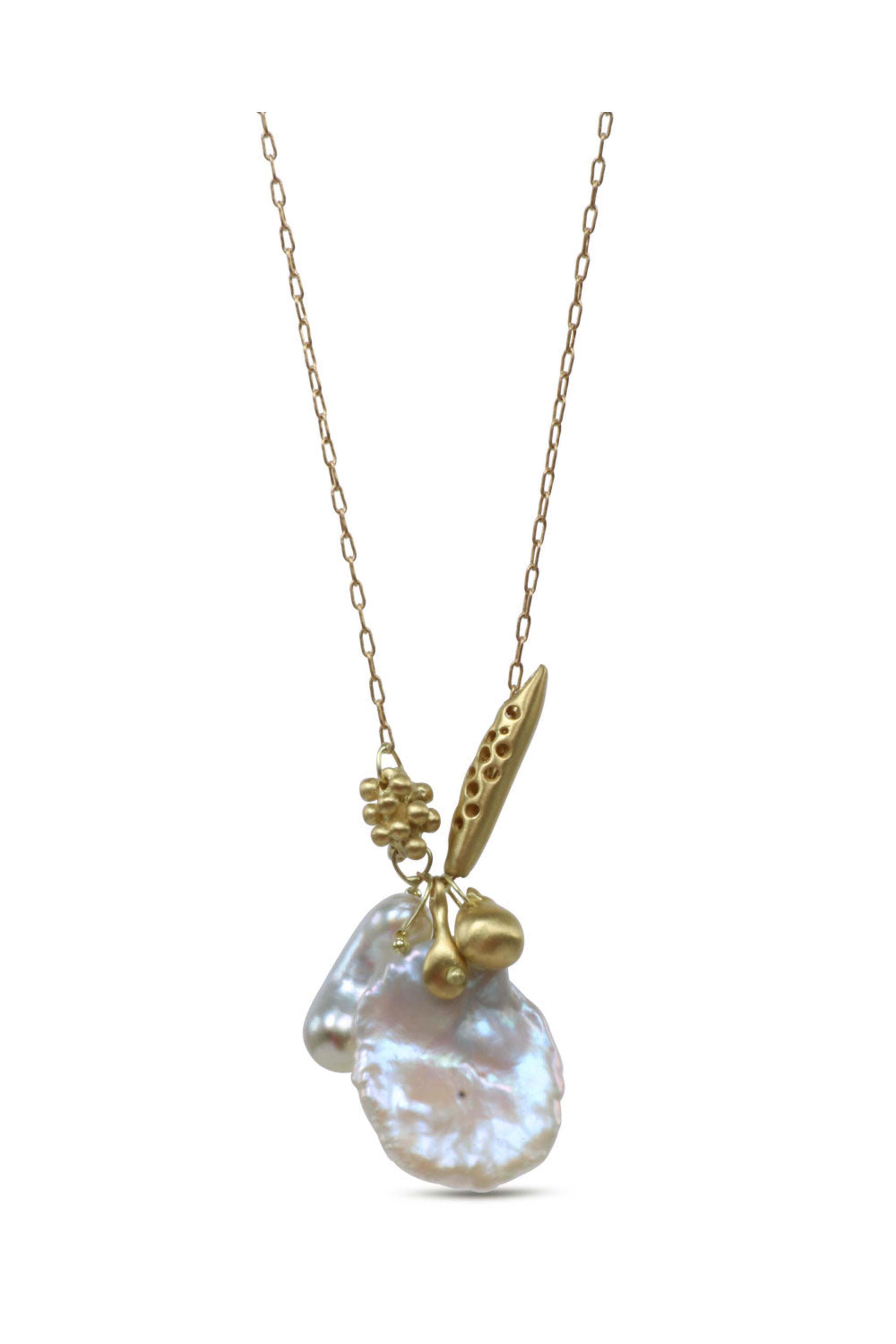 Ten Thousand Things Organic Beads Charm Necklace. 18k gold. Keshi pearl. Gold raspberry charm. Cast coral tube. Link chain. 18 L. Shepards hook clasps. Handmade in New York.
