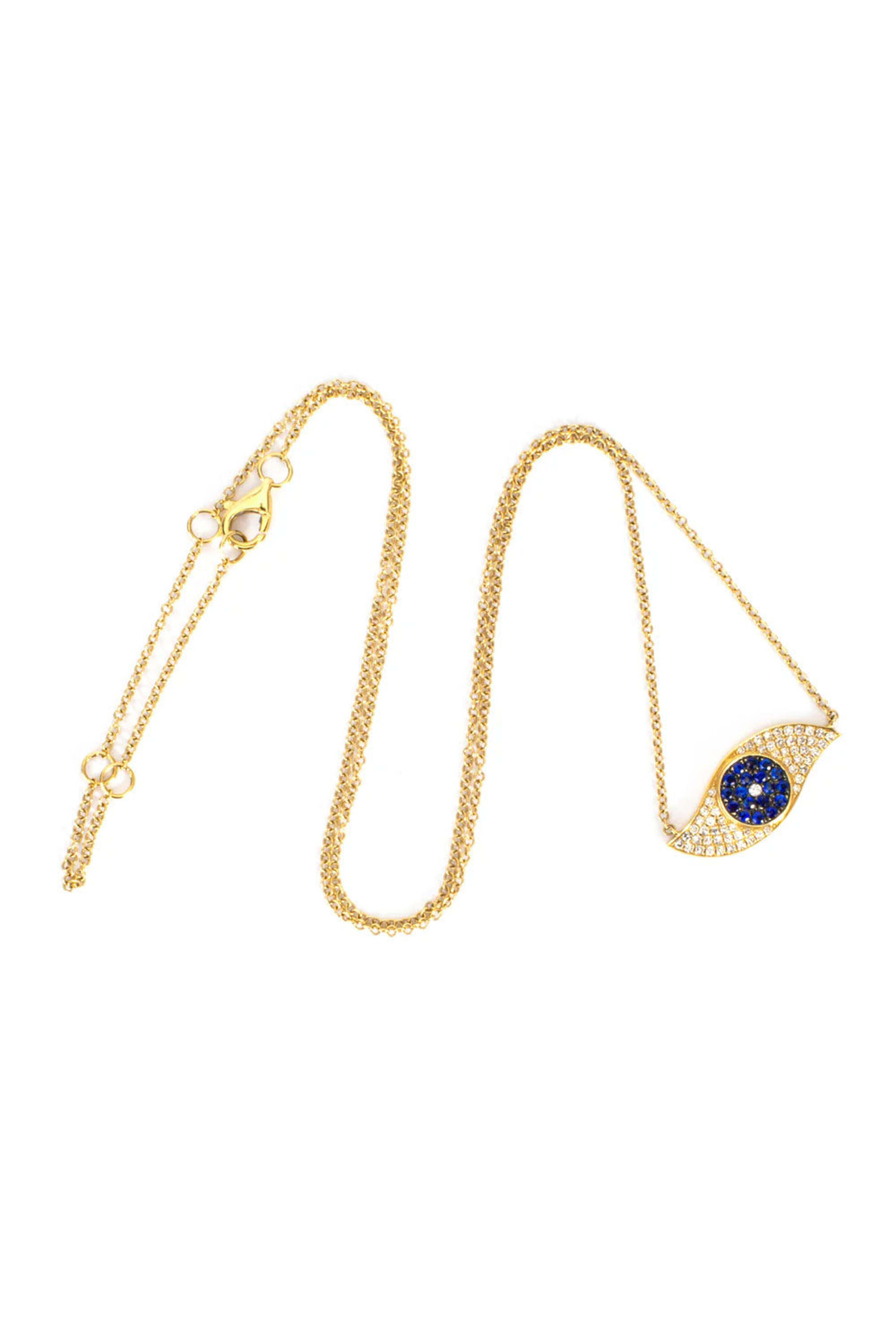 Evil Eye Necklace. 18k gold. Diamond .17 total carat weight. Blue sapphire evil eye design. Lobster claw closure.