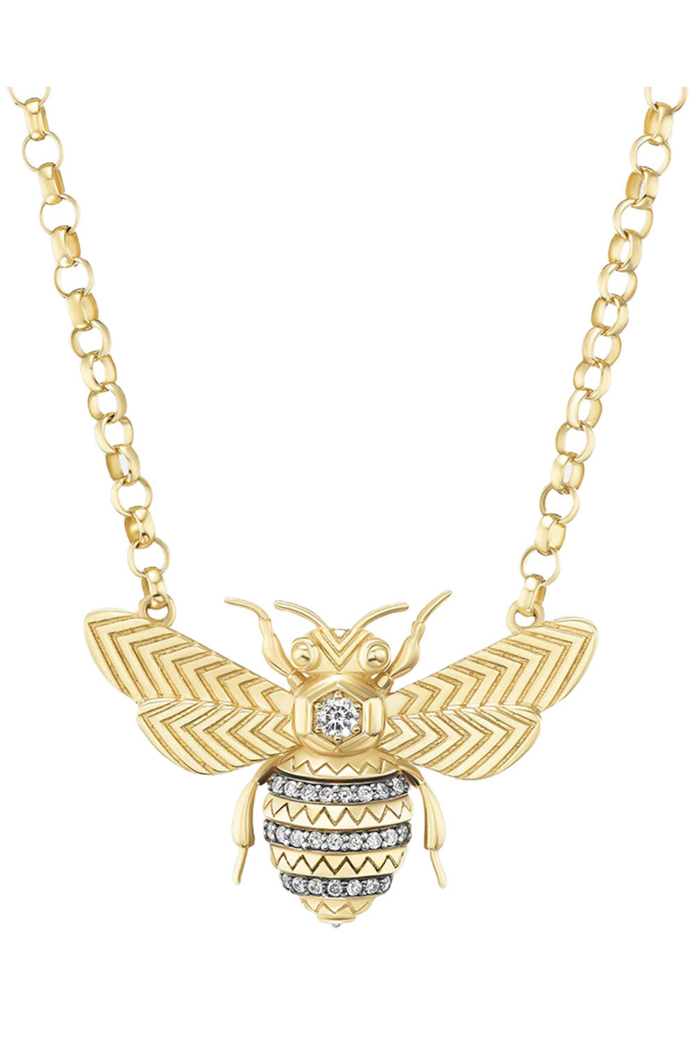 Harwell Godfrey Mini Bee Pendant Necklace. 18k yellow gold. Diamond 0.2 total carat weight. Rolo chain. All gold bee with diamond details. 0.78 H x 1.22 W. 16 18 adjustable chain. Lobster claw clasp.