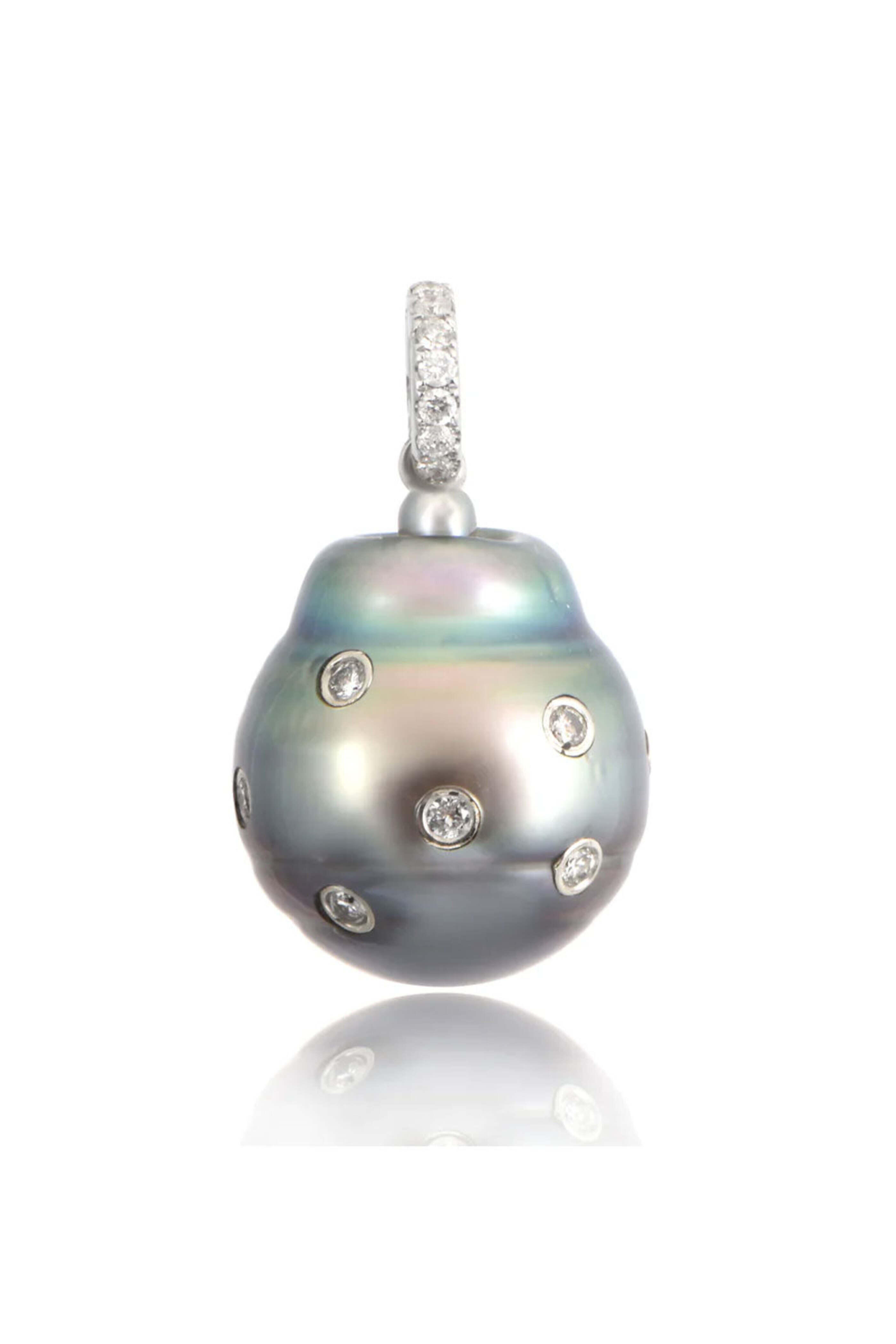 Diamond Tahitian Pearl Pendant. 18k white gold. Round diamond scatter design. Tahitian pearl. Pendant only.