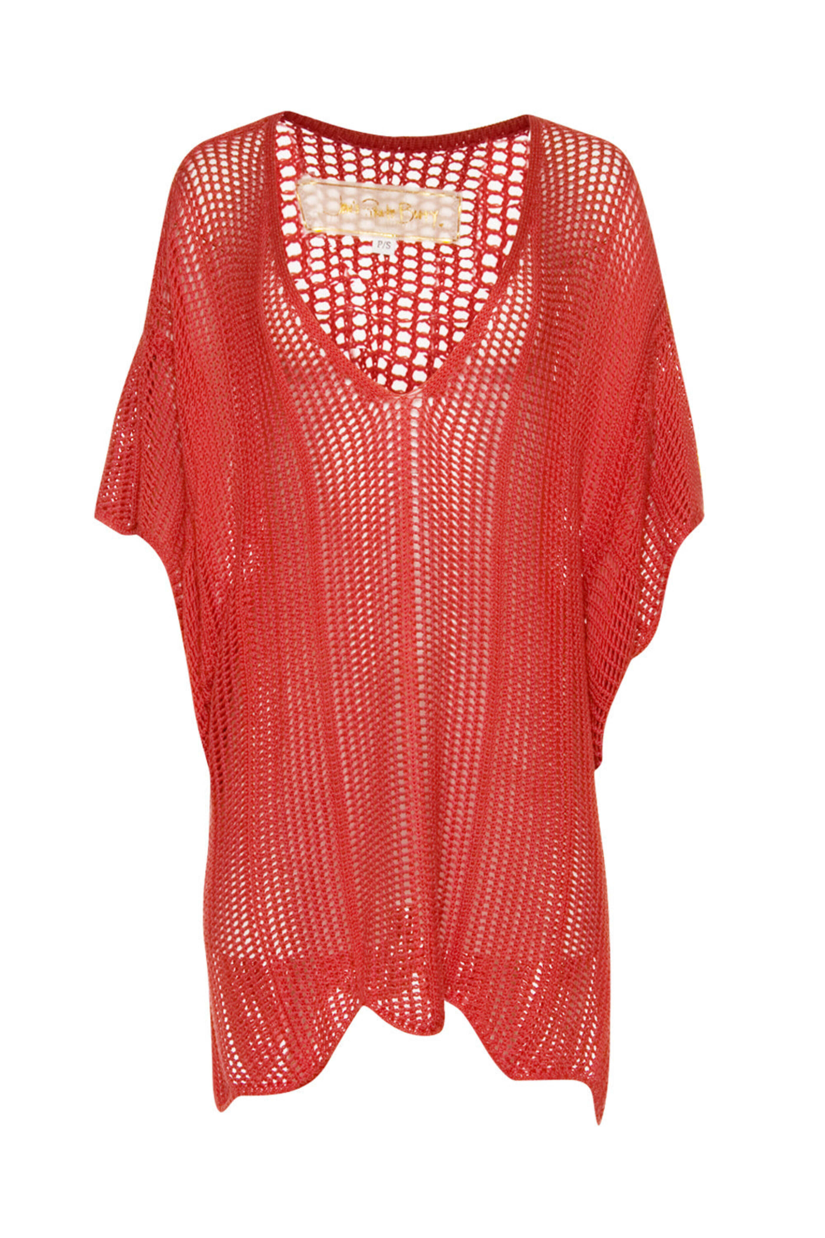 Jens Pirate Booty Coral Reef Knit Magic Island Tunic. V neck. Drop shoulder. Short sleeves. Large knit fabrication. Relaxed fit. Tunic length. Unlined. 60% viscose, 40% cotton.