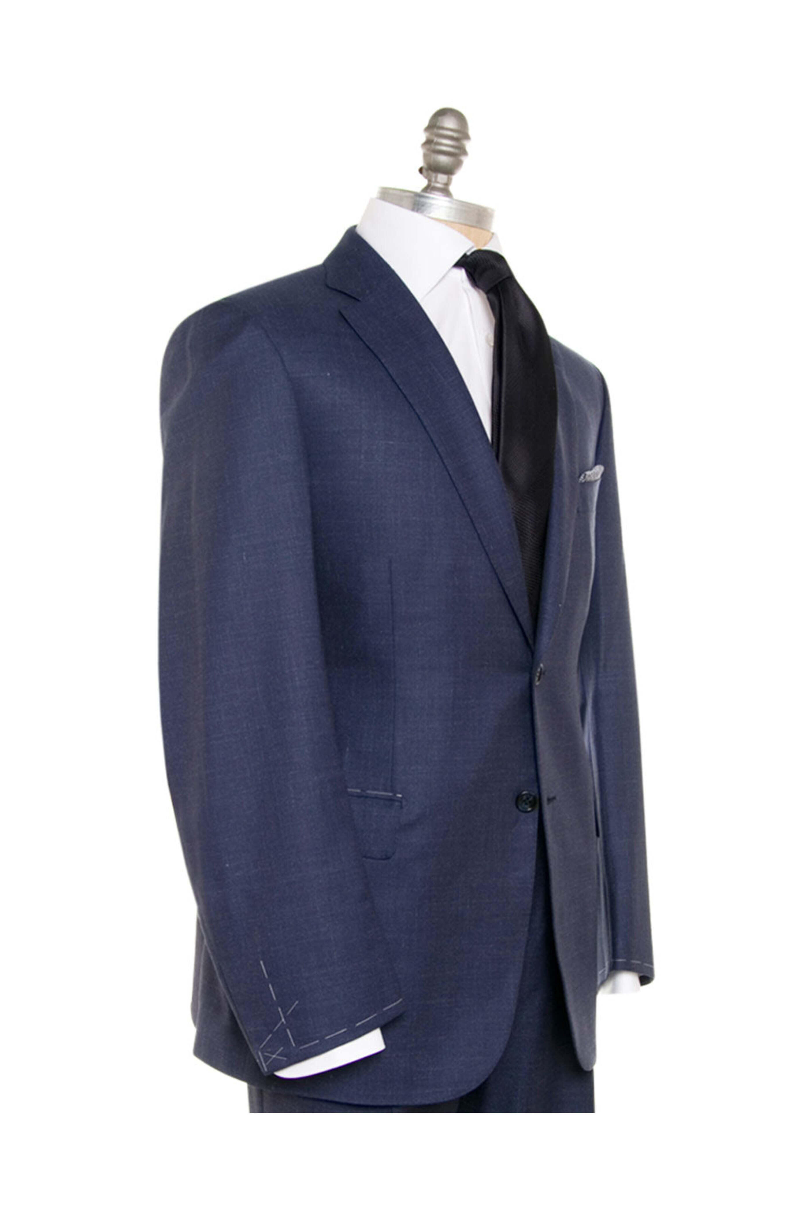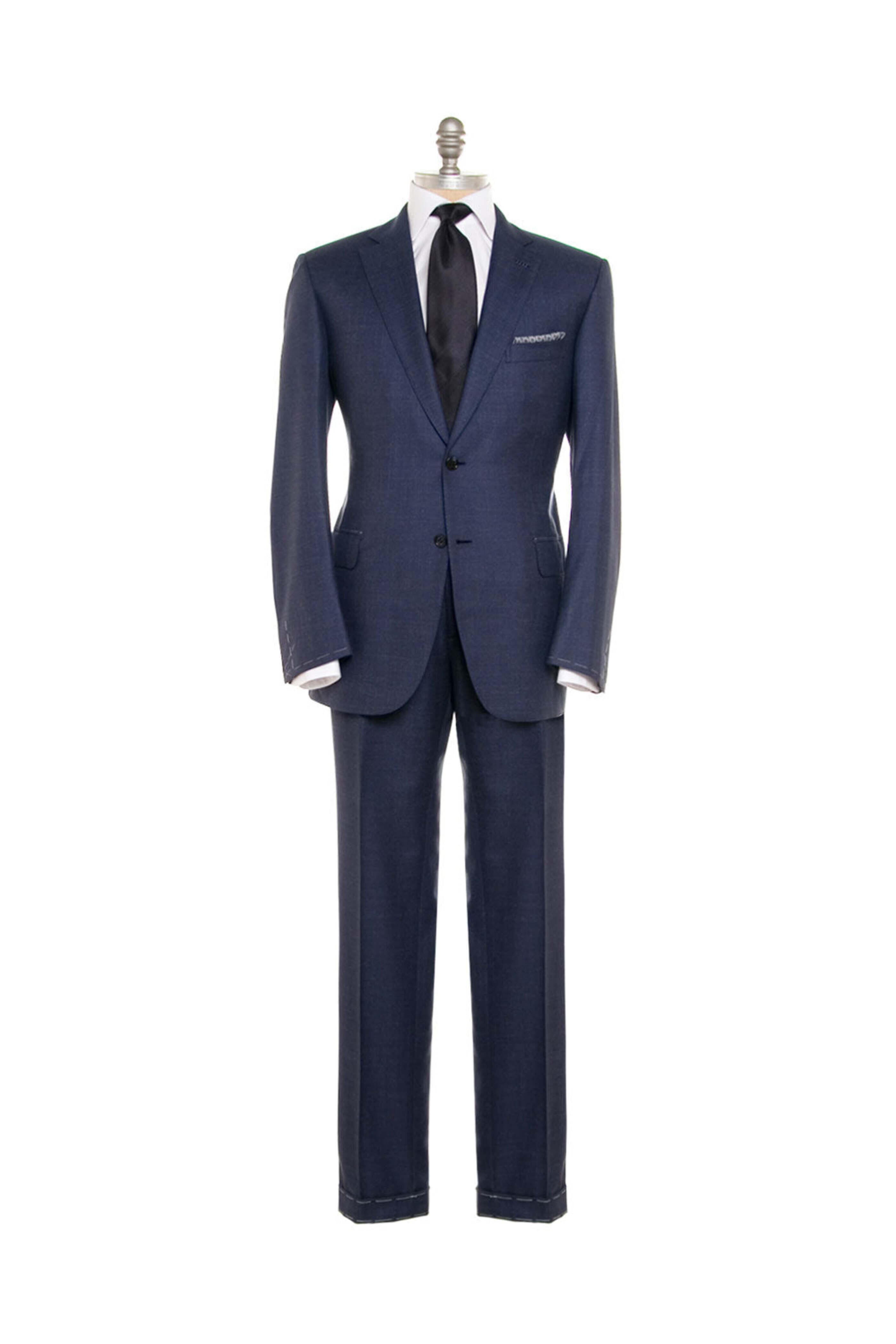 Brioni Ink Blue Melange Suit. Notch lapels. Two button jacket. Front left chest pocket. Flap waist pockets. Double back vents. Drop: 6. Flat front pant. Zip fly. Two button and hook closure. Side waist pockets. Single button back welt pockets. 8 hem opening. 11 rise. Pick stitch detailing. Cupro lining. Made in Italy. 75% wool, 25% silk and 5% linen.