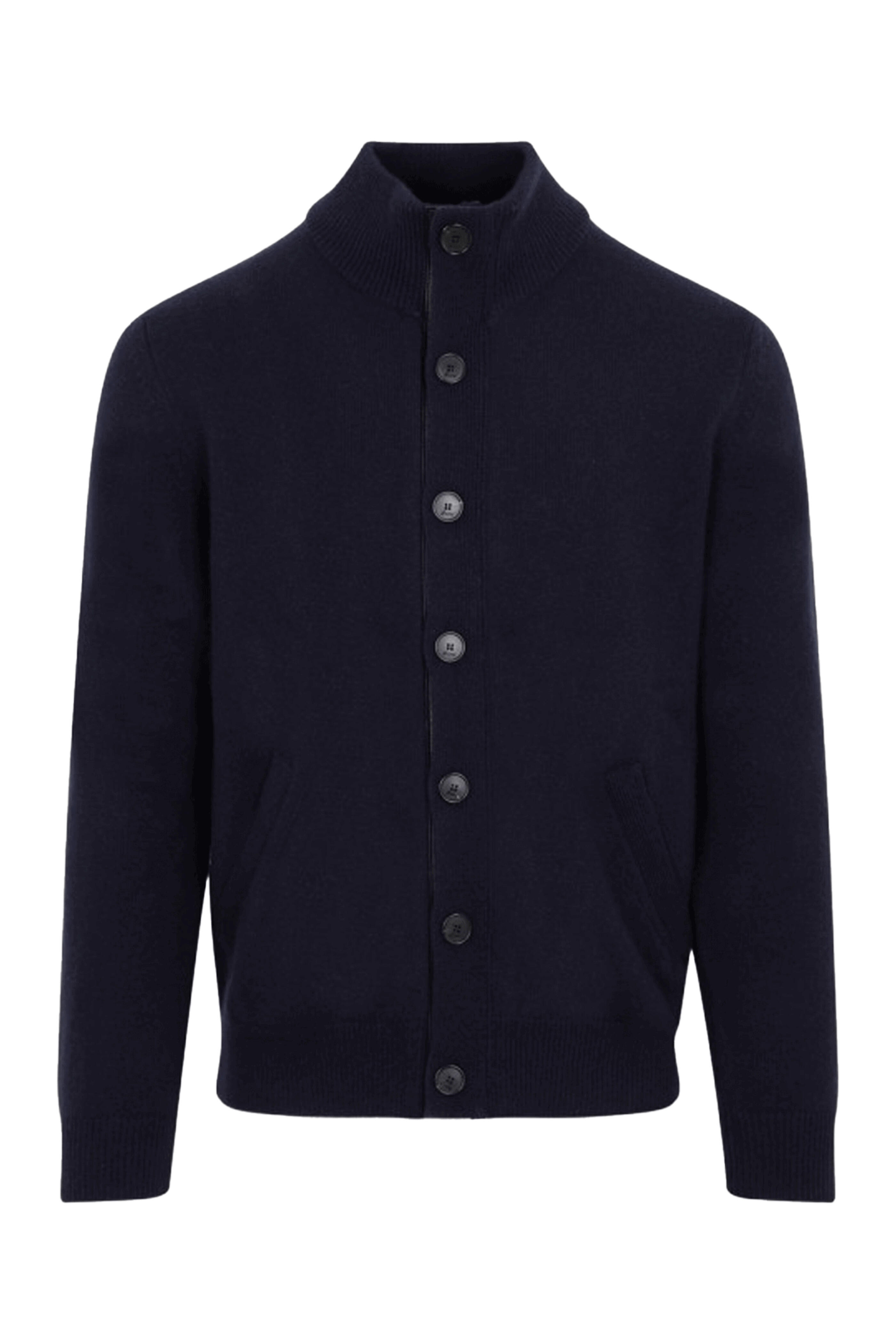 Brioni Navy Full Zip Bluson Cashmere Sweater. Stand collar. Long sleeves. Button down closure. Concealed two-way zip closure. Waist welt pockets. Tonal stitching. Ribbed trims. Straight hem. Made in Italy. 100% cashmere.