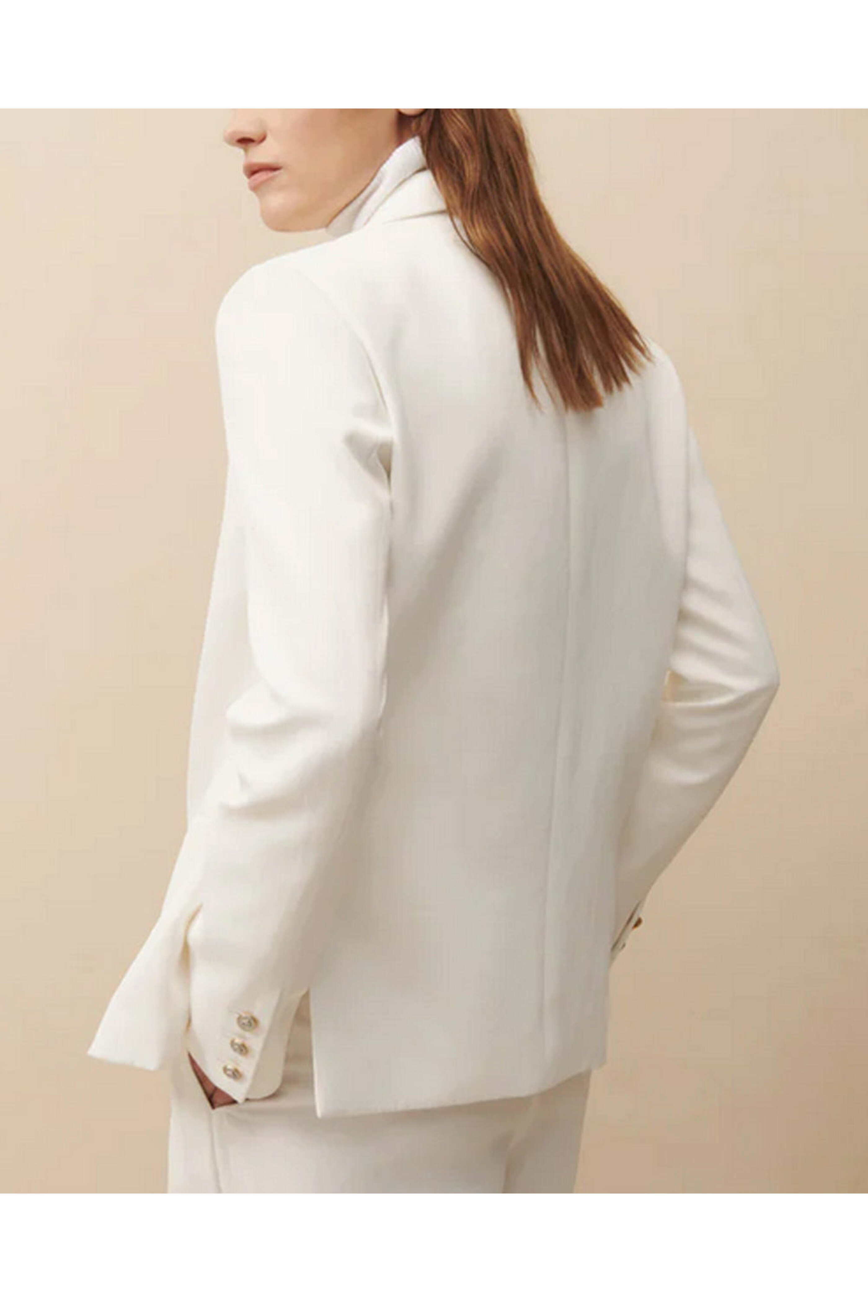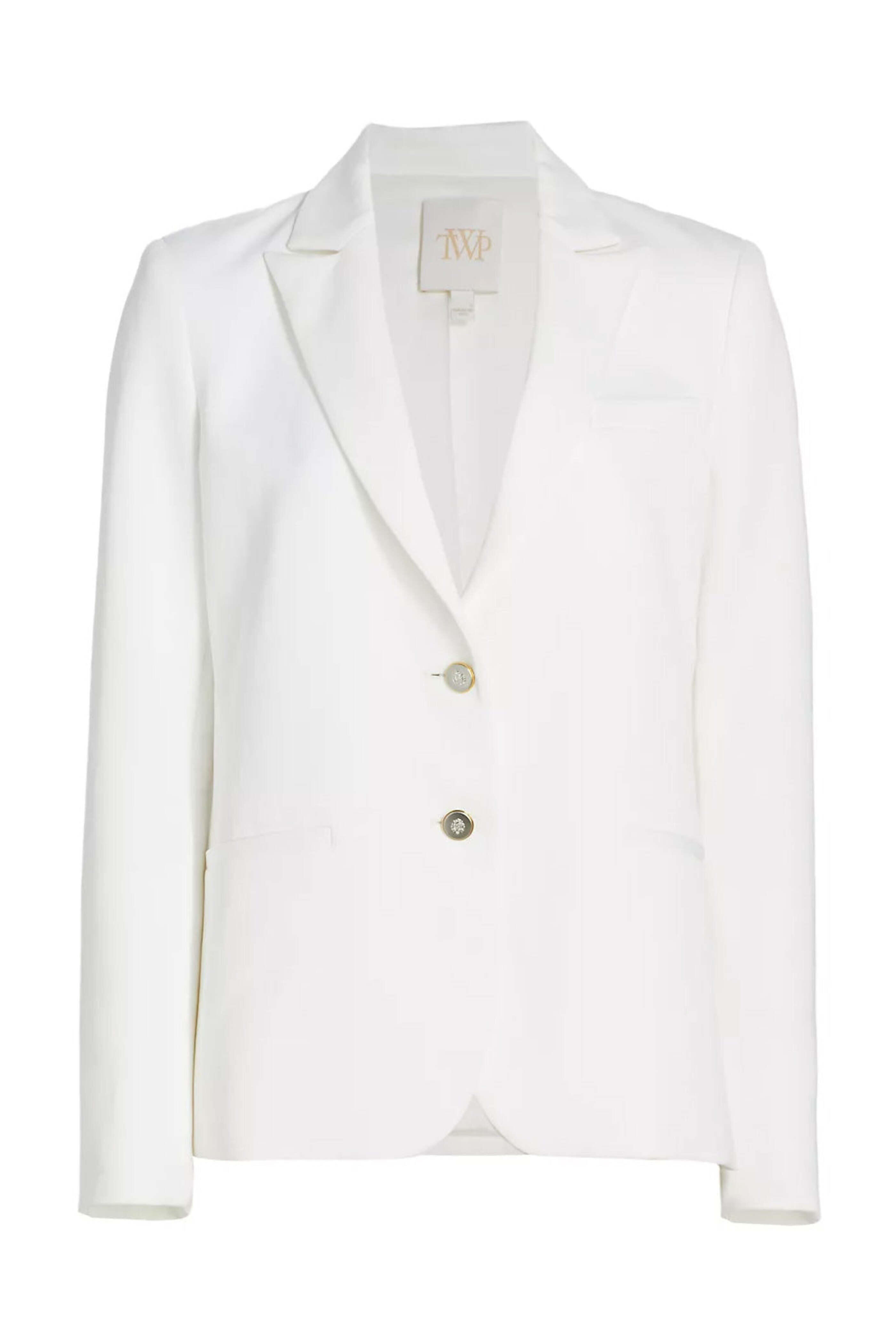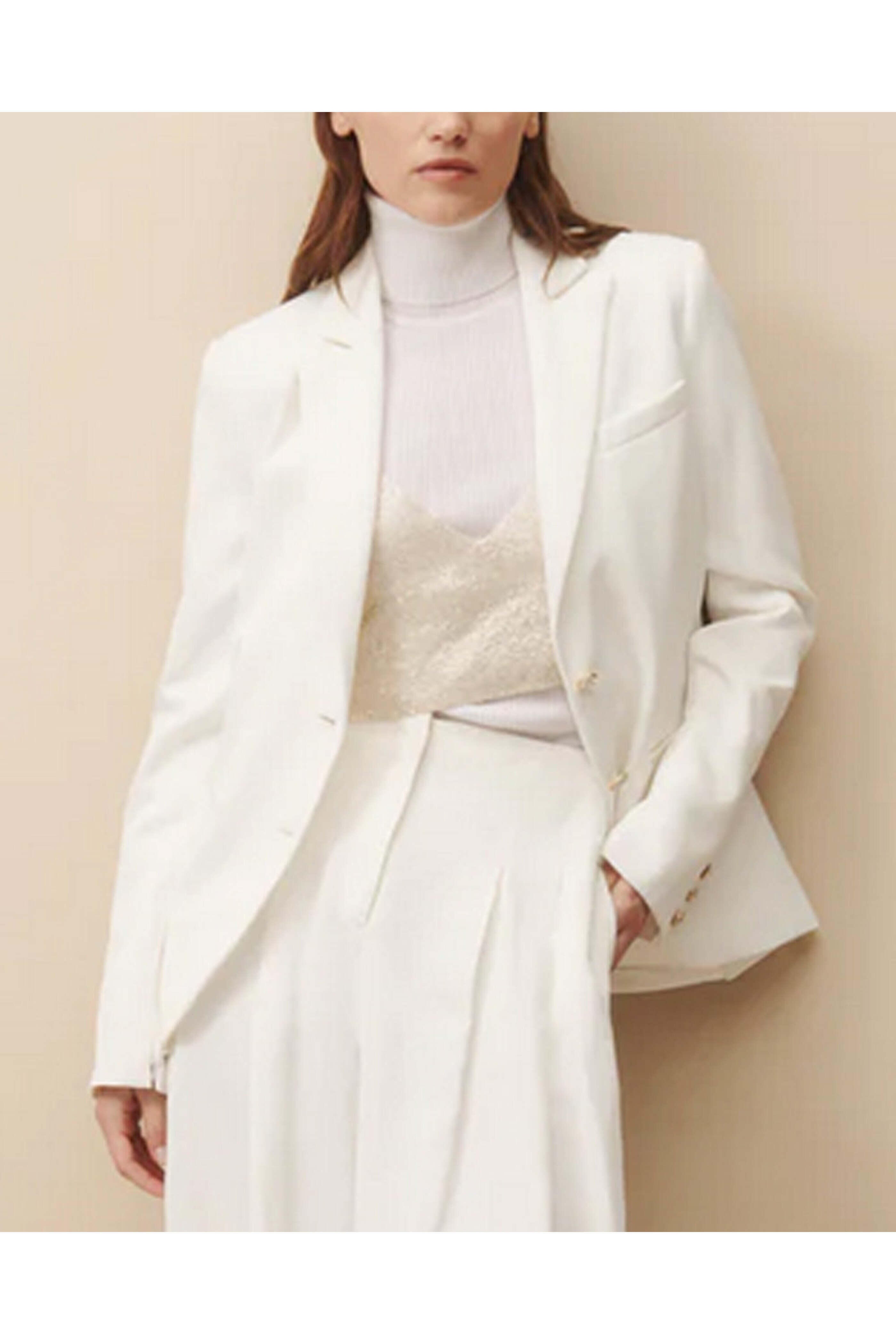 TWP White Zip Cuff Boyfriend Blazer. Notch lapel. Logn sleeves; concealed zip cuffs with button detail. Single breasted front button closure. Bitonal statement buttons throughout. Relaxed fit. 76% viscose, 24% linen.