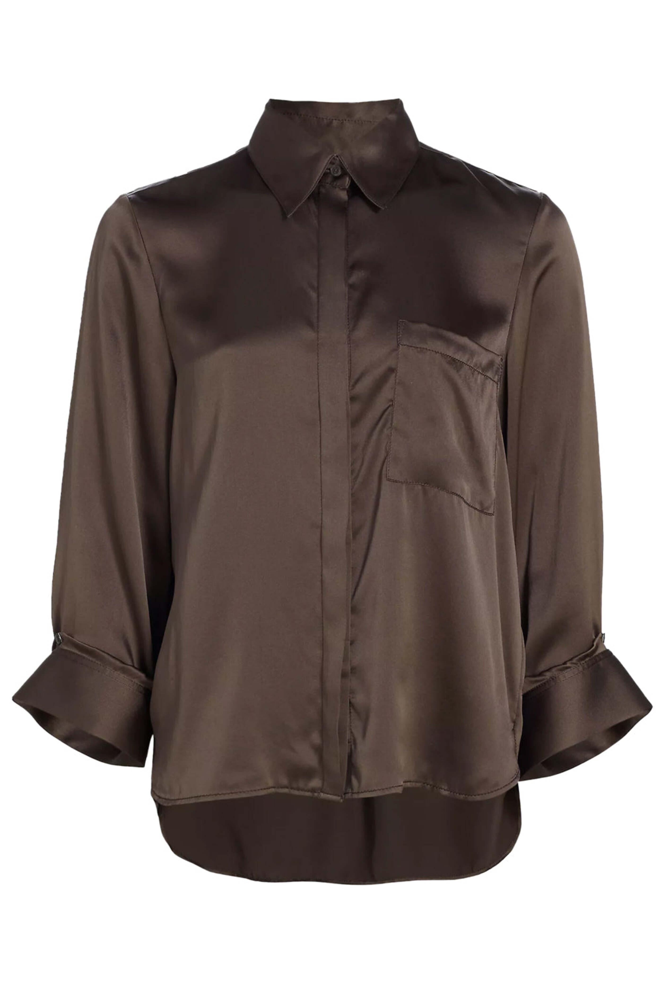 TWP Turkish Coffee Silk Boyfriend Shirt. Collar. Bracelet length sleeves; button cuffs. Concealed button down front closure. Single chest patch pocket. Relaxed fit. High low hem. 100% silk.