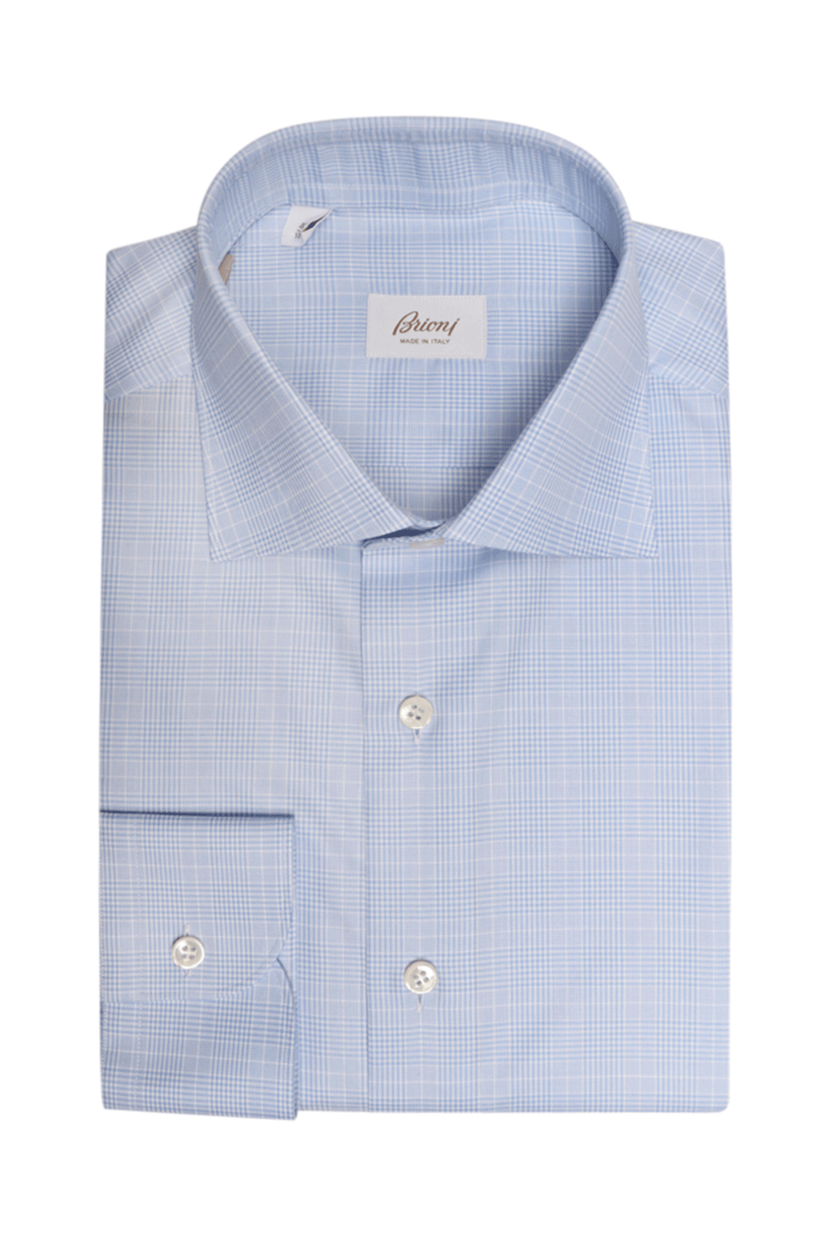 Brioni Pale Blue and White Plaid Sportshirt. Spread collar. Long sleeves. Single button barrel cuffs. Made in Italy. 100% cotton.
