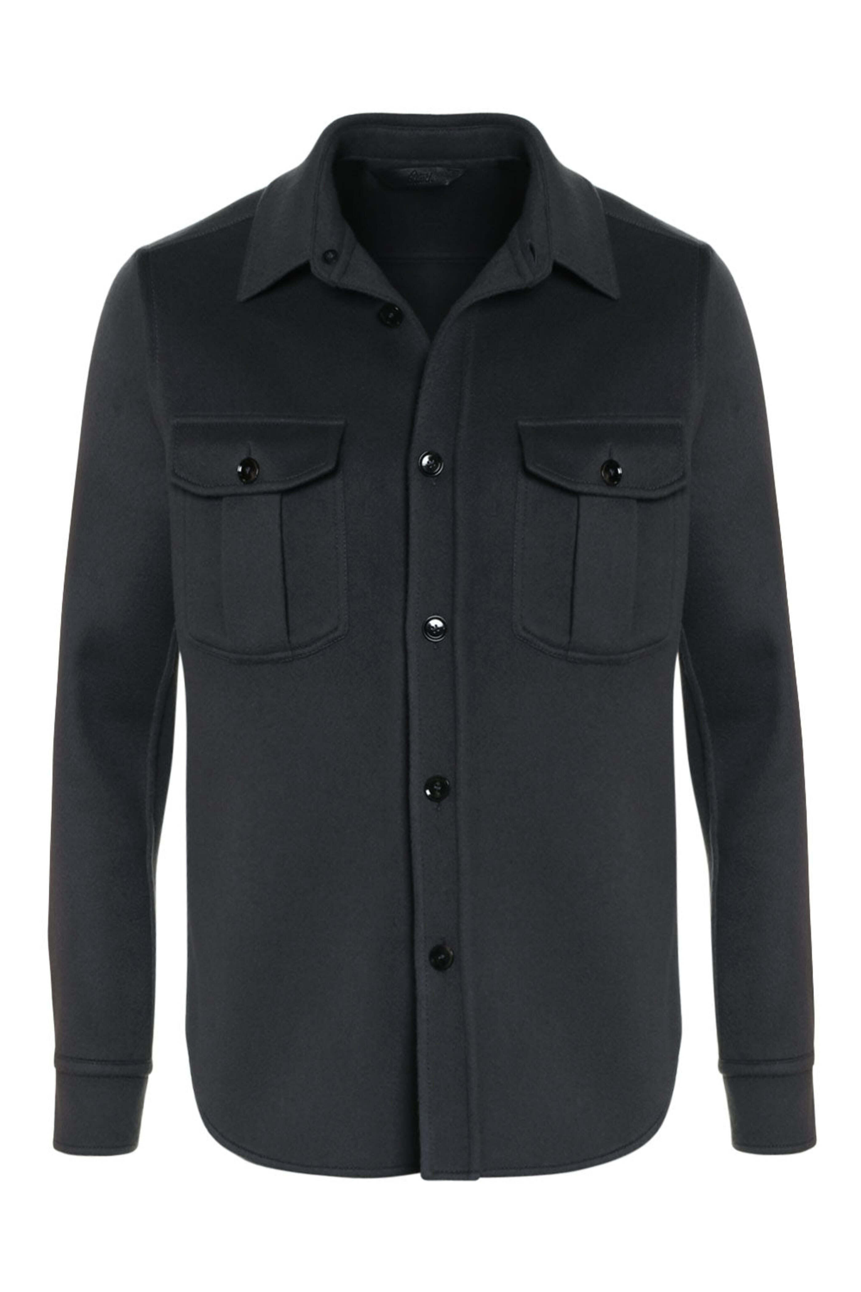 Brioni Petrol Green Wool Blend Heavyweight Overshirt. Spread collar. Button down front. Upper chest flap pockets with button closure. Long sleeves. Single button mitered cuffs. Rounded hem. Tonal stitching. Unlined. Made in Italy. 70% virgin wool 30% cashmere.