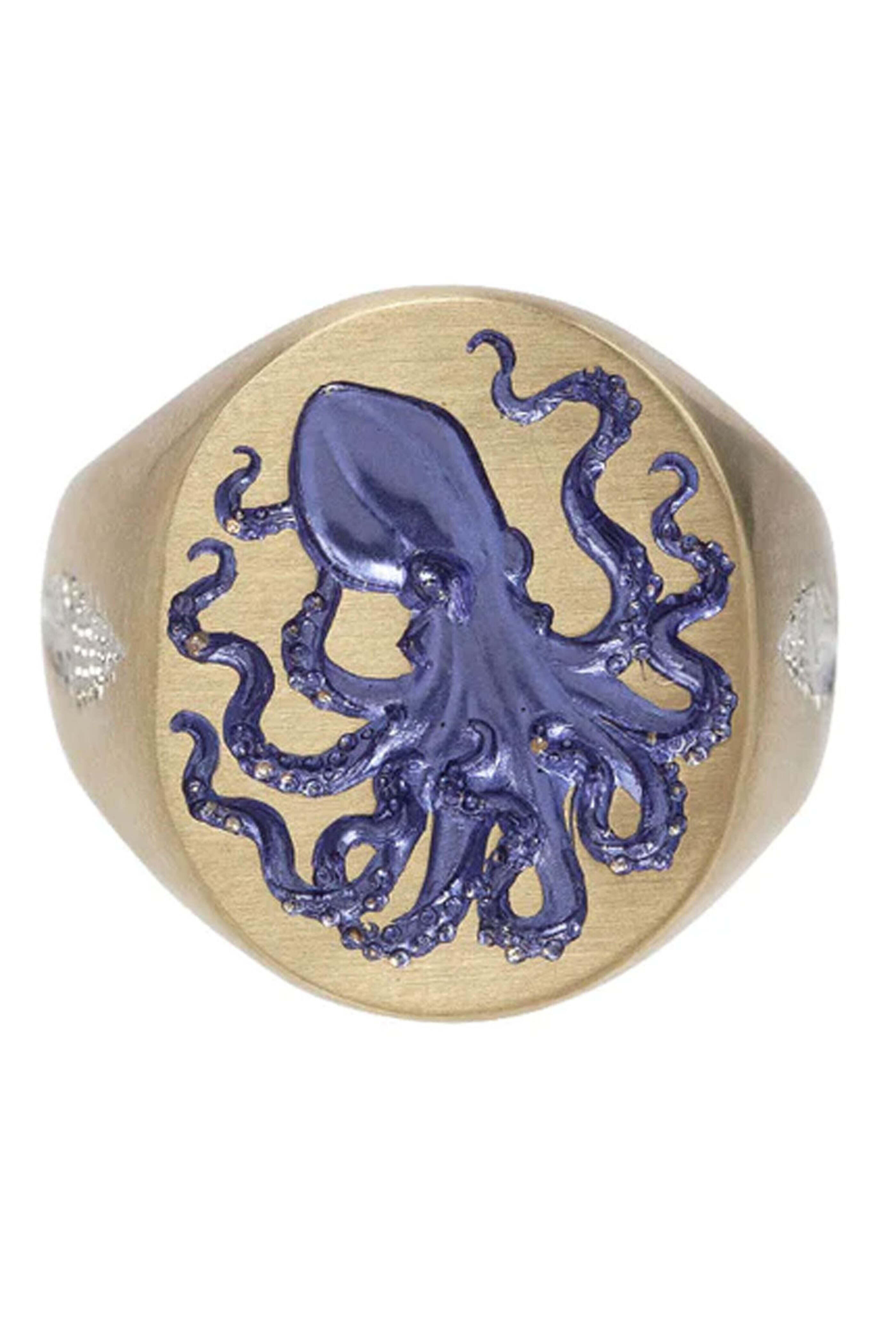 Castro Smith Different Minds Octopus Ring. 9k yellow gold. Engraved with an octopus on its front and two spiraling shells on either side. Edgy sea-inspired ring. 0.75 x 0.625. Ring size 7.5. Handmade in London.