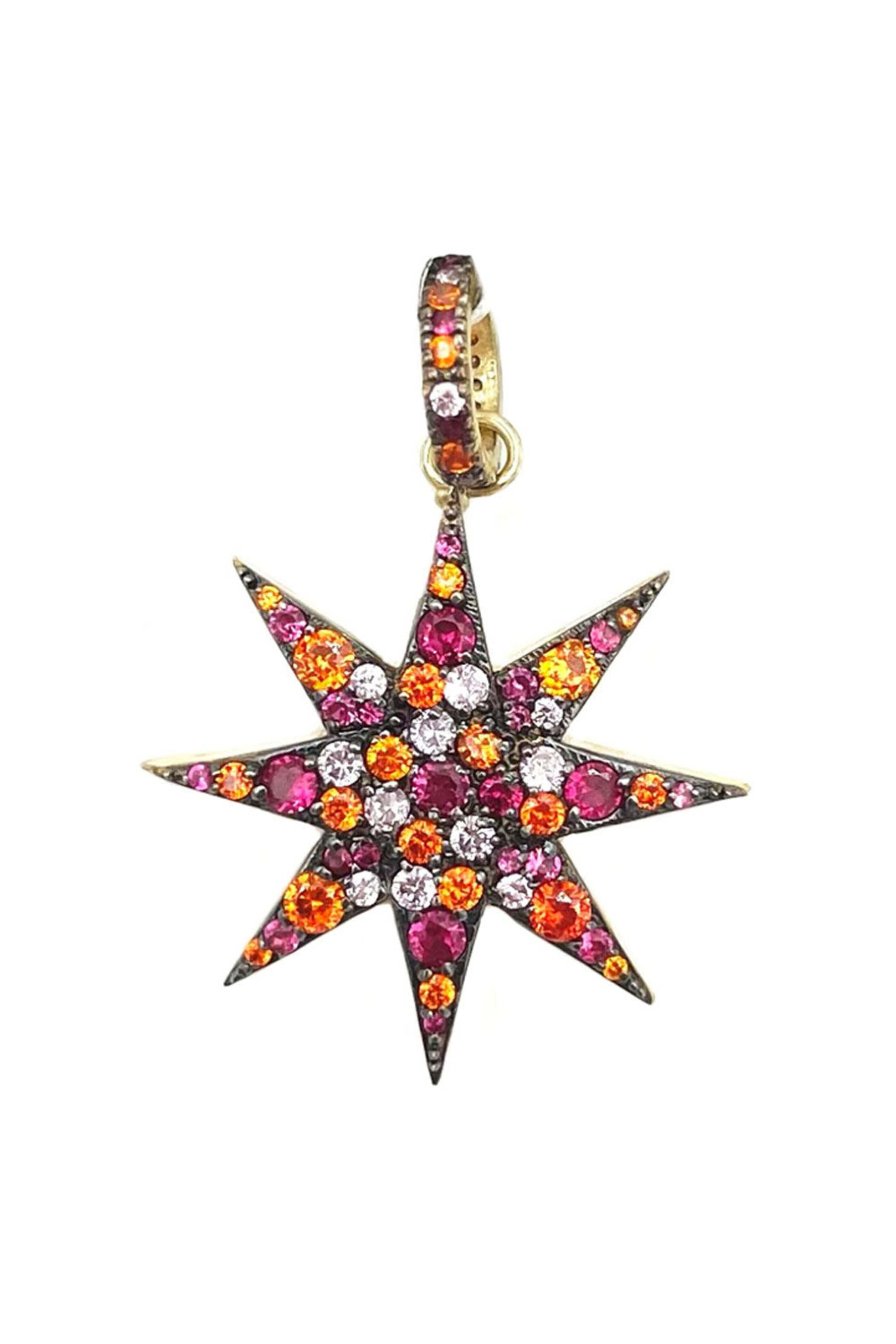 Royal Nomad Plated Gold Orange and Pink Sapphire Starburst Pendant. Plated gold. Orange sapphire. Pink sapphire. 1.5â H x 1.25â W. Slip bail closure.